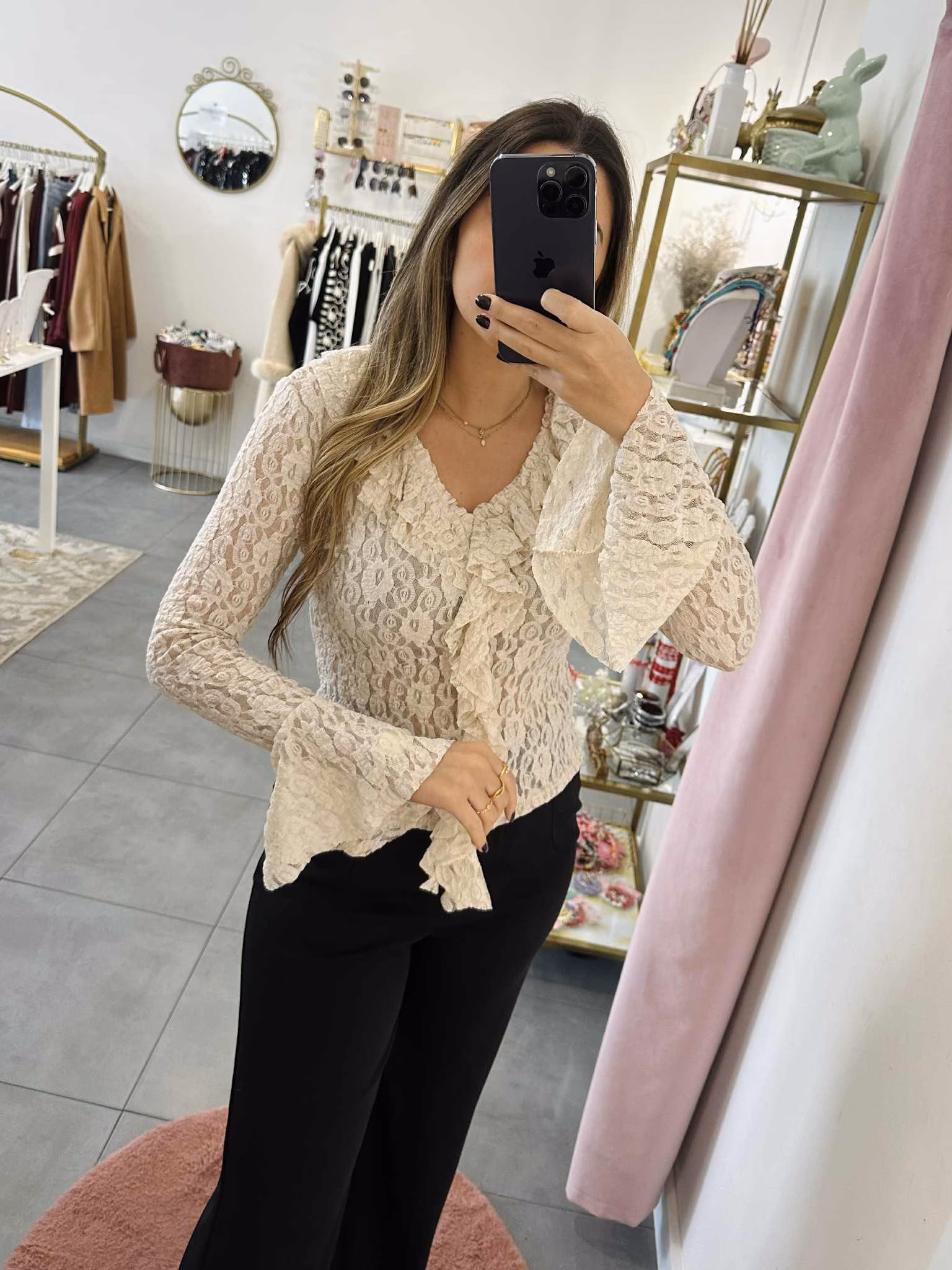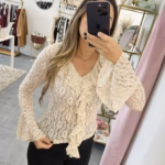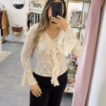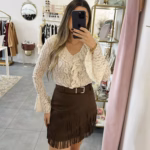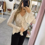 A modelo tem 1,73m e veste o tamanho M/L parte de cima e um 38/40 de parte de baixo.