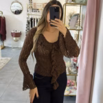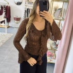 A modelo tem 1,73m e veste o tamanho M/L parte de cima e um 38/40 de parte de baixo.
