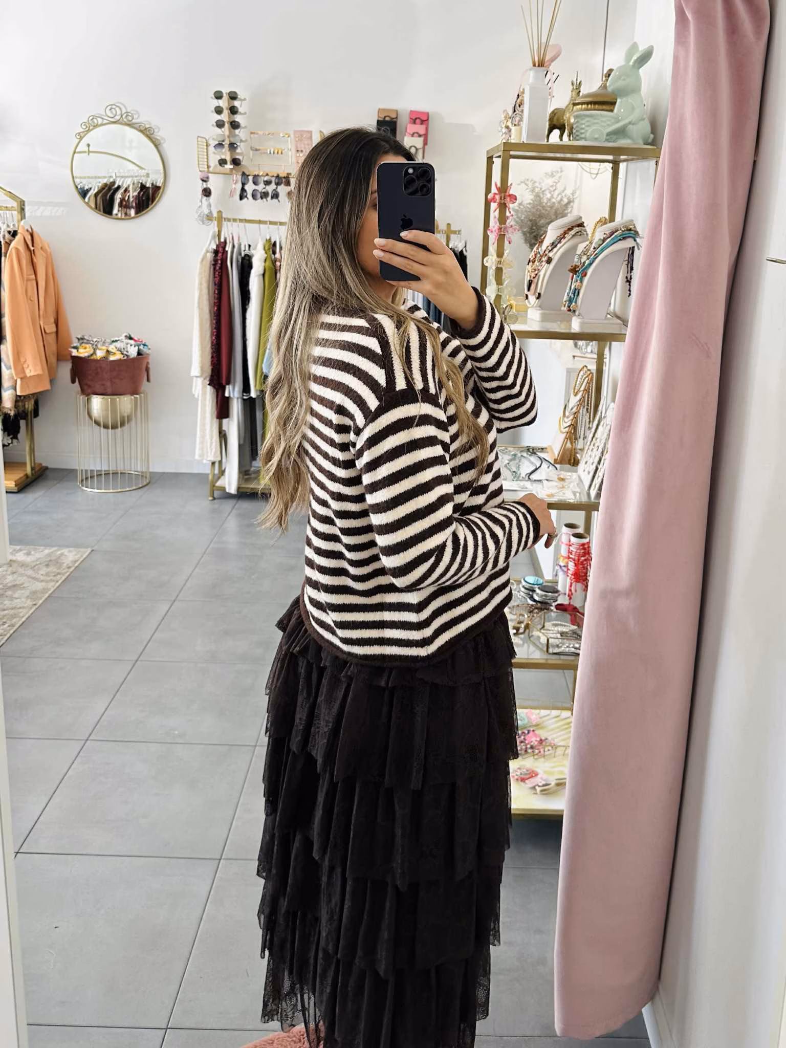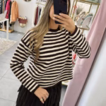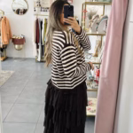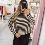 A modelo tem 1,73m e veste o tamanho M/L parte de cima e um 38/40 de parte de baixo.