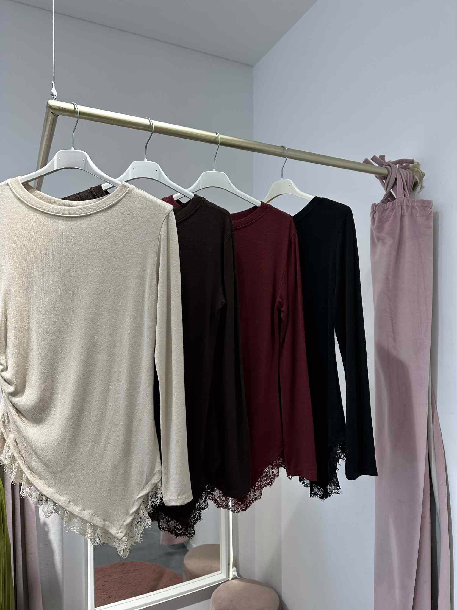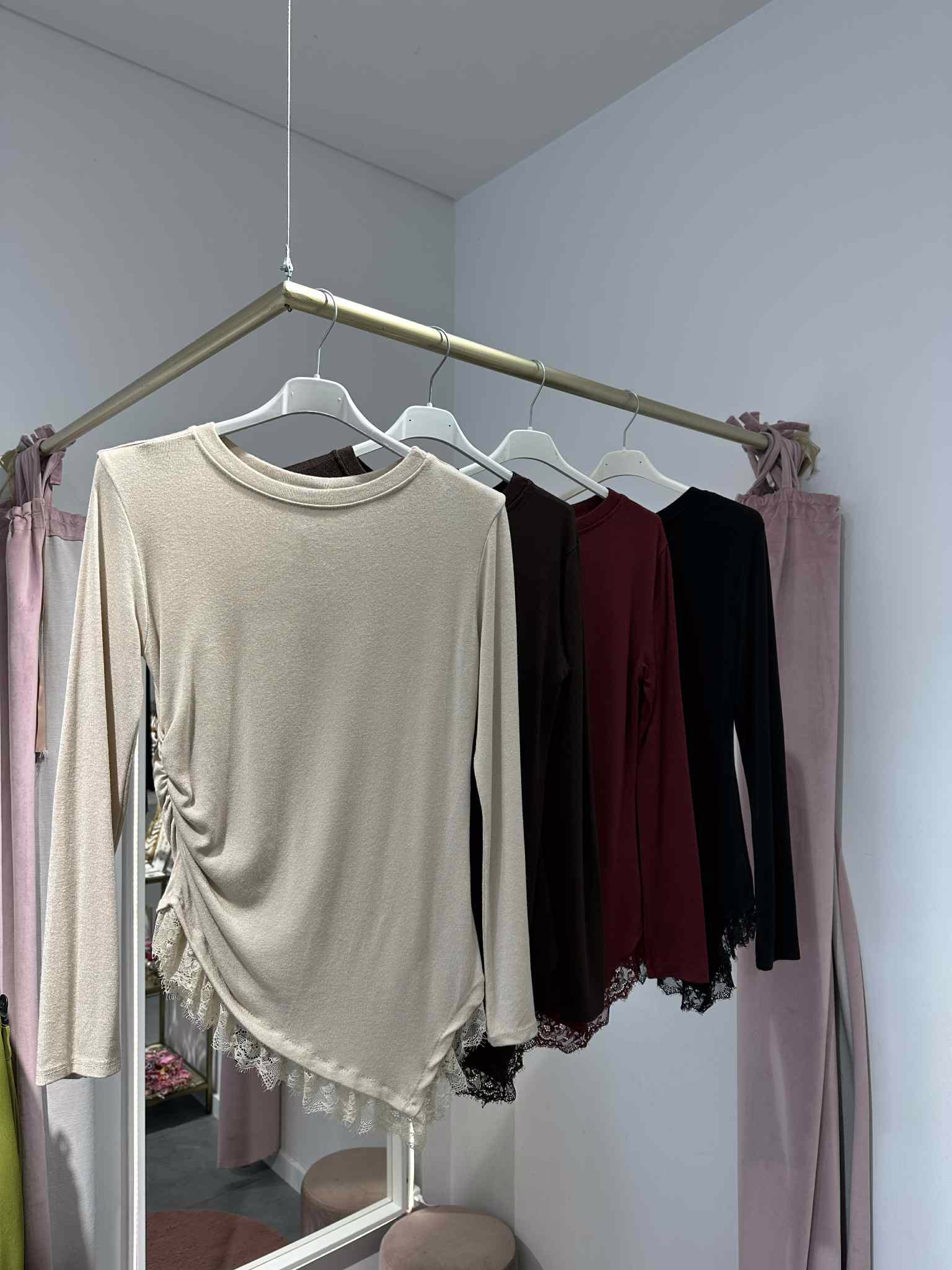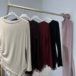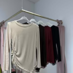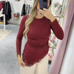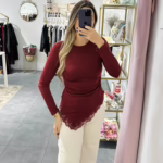 A modelo tem 1,73m e veste o tamanho M/L parte de cima e um 38/40 de parte de baixo.