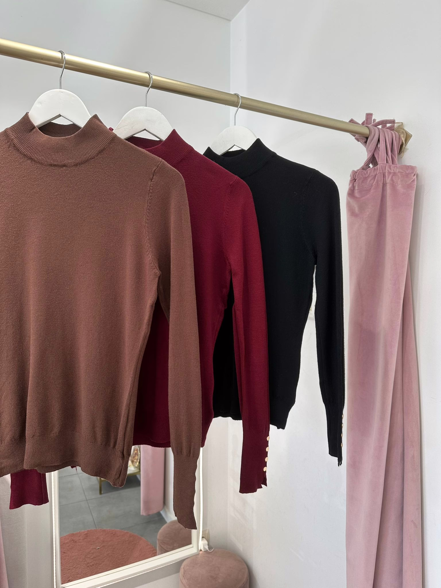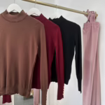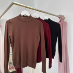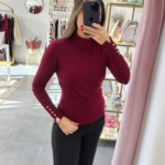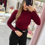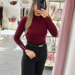 A modelo tem 1,73m e veste o tamanho M/L parte de cima e um 38/40 de parte de baixo.