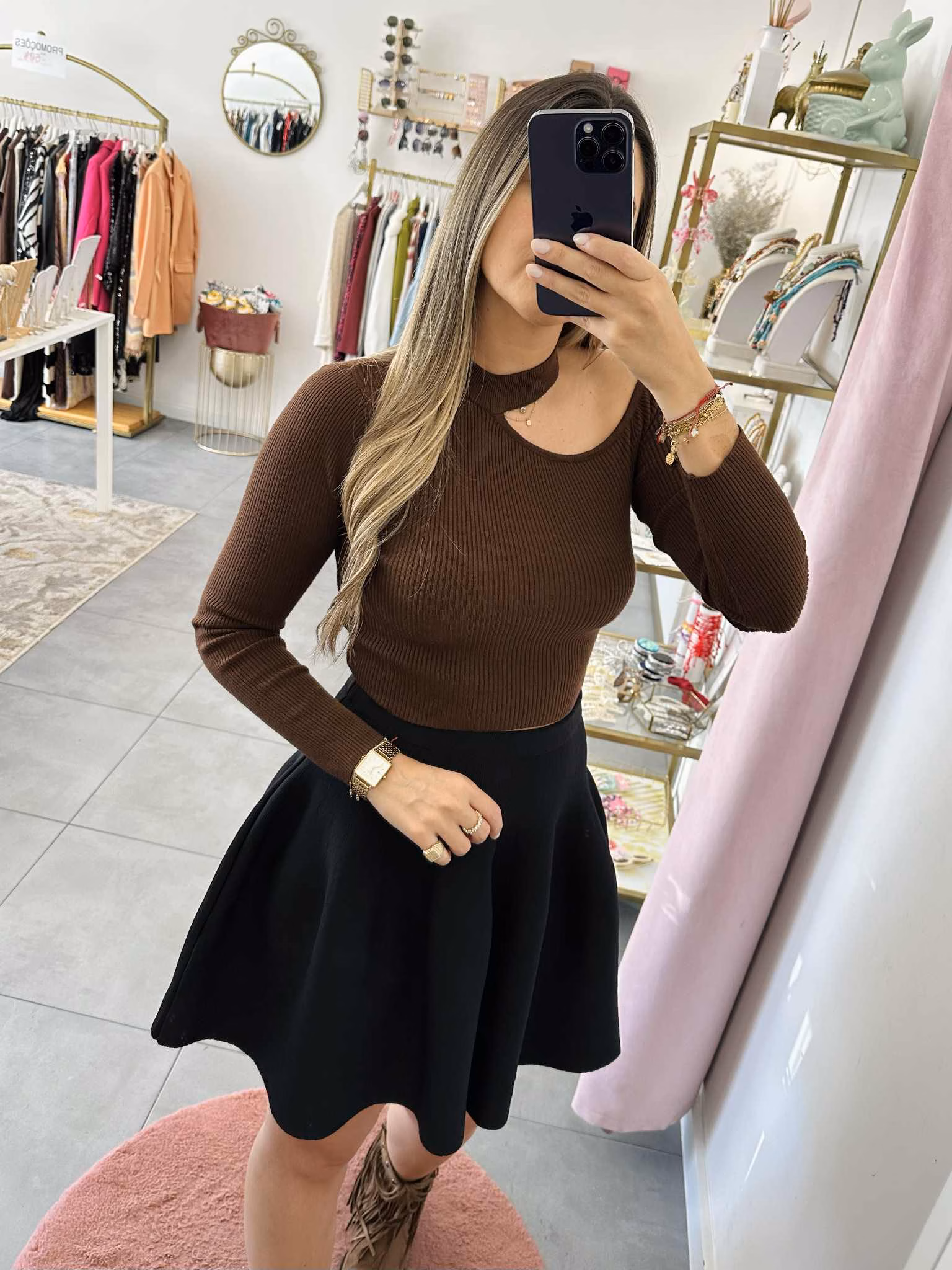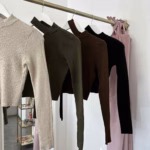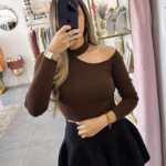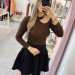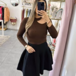 A modelo tem 1,73m e veste o tamanho M/L parte de cima e um 38/40 de parte de baixo.