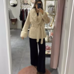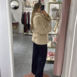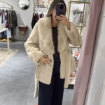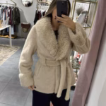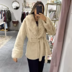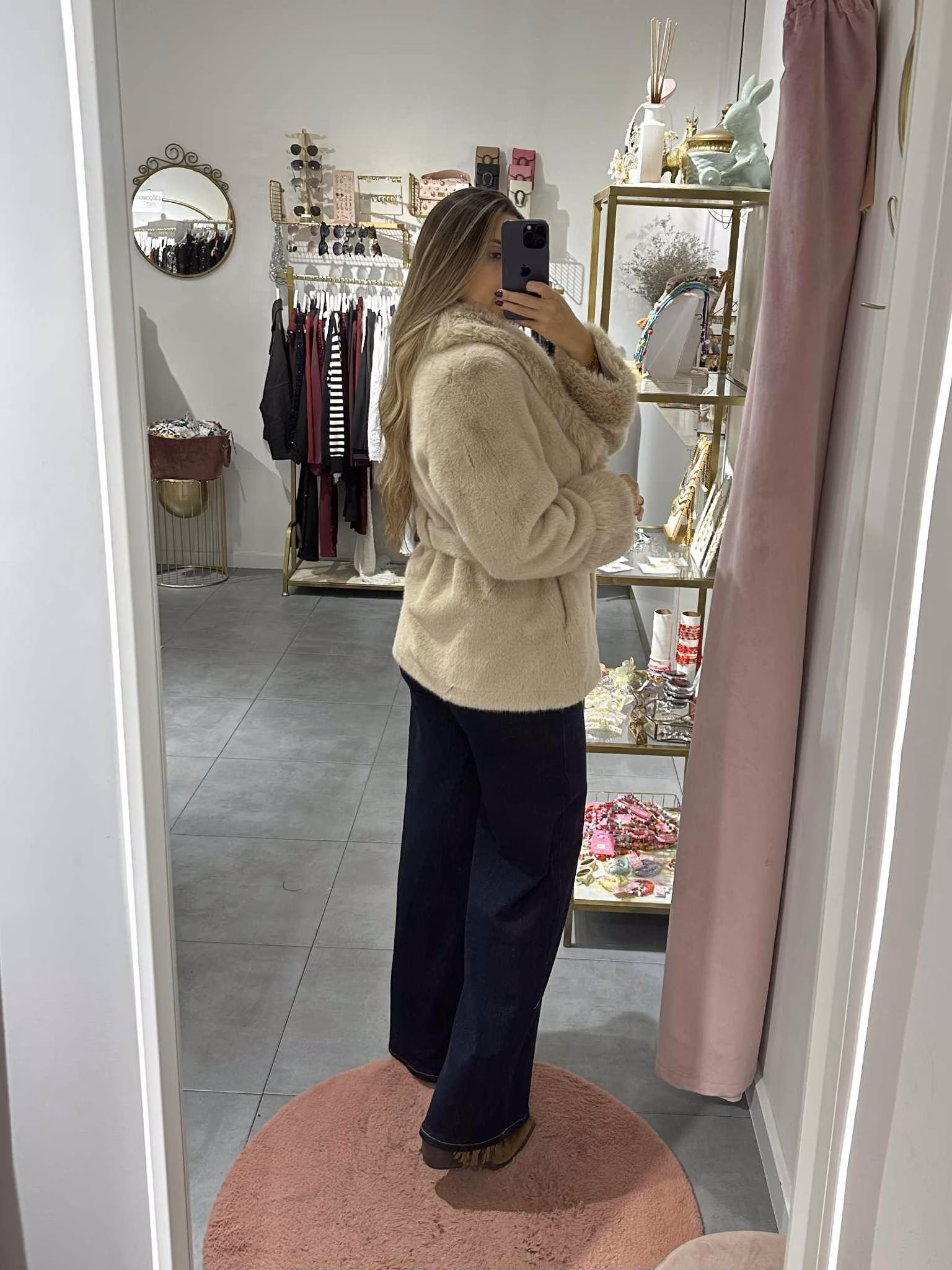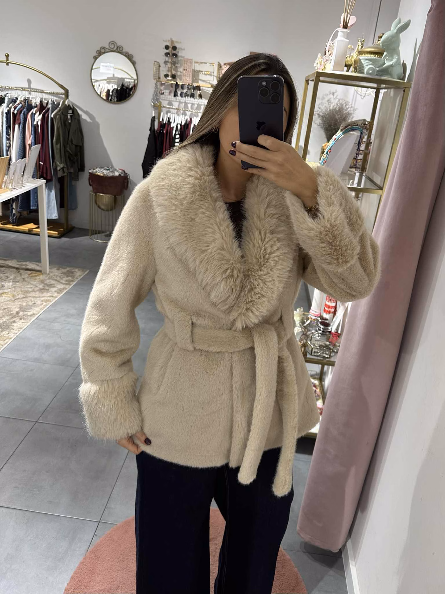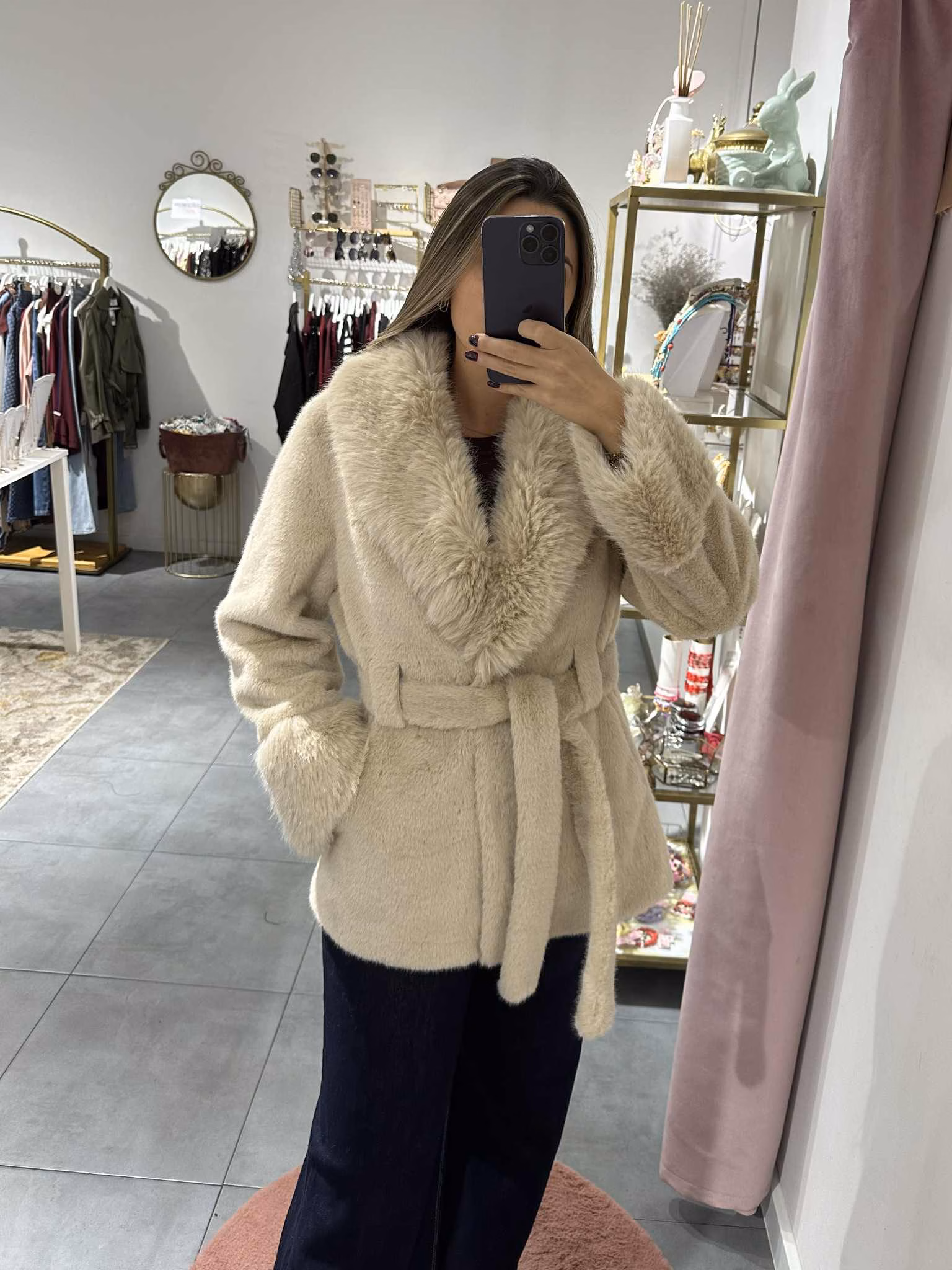 Casac curto bege com gola em pelo, aperta com molas e cinto. Tem bolsos.