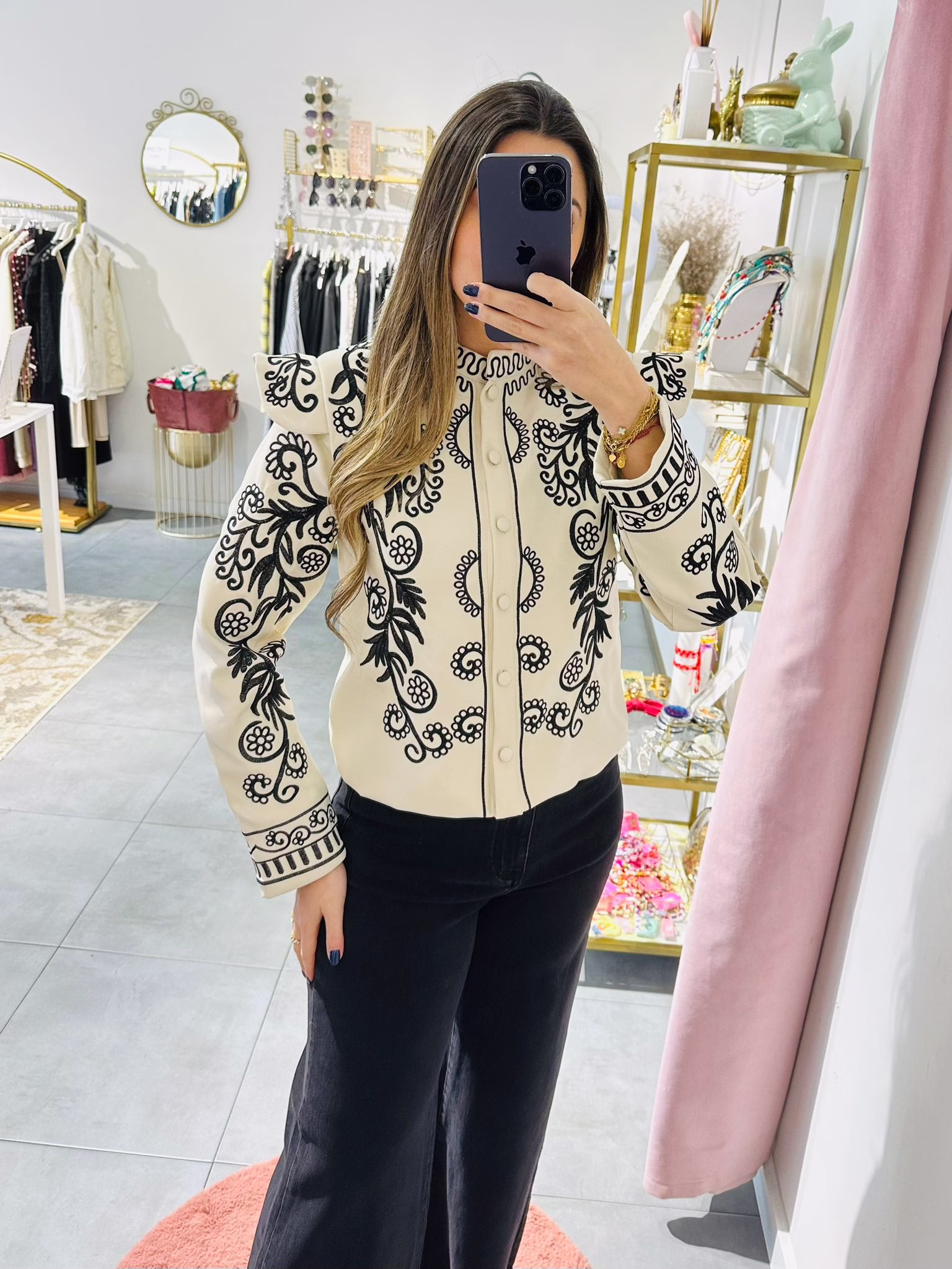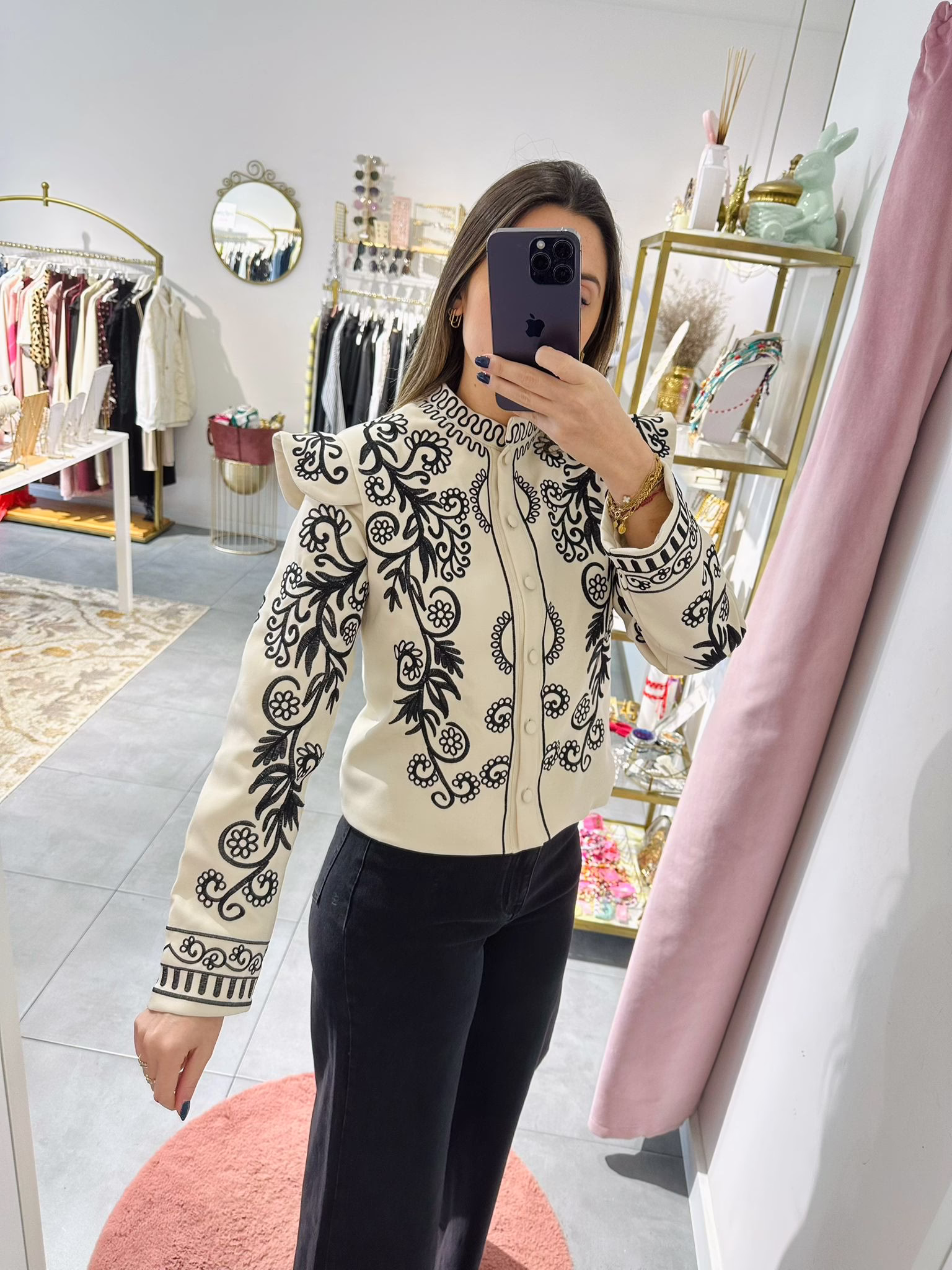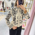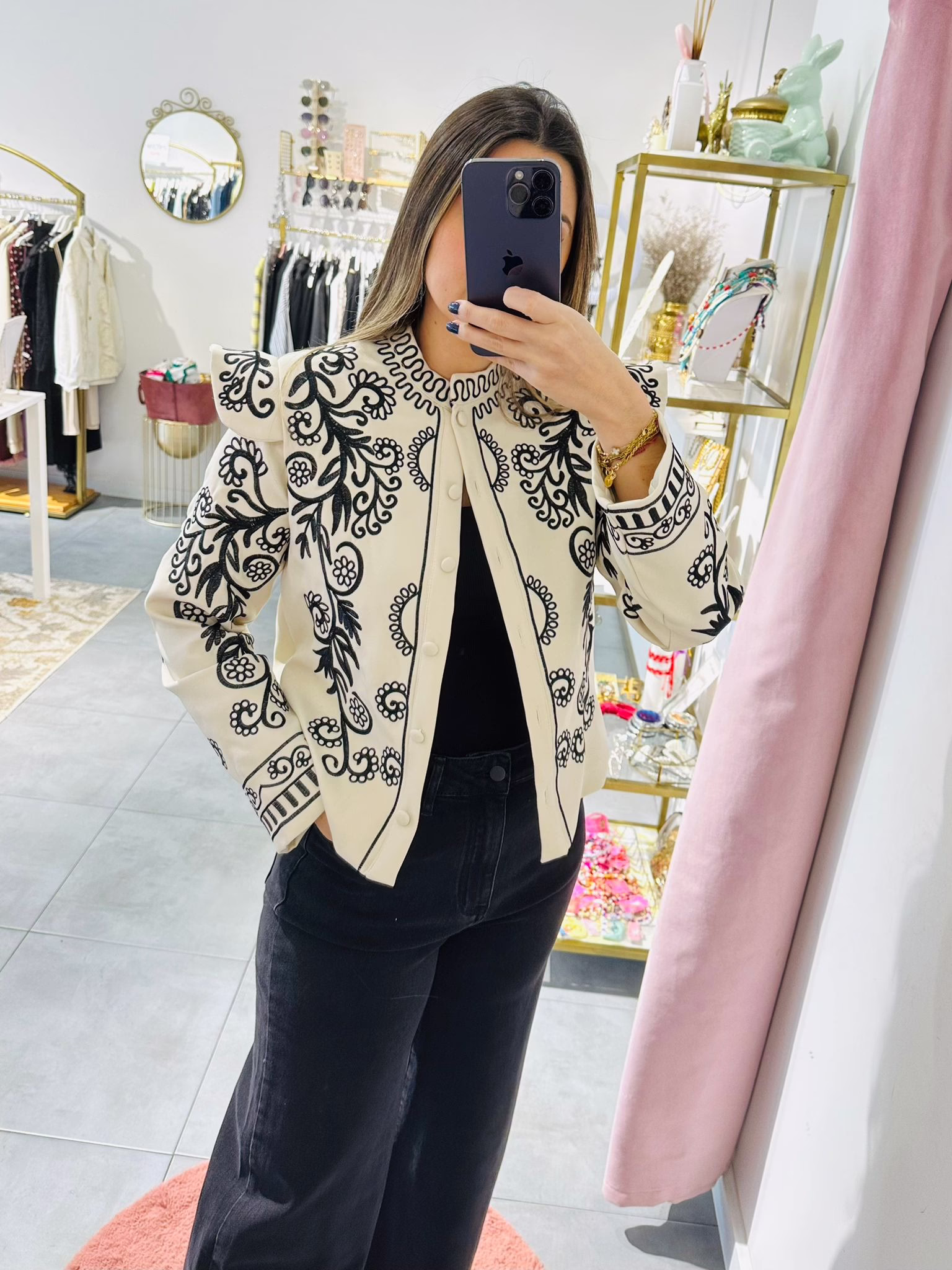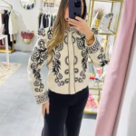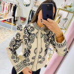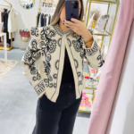Casaco bege com bordados pretos. Não tem bolsos. É forrado.