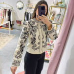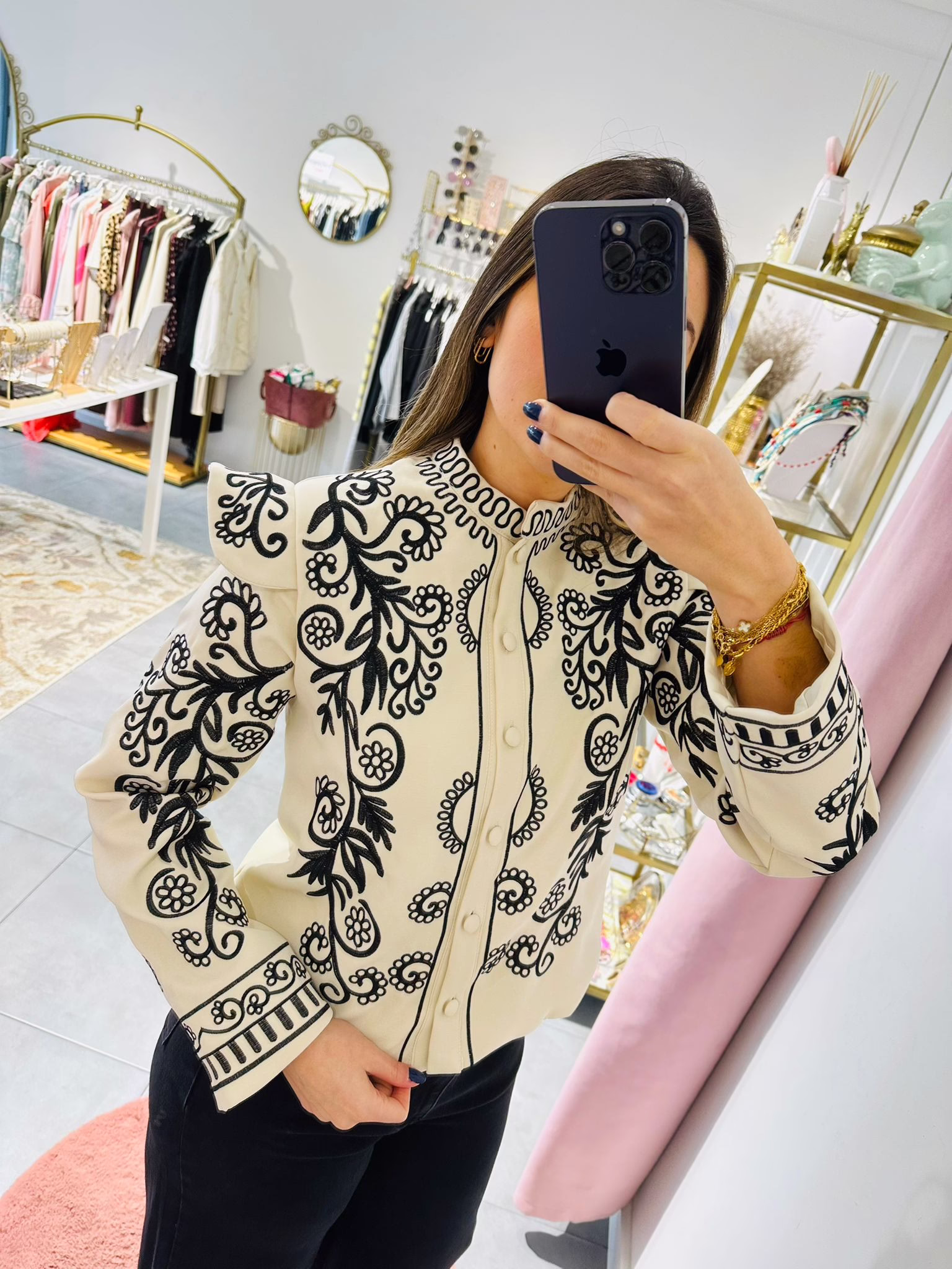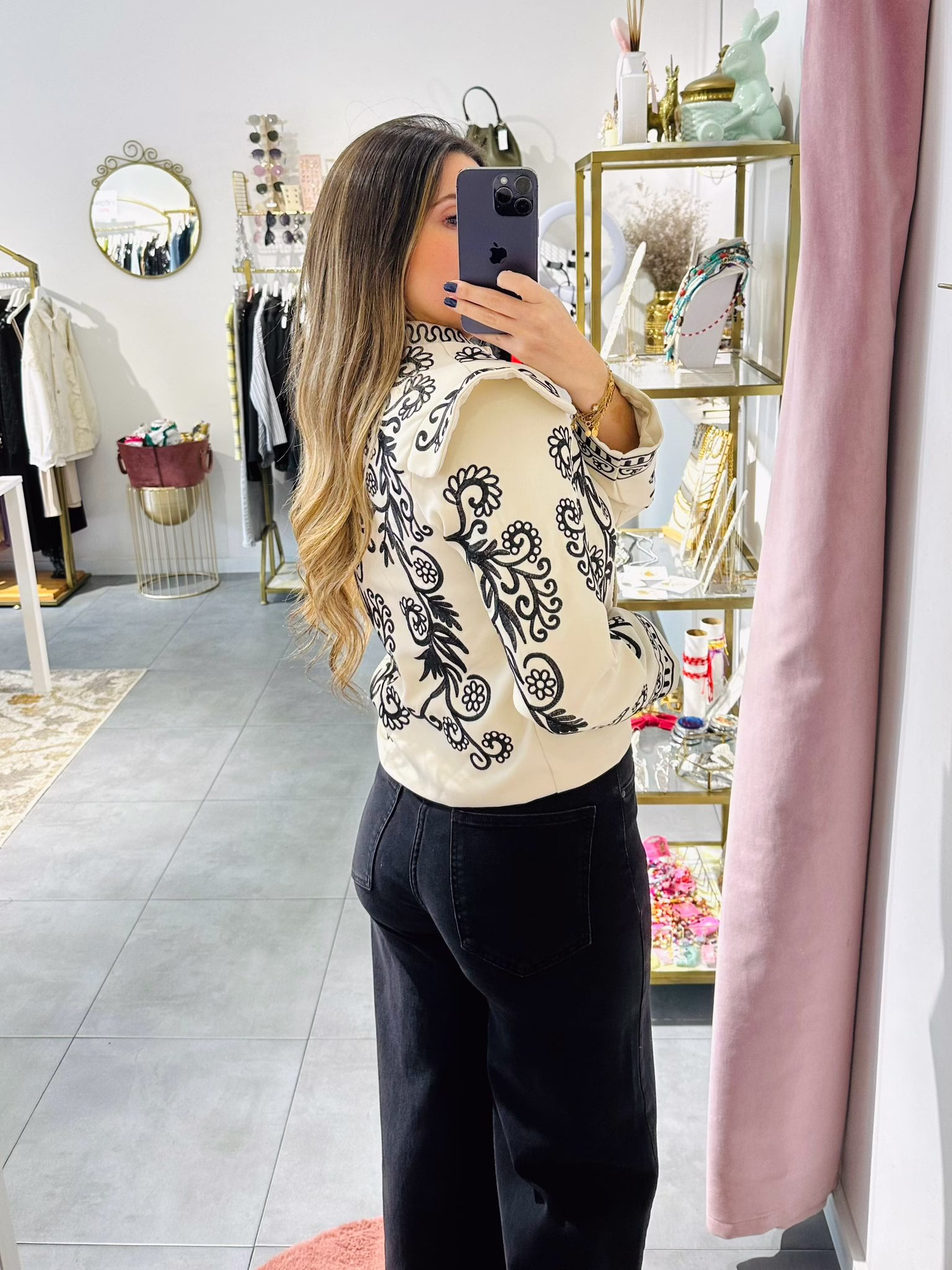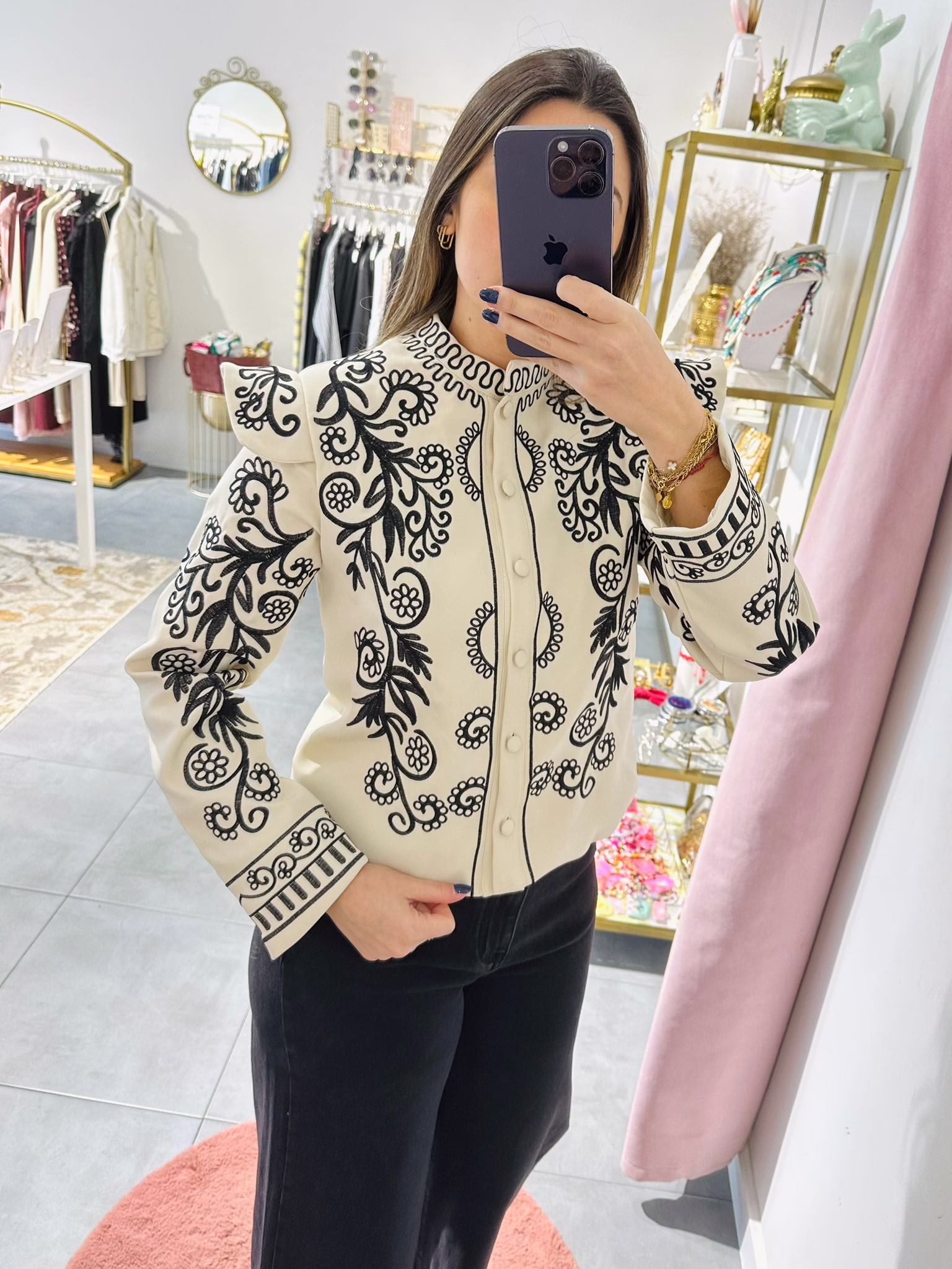 Casaco bege com bordados pretos. Não tem bolsos. É forrado.