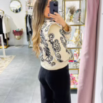 A modelo tem 1,73m e veste o tamanho M/L parte de cima e um 38/40 de parte de baixo.