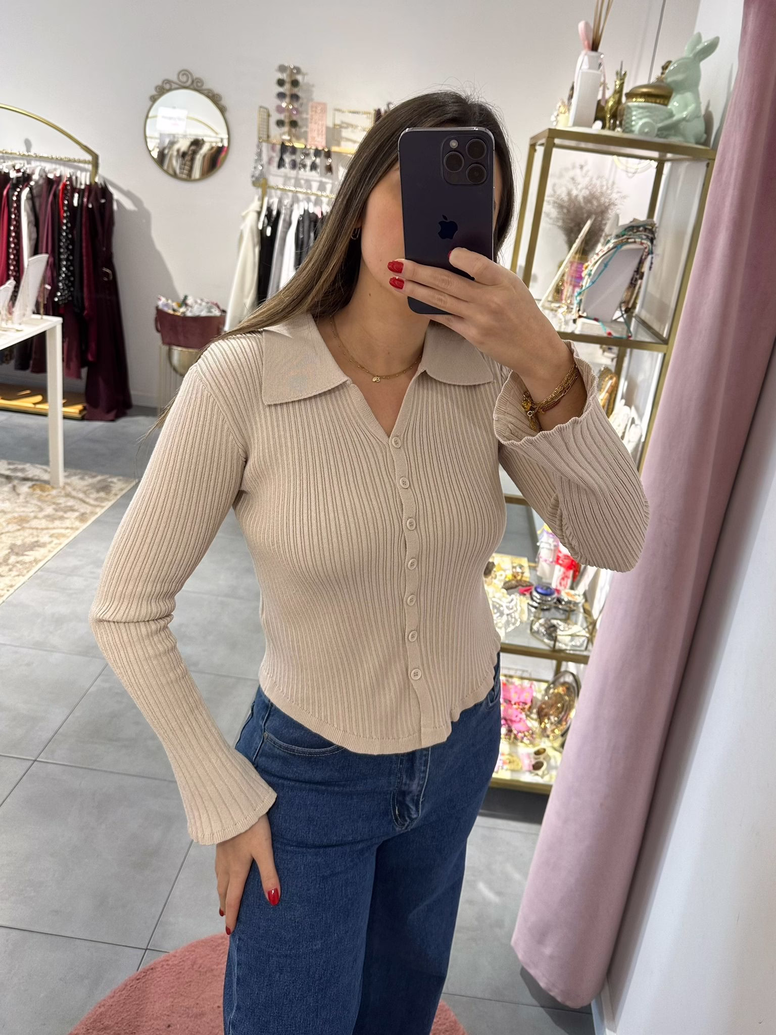 Casaco/camisola em malha canelada, a manga é flare e é assimétrica, mais comprida a frente.