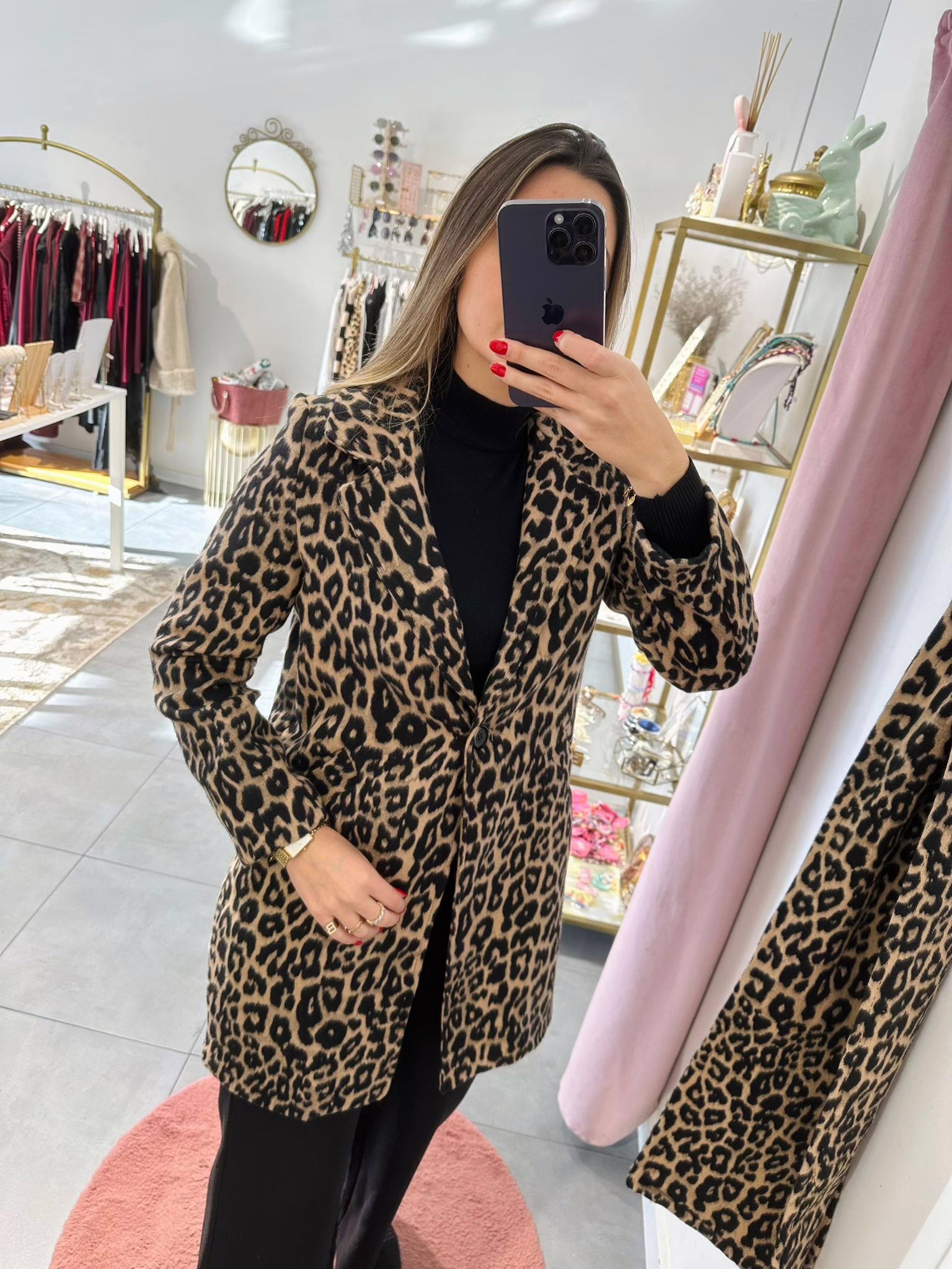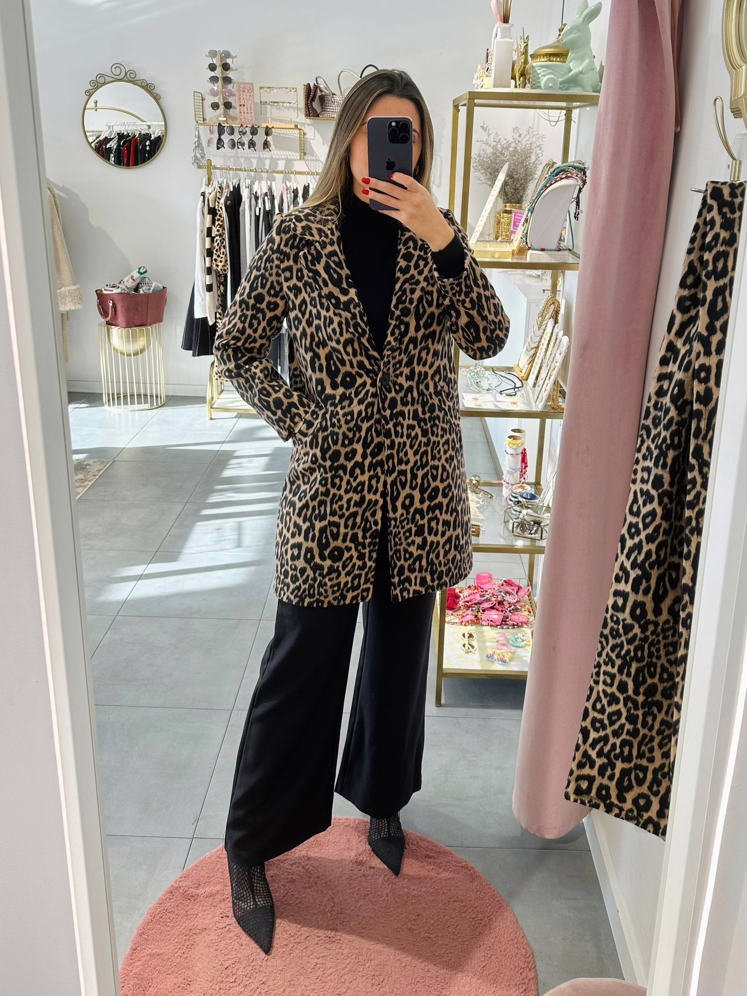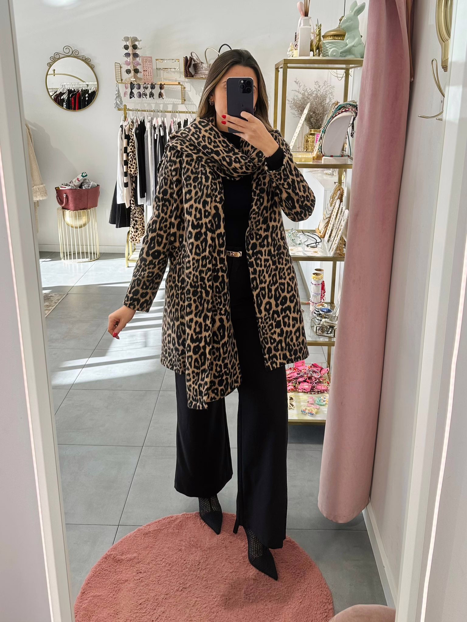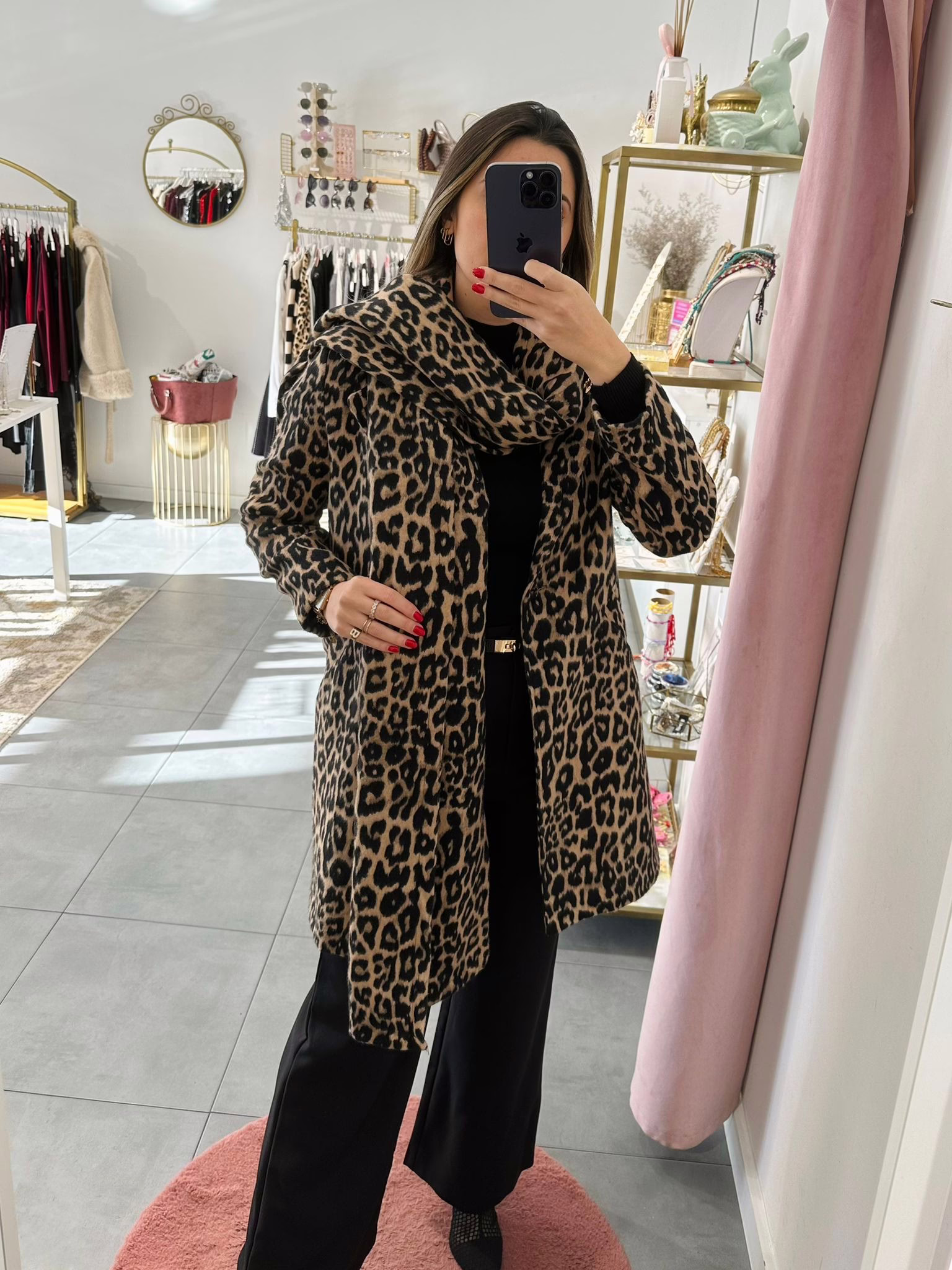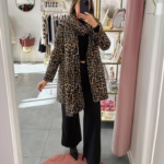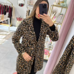 Casaco fazenda com cachecol em padrão animal print, aperta com botão e tem bolsos.