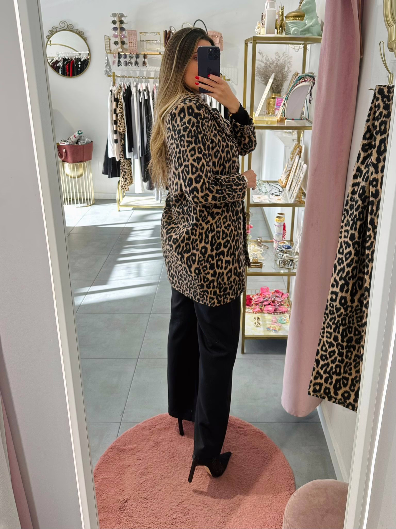 A modelo tem 1,73m e veste o tamanho M/L parte de cima e um 38/40 de parte de baixo.