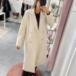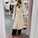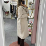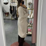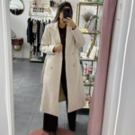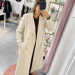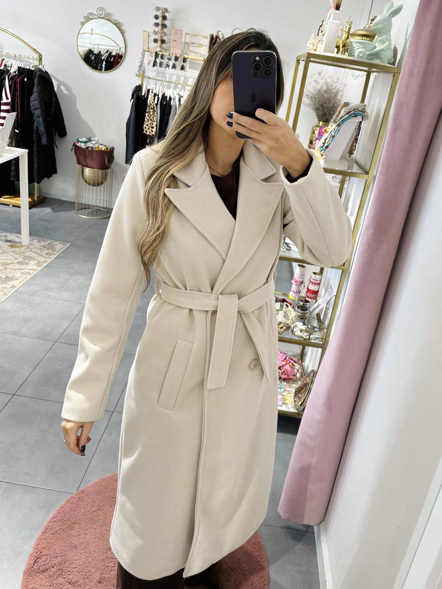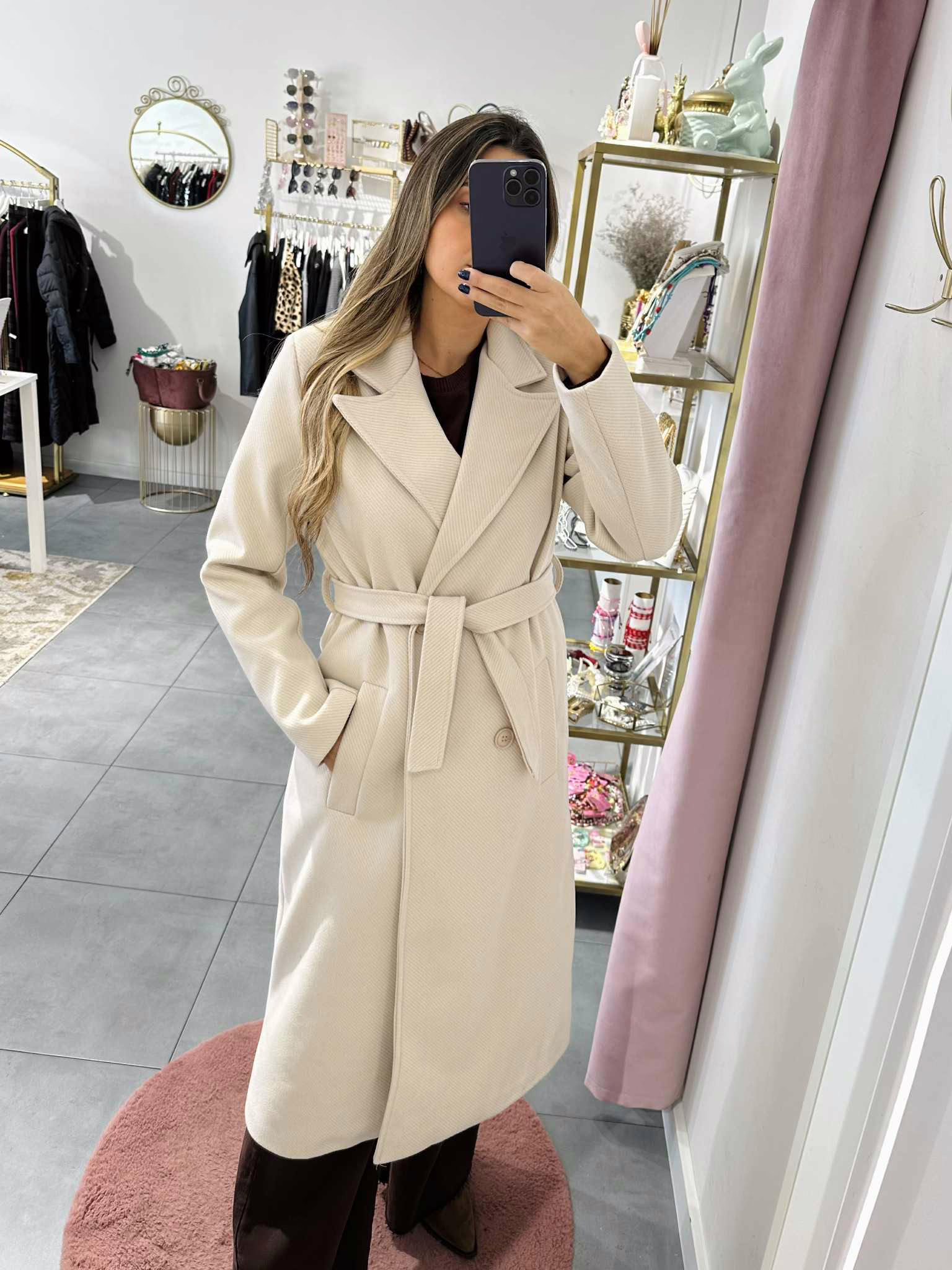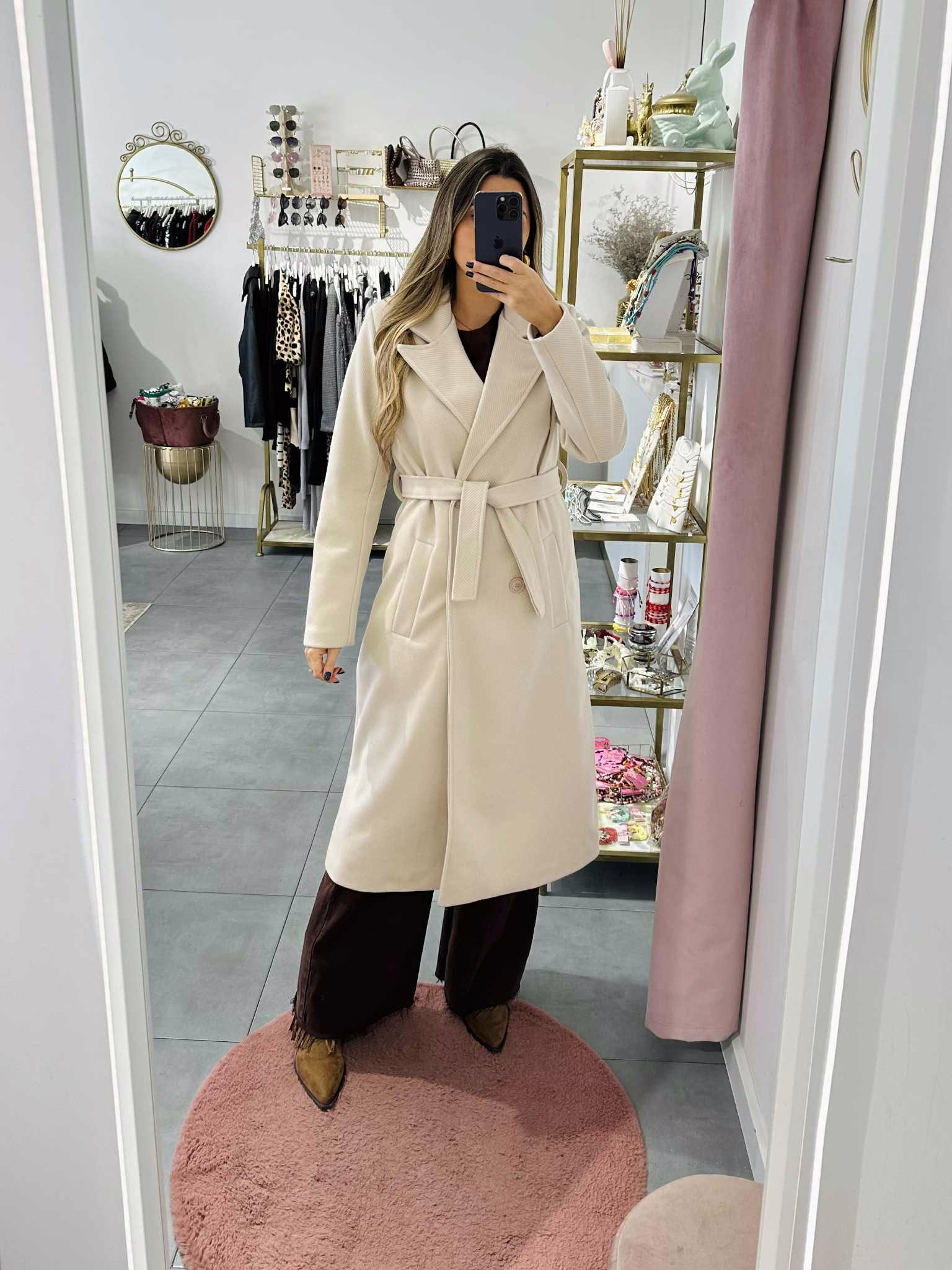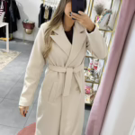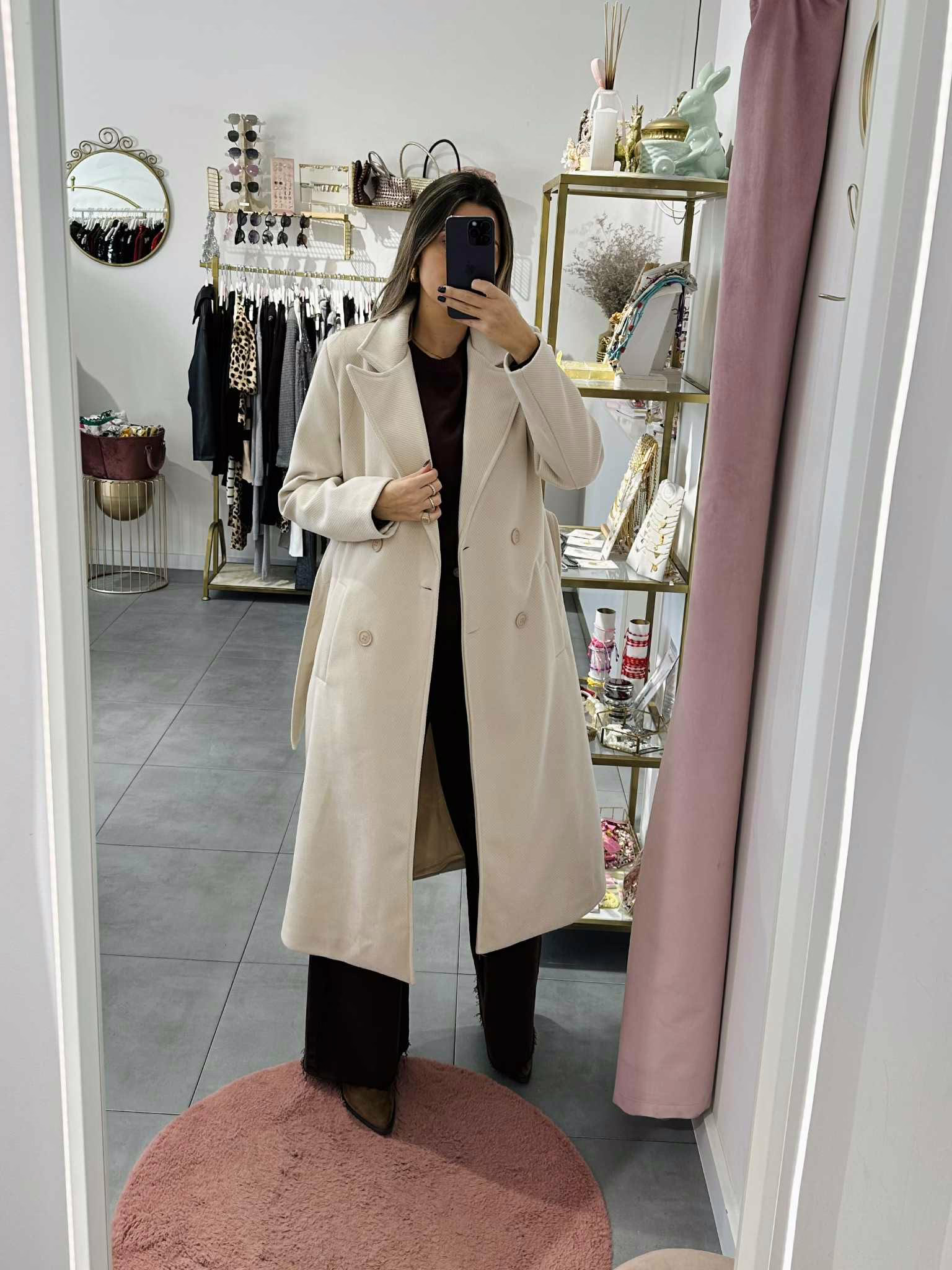 Casaco comprido em fazenda, aperta com botões e cinto.