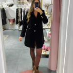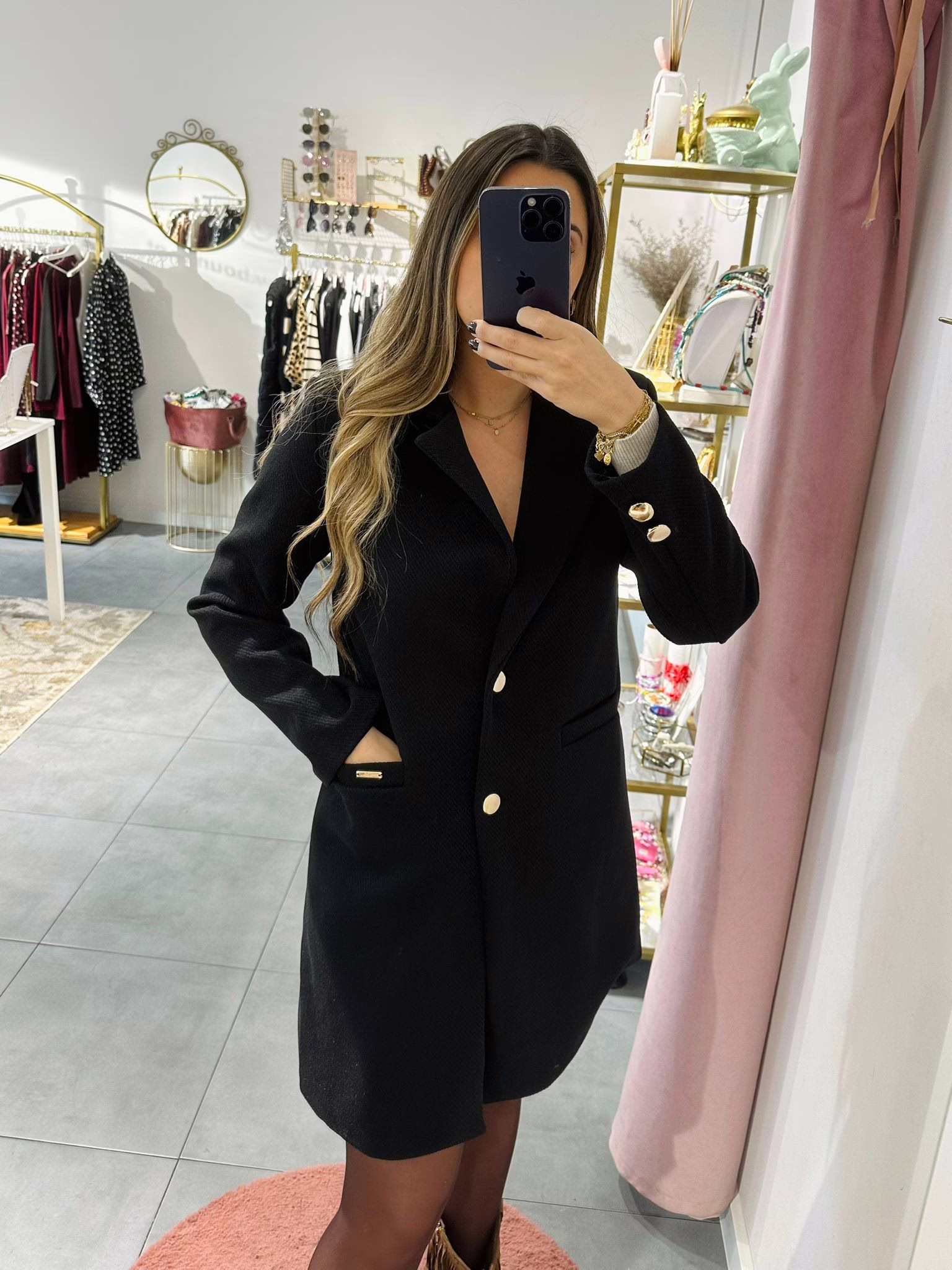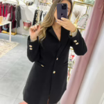 Casaco médio em fazenda em espinha, aperta com dois botões dourados, é forrado e tem bolsos.
