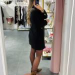 A modelo tem 1,73m e veste o tamanho M/L parte de cima e um 38/40 de parte de baixo.