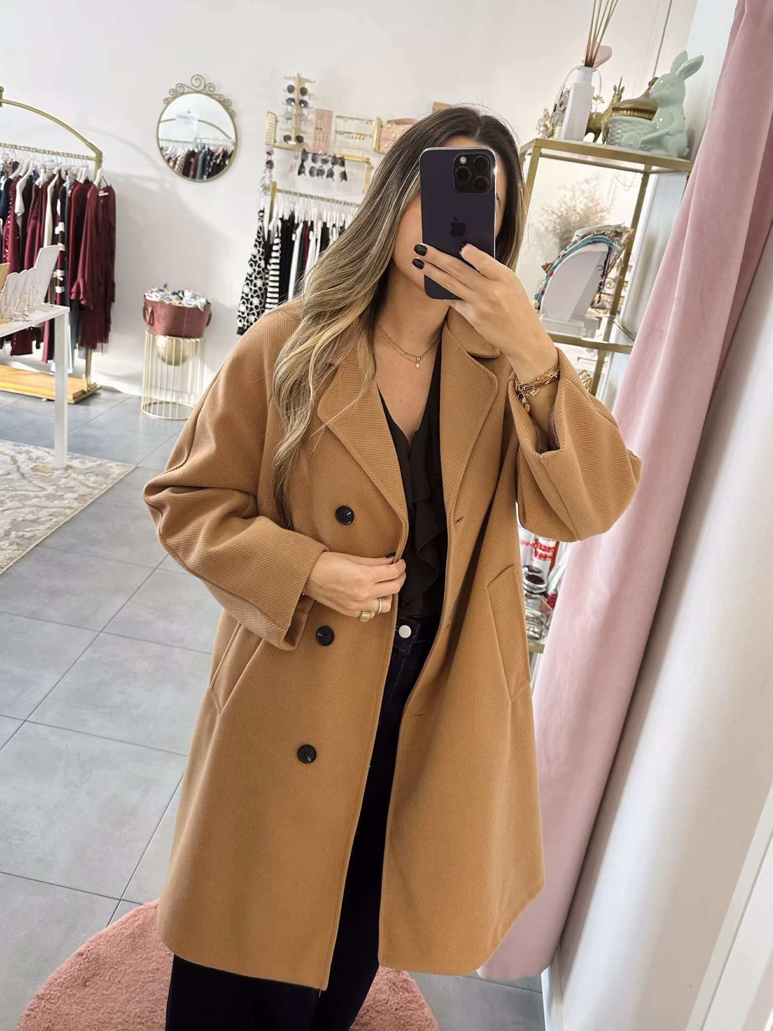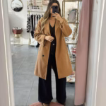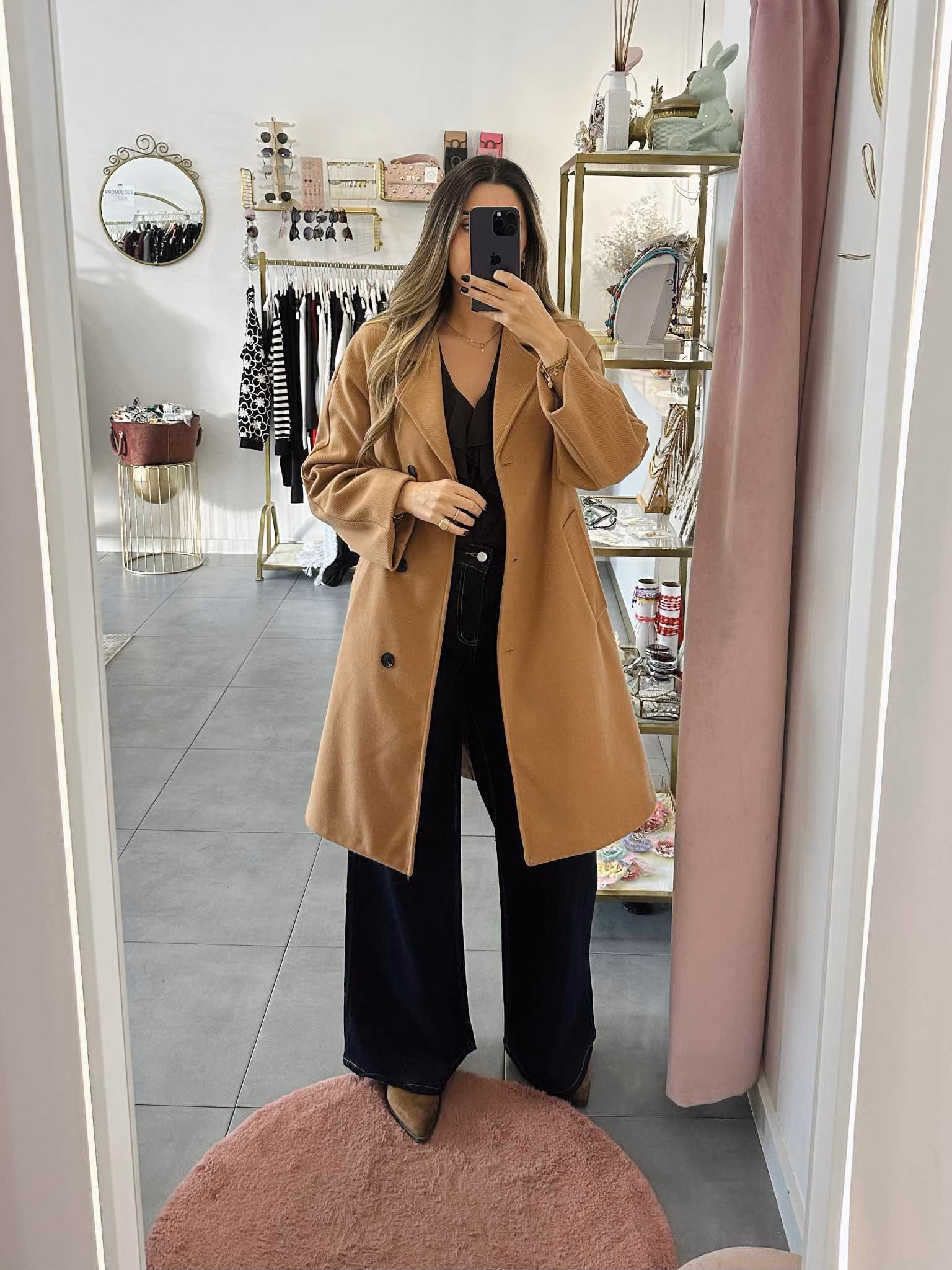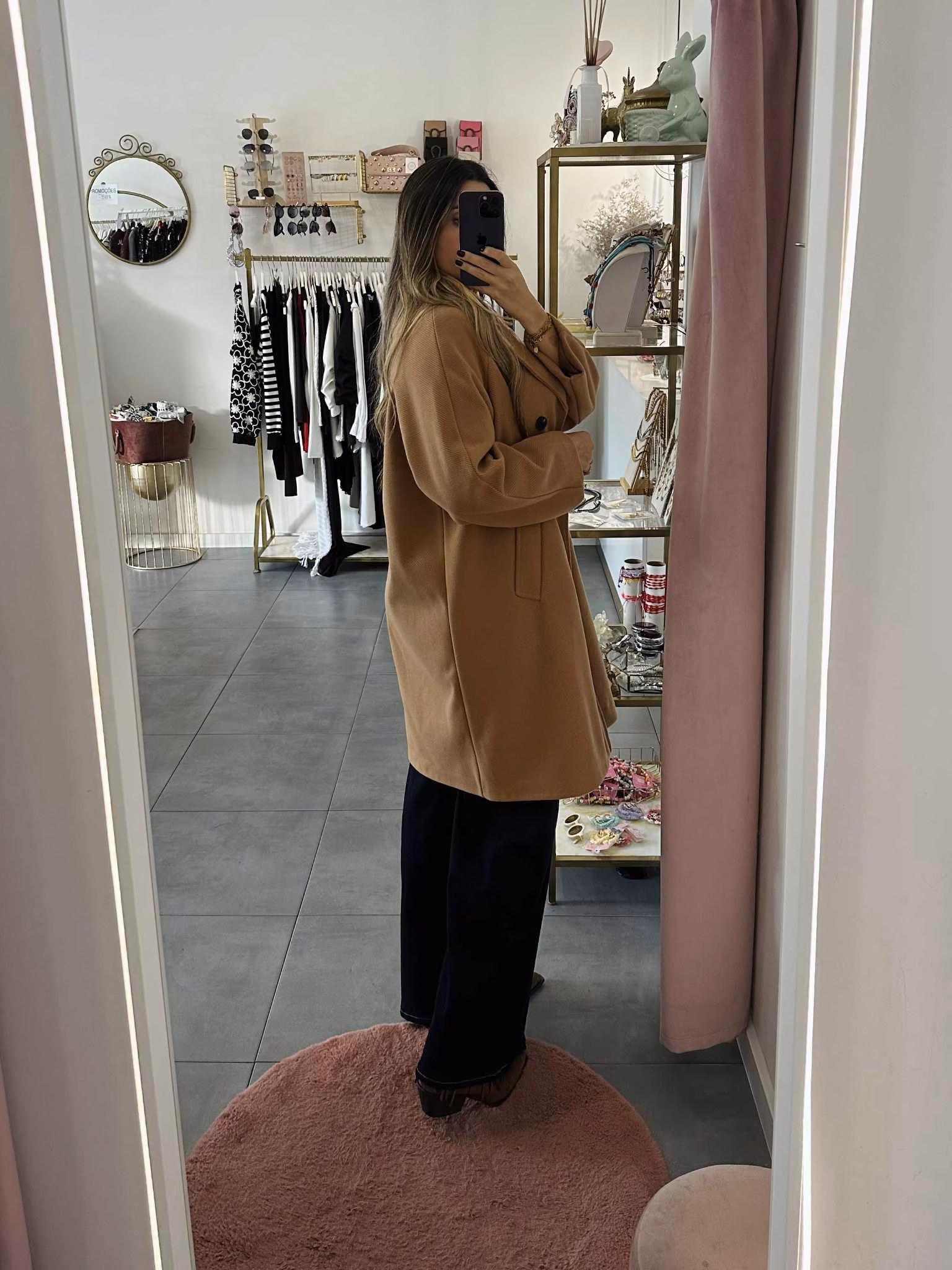 A modelo tem 1,73m e veste o tamanho M/L parte de cima e um 38/40 de parte de baixo.