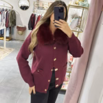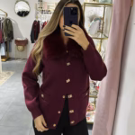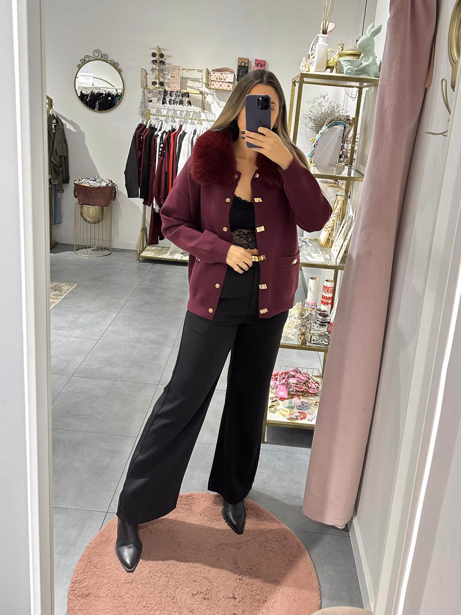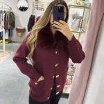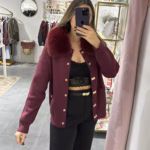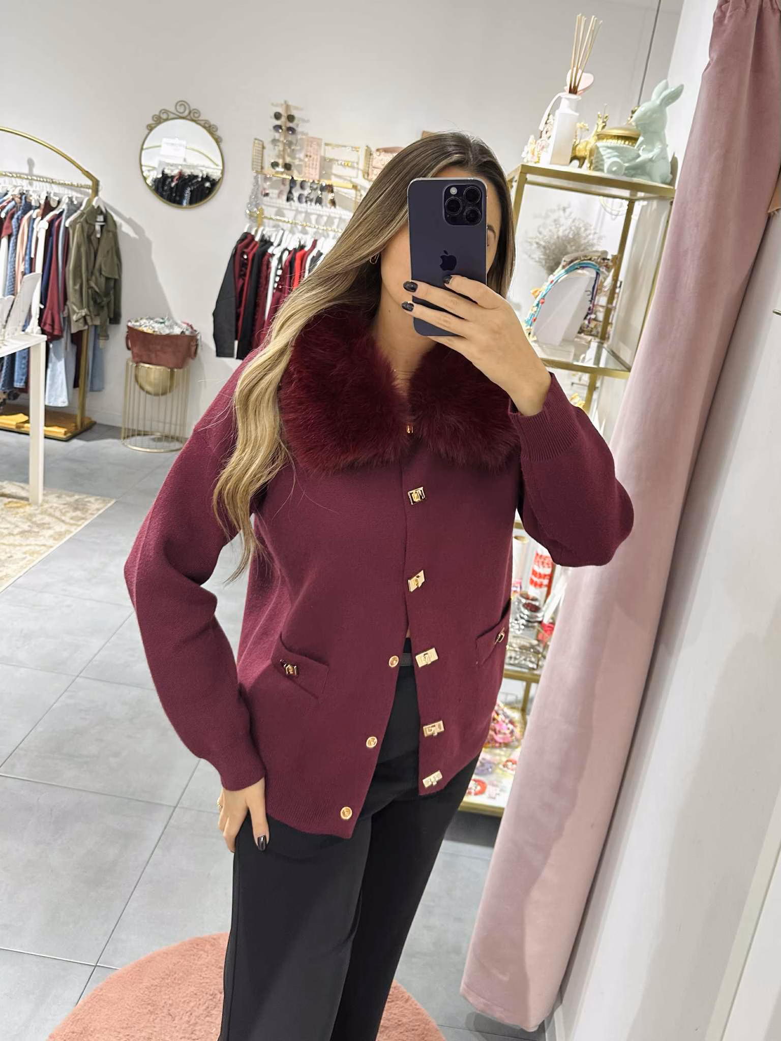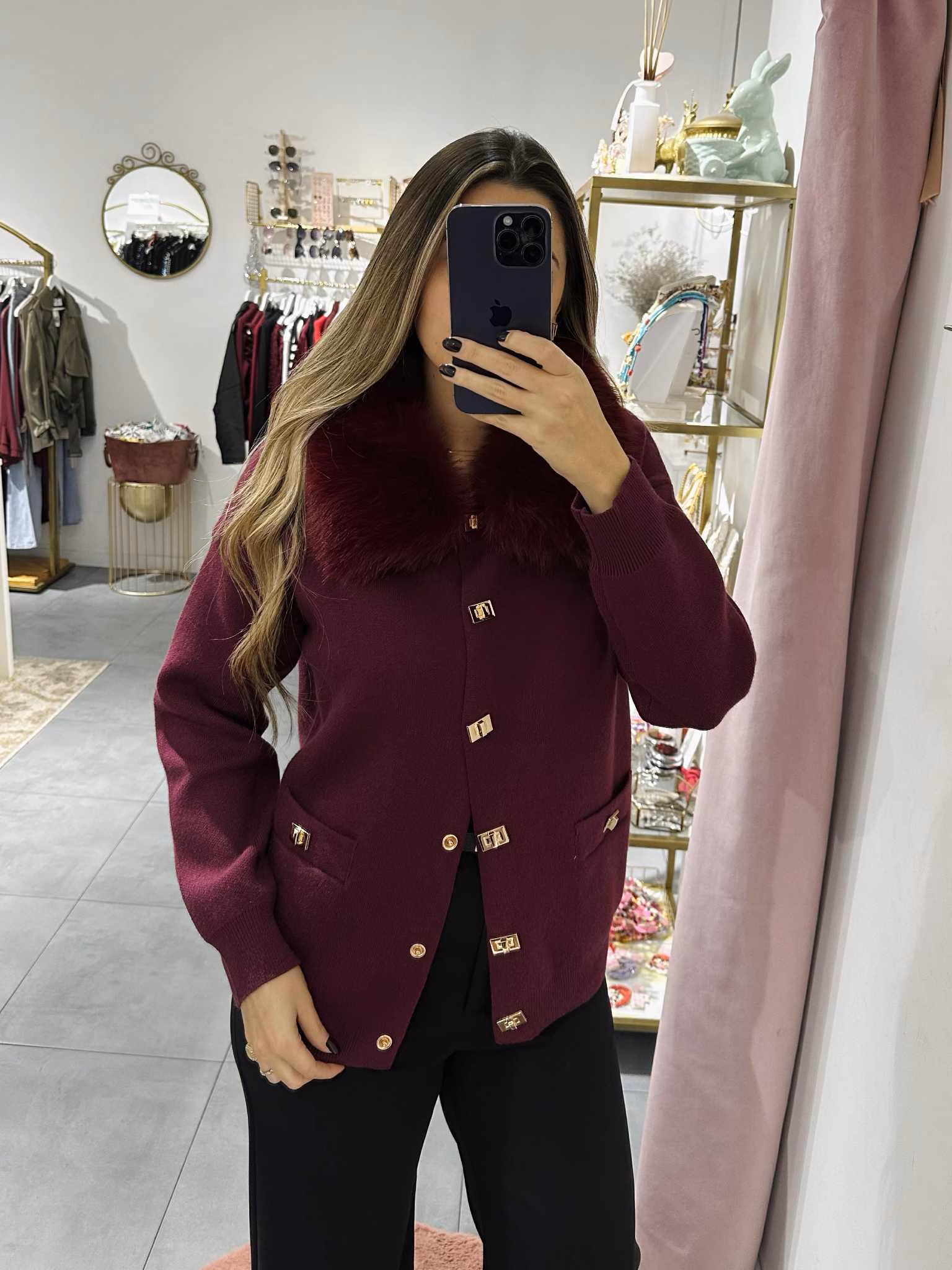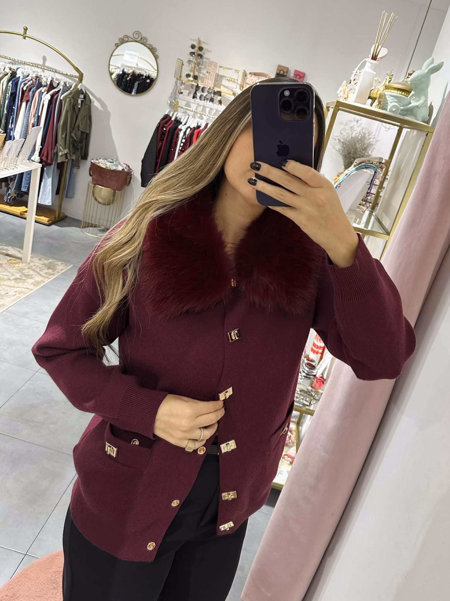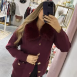 Casaco em malha consistente, tem bolos e aprta com molas, a gola de pelo é amovível.