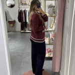 A modelo tem 1,73m e veste o tamanho M/L parte de cima e um 38/40 de parte de baixo.
