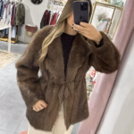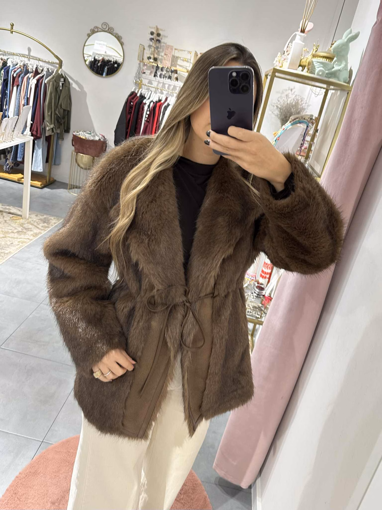 Casaco pelo curto com cinto e pomenores em napa, aperta com o cinto e tem bolsos.
