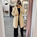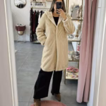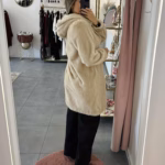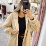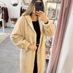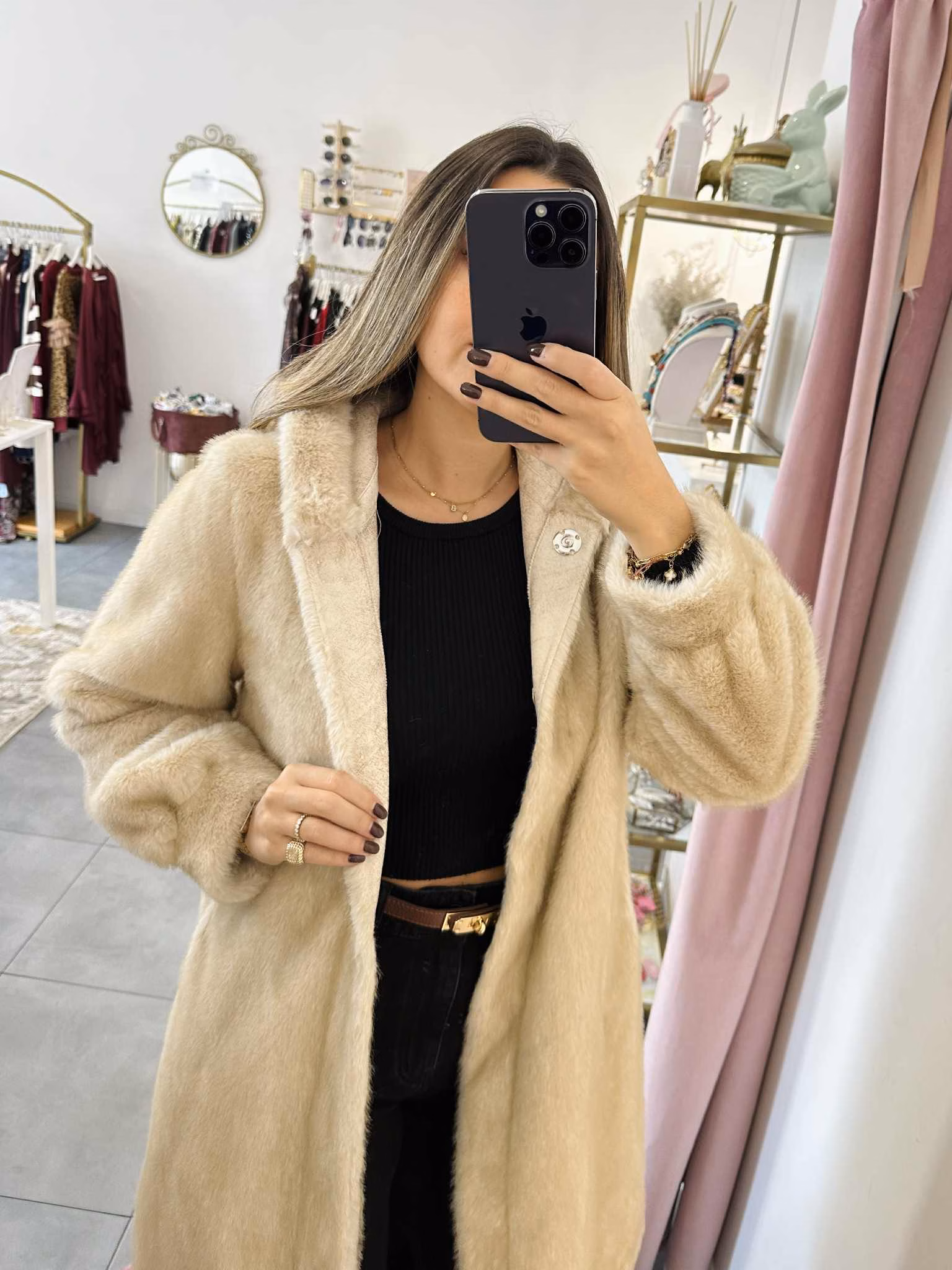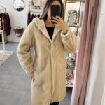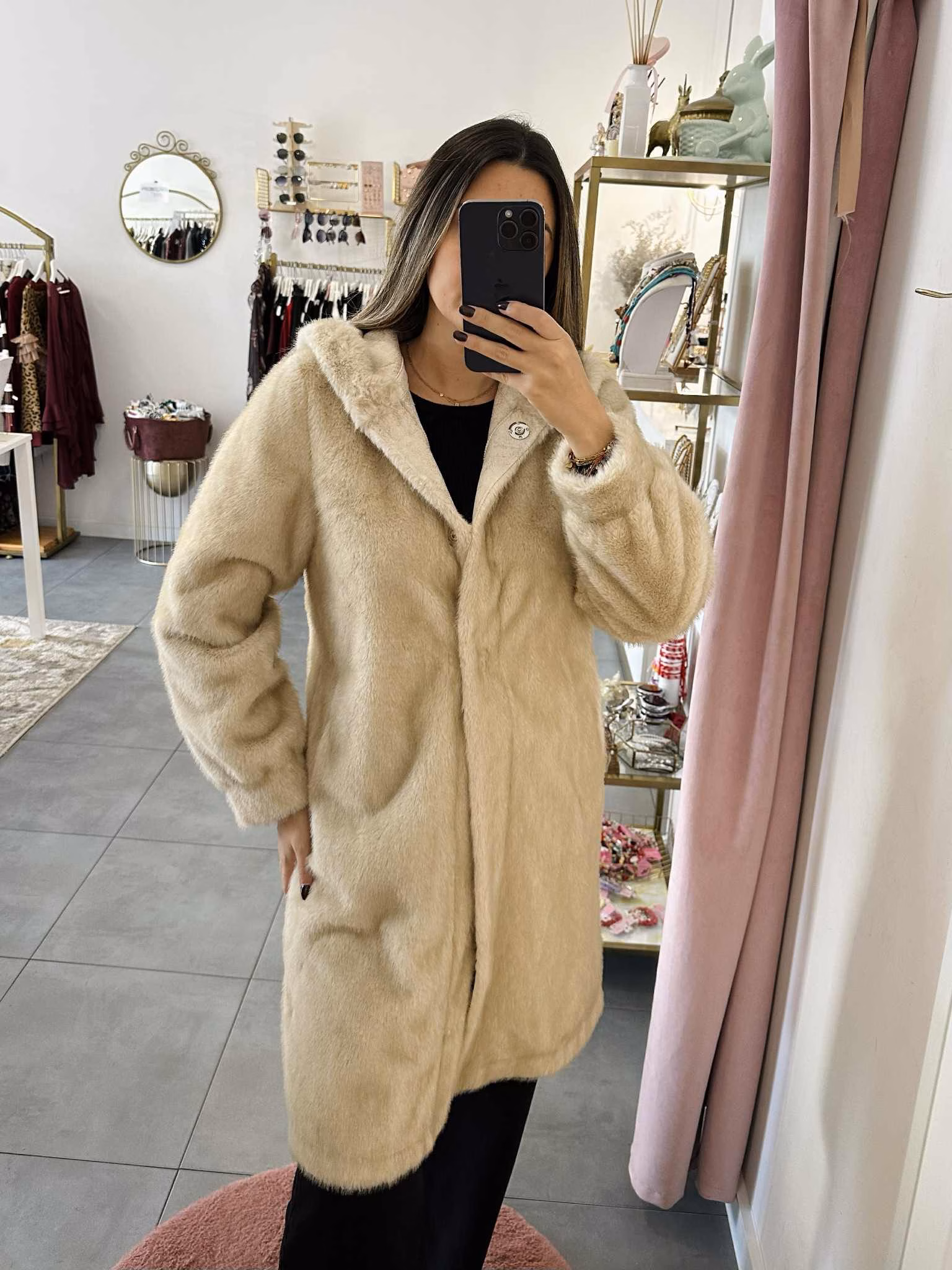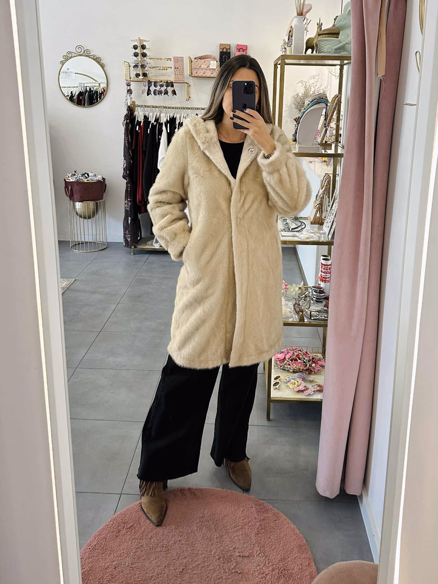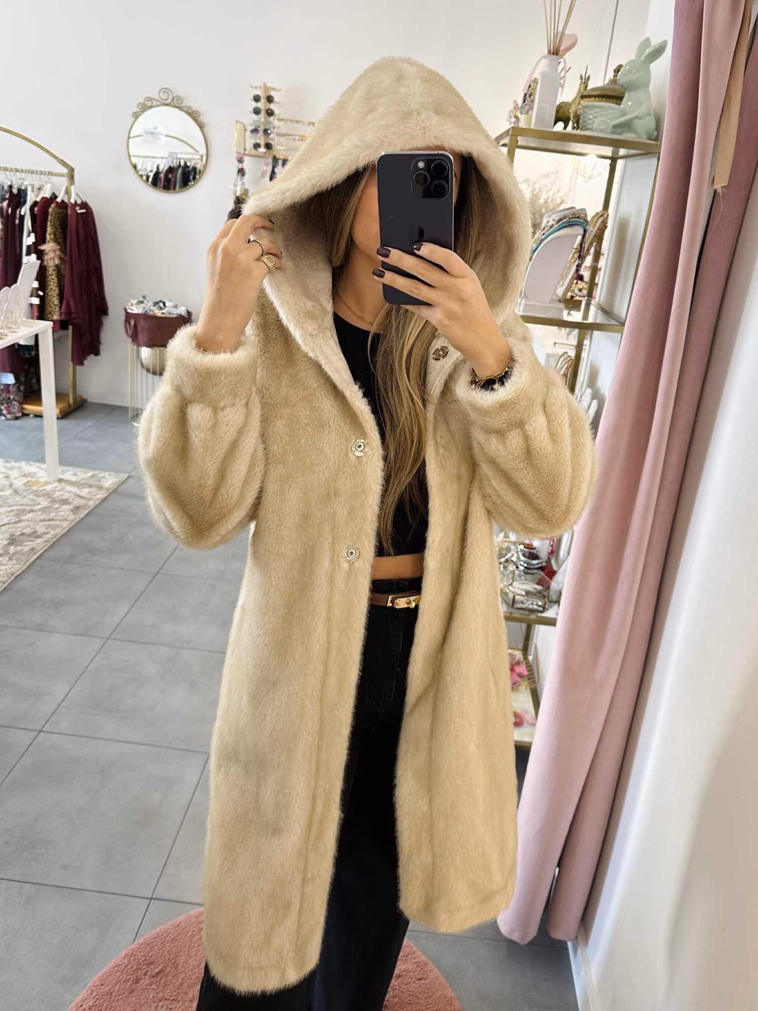 Casaco pelo midi com capucho, bolsos e aperta com 3 molas.