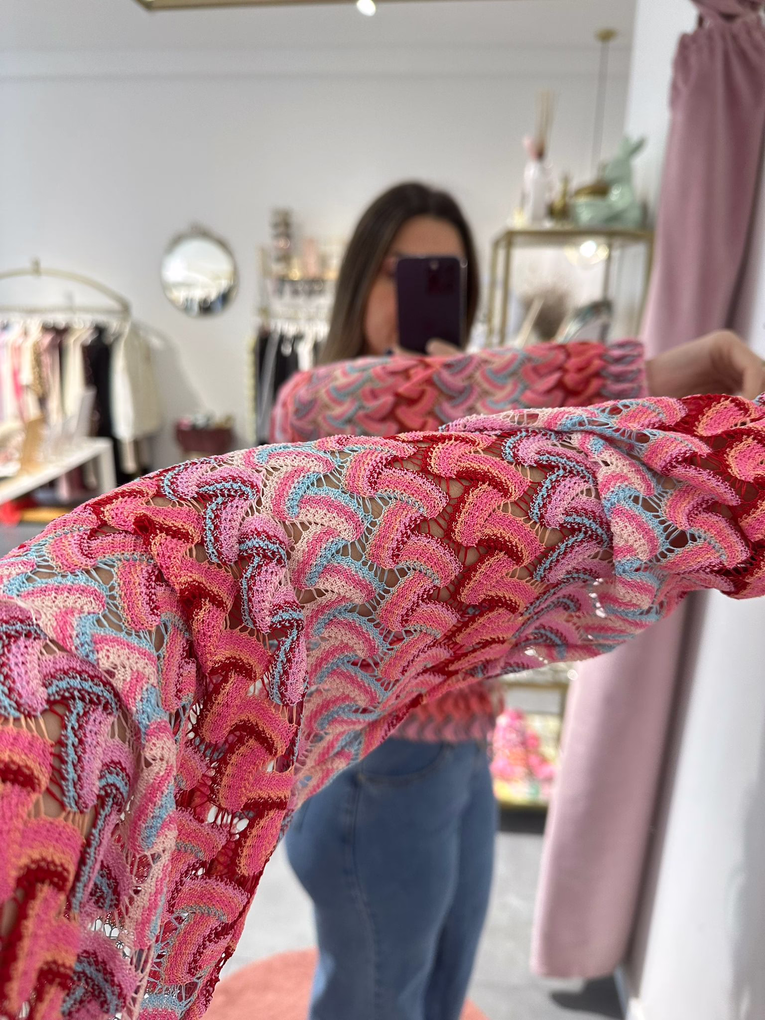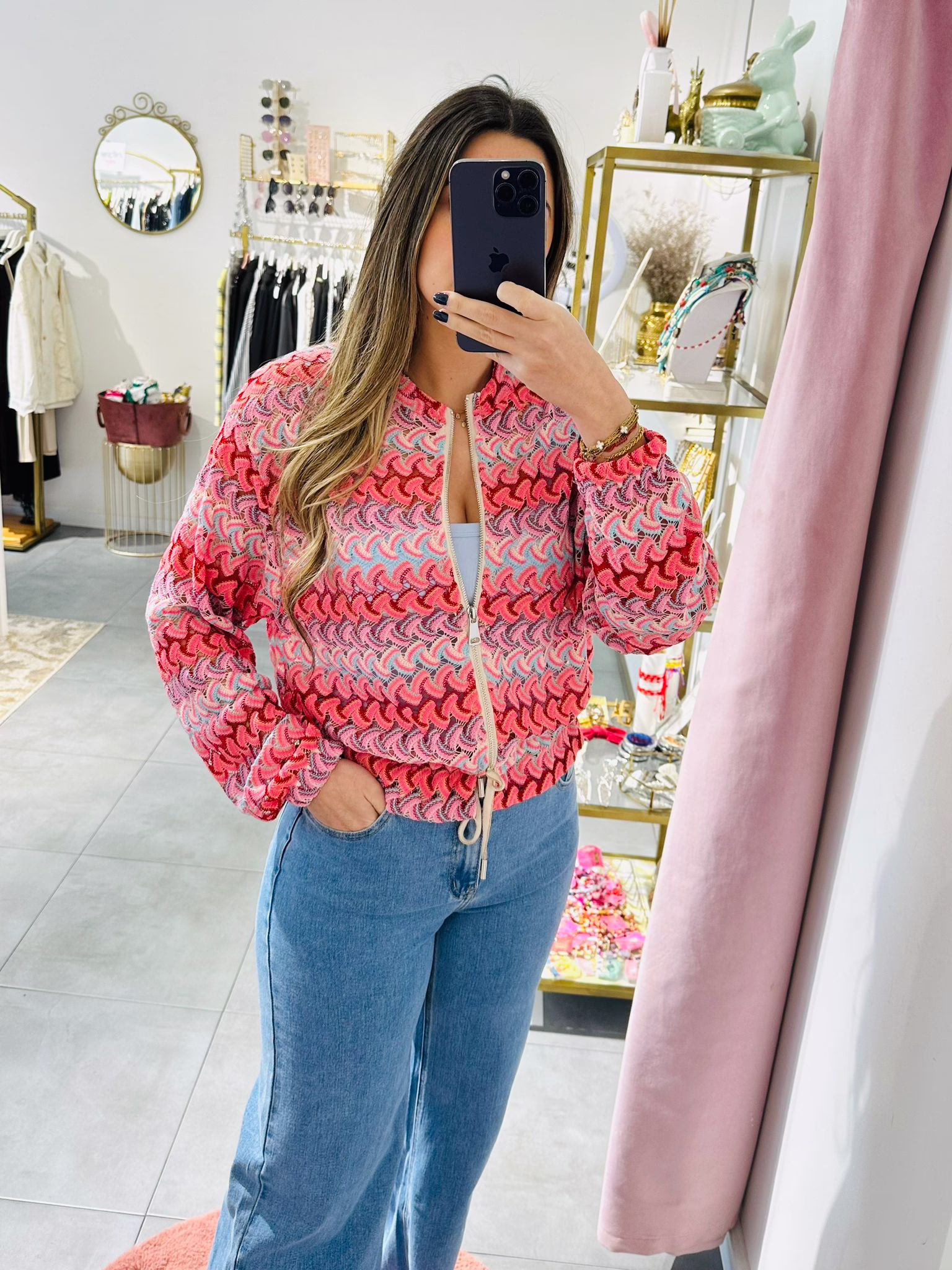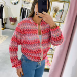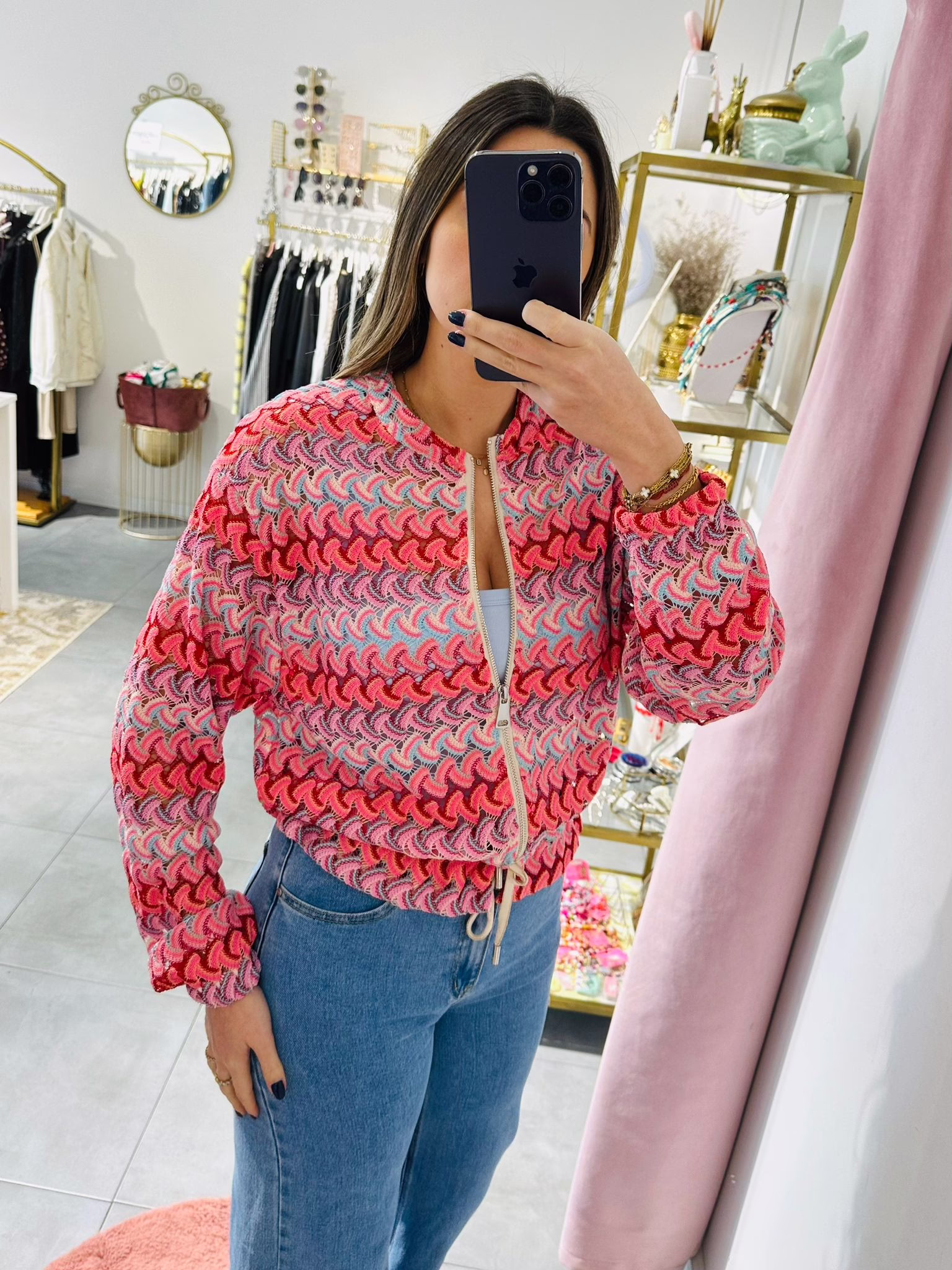 Casaco em rede com várias cores, aperta com fecho e é ajustável na zona da cintura.