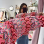 A modelo tem 1,73m e veste o tamanho M/L parte de cima e um 38/40 de parte de baixo.