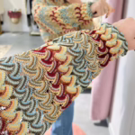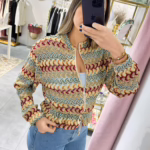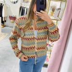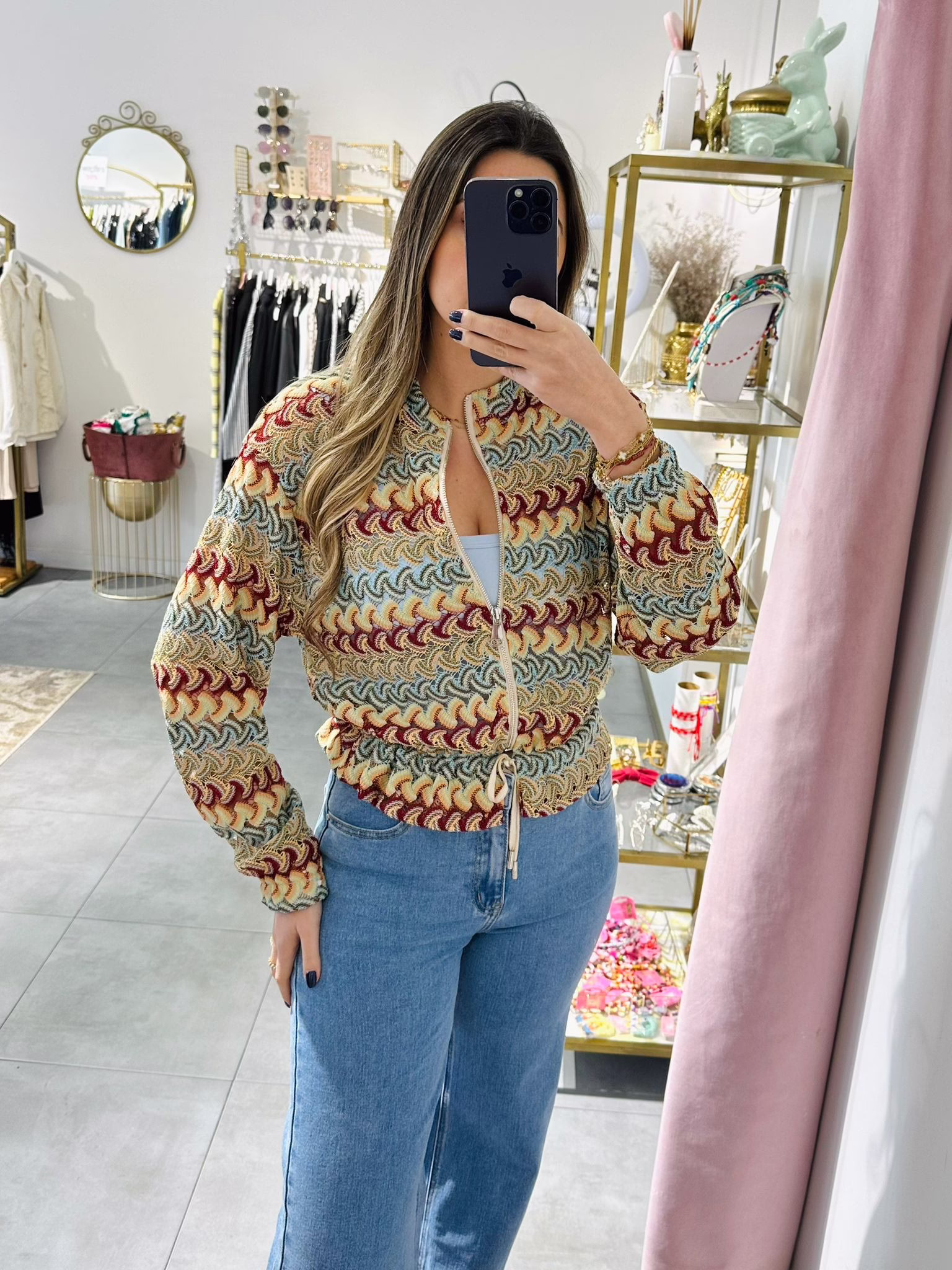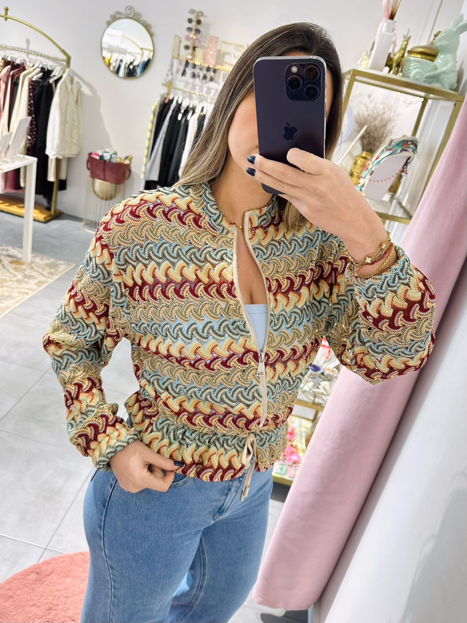 Casaco em rede com várias cores, aperta com fecho e é ajustável na zona da cintura.