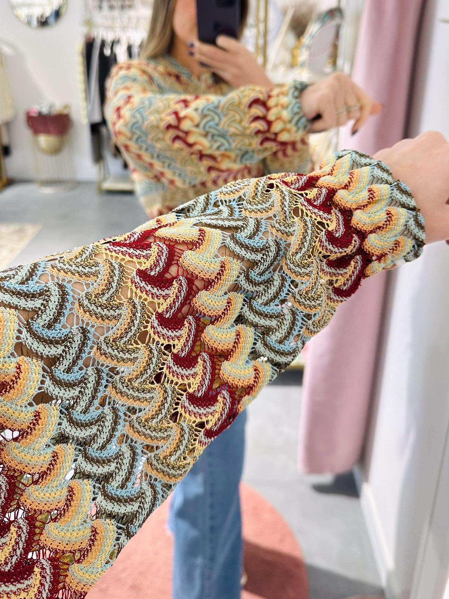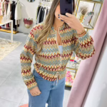 A modelo tem 1,73m e veste o tamanho M/L parte de cima e um 38/40 de parte de baixo.