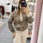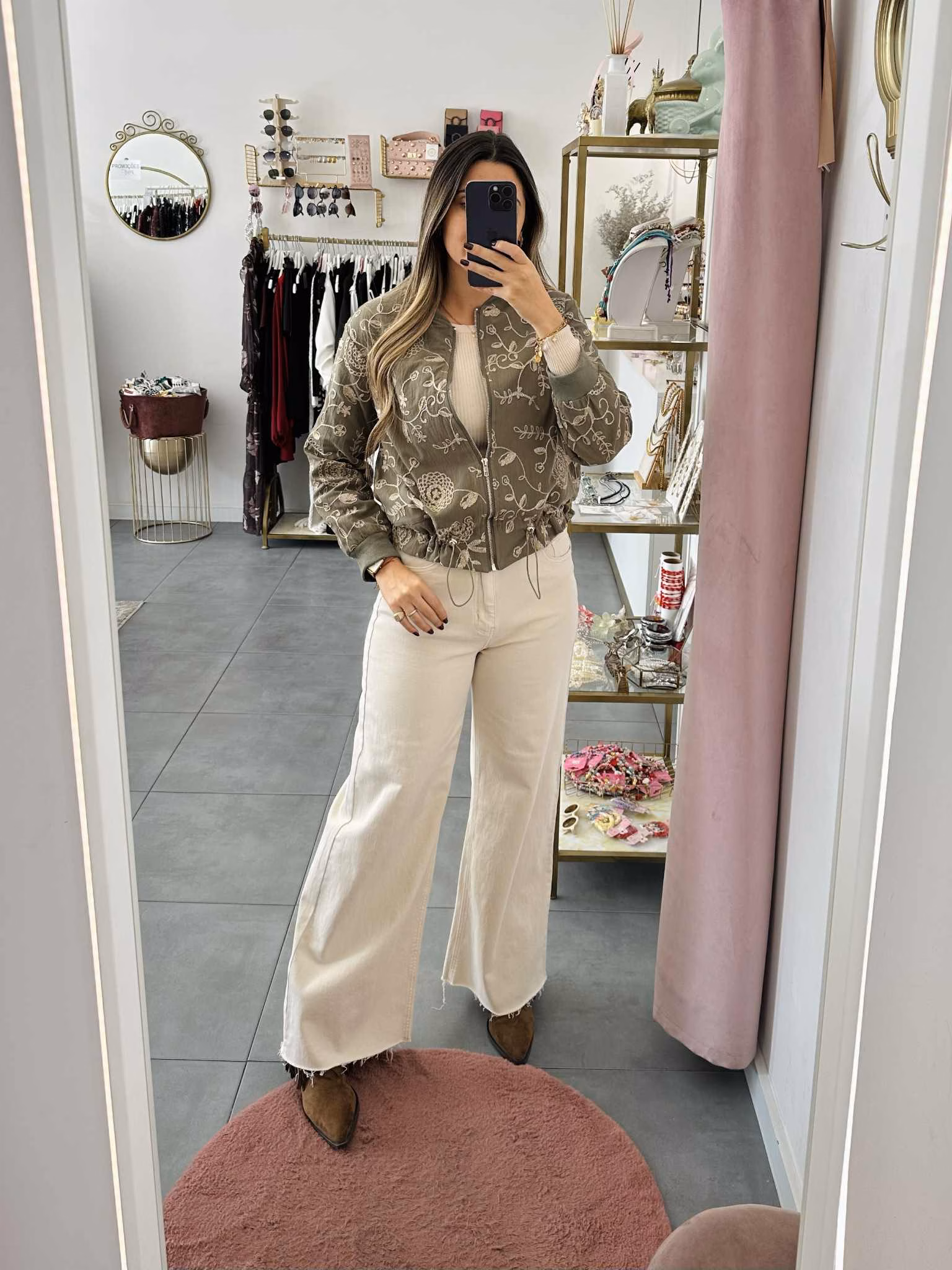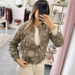 Casaco verde com pormenores dourados, tem bolsos e aperta com fecho. É ajustável na zona da cintura.
