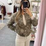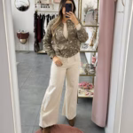 A modelo tem 1,73m e veste o tamanho M/L parte de cima e um 38/40 de parte de baixo.