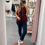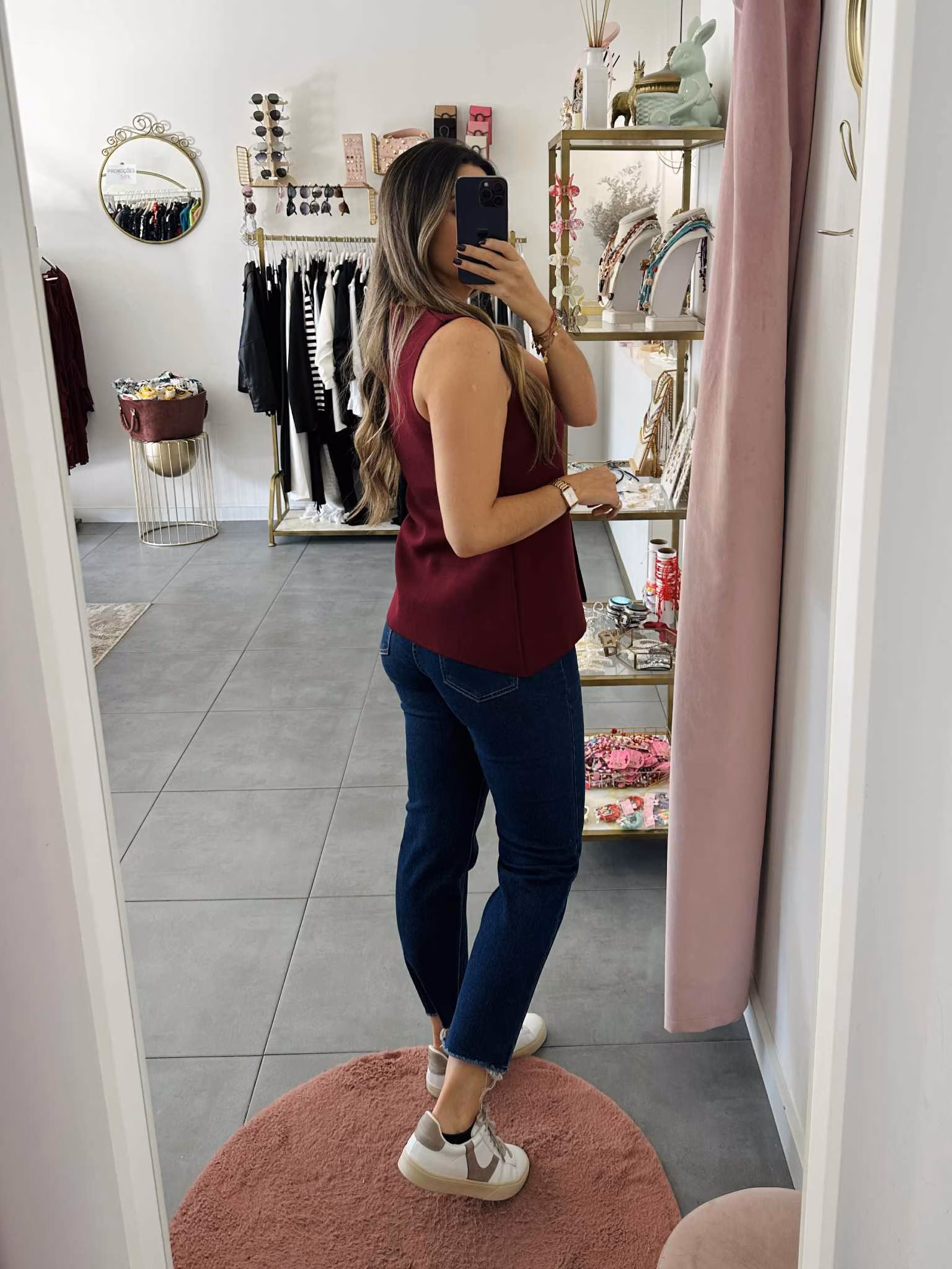 A modelo tem 1,73m e veste o tamanho M/L parte de cima e um 38/40 de parte de baixo.