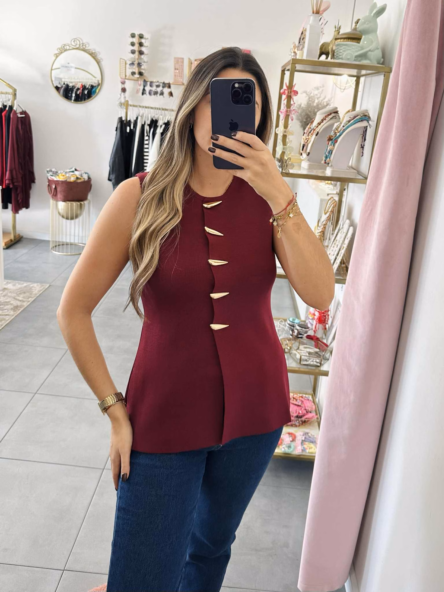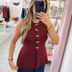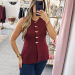 Colete em malha fria estruturada com botões dourados.