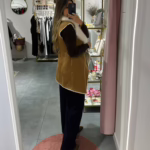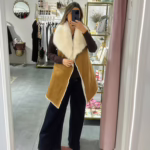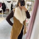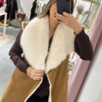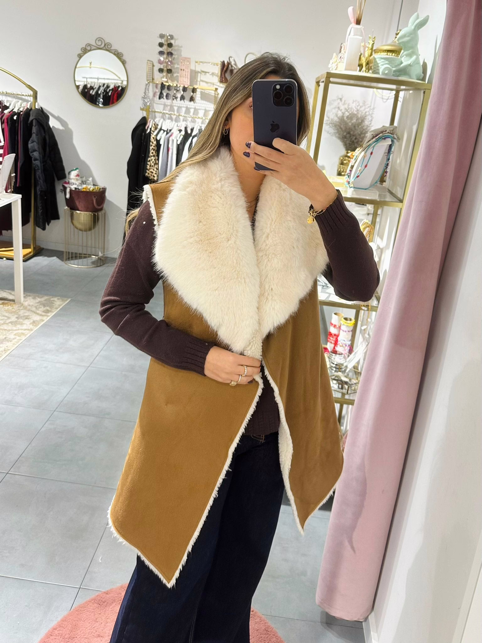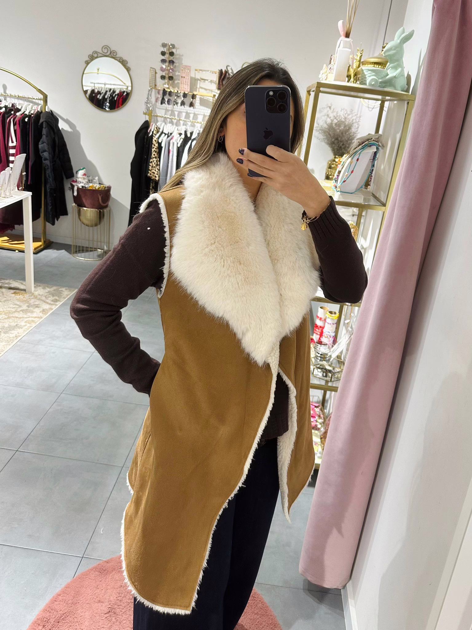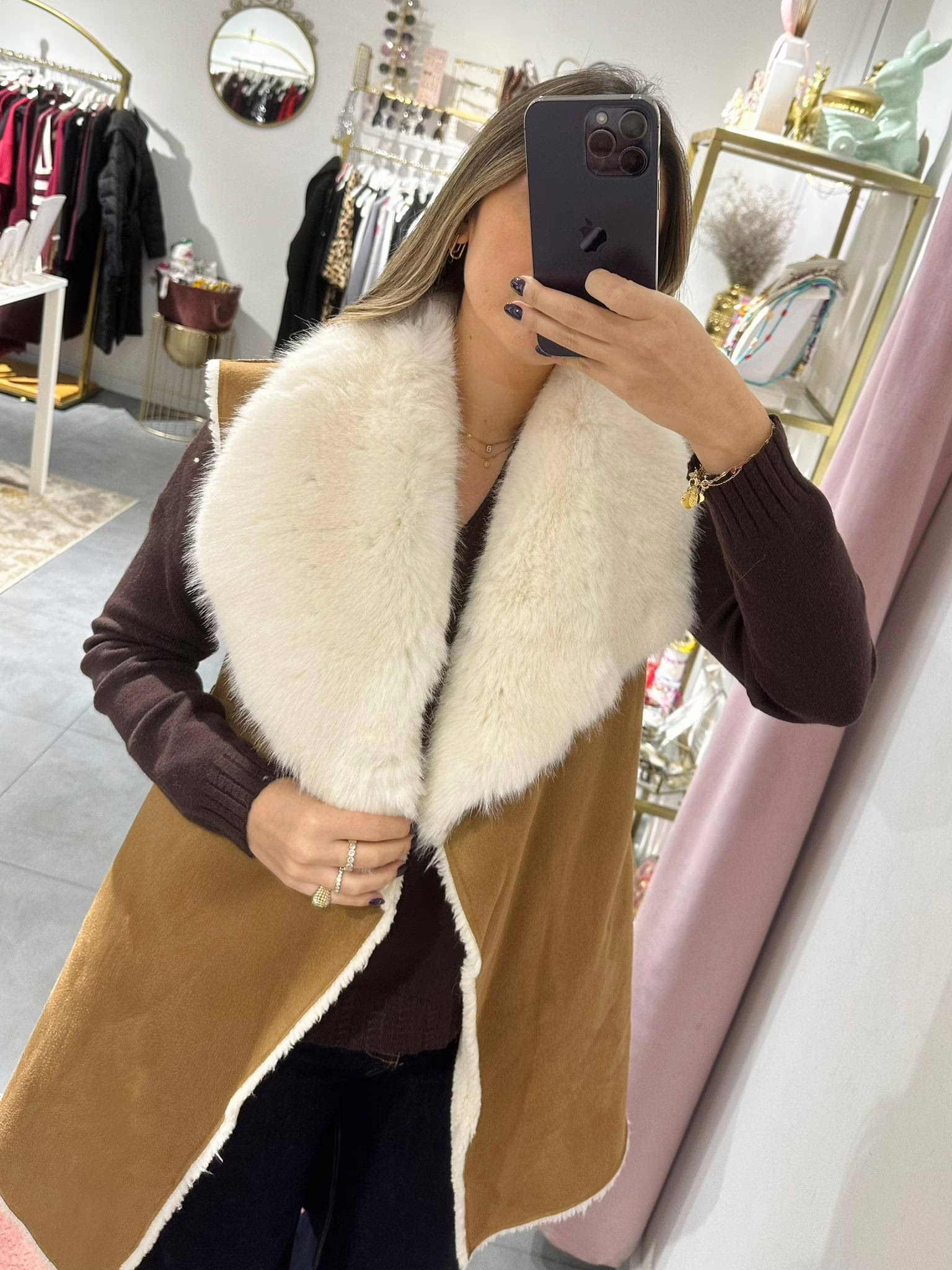 Colete em camurça com gola de pelo, é forrado a pelo, incluí um cinto preto em napa.