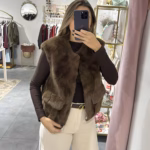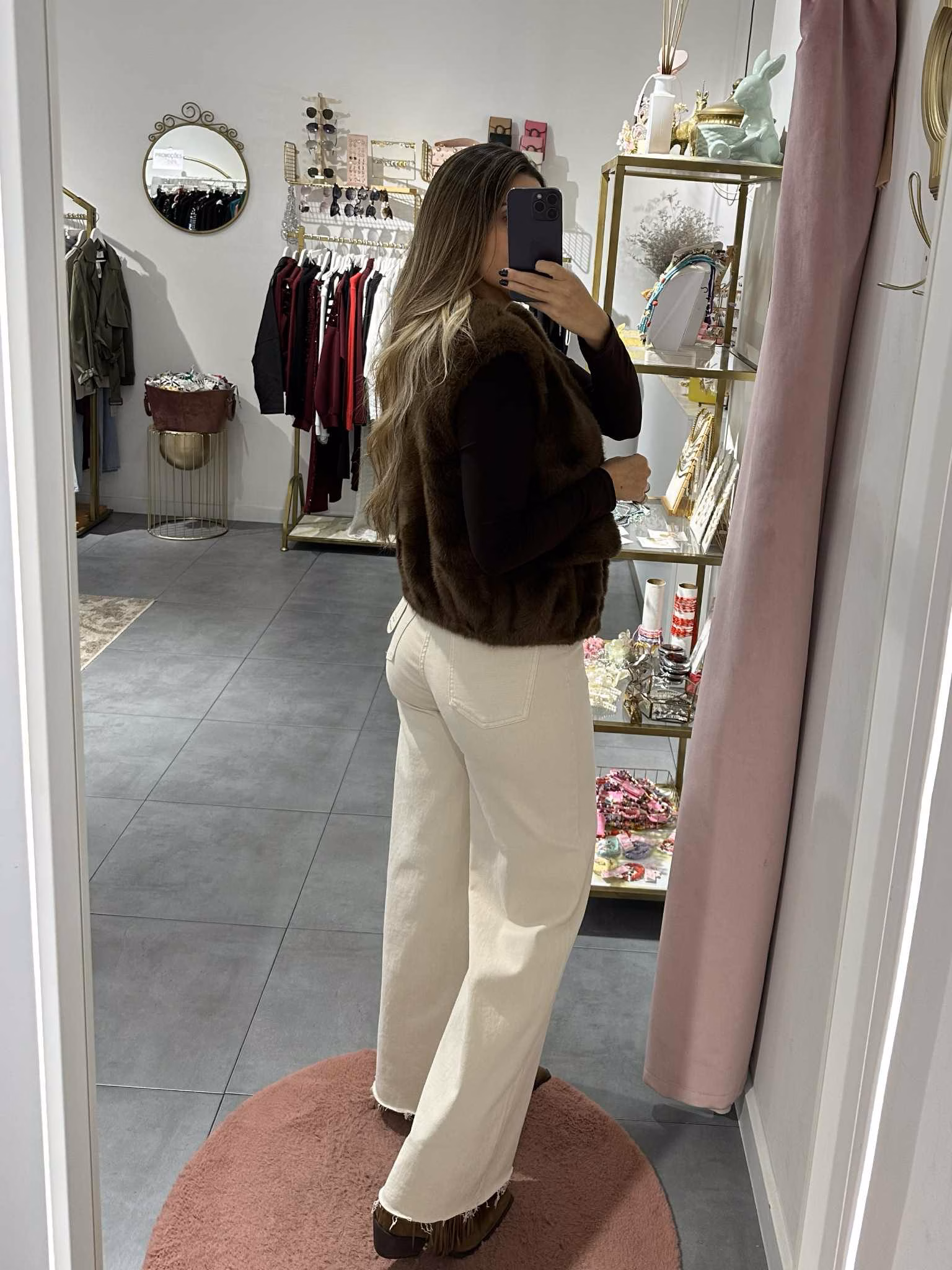 Colete em pelo castanho, tem elástico na zona da cintura, aperta com fecho e tem bolsos.
