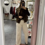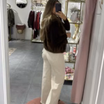 A modelo tem 1,73m e veste o tamanho M/L parte de cima e um 38/40 de parte de baixo.