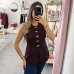 Colete em malha fria estruturada com botões dourados.