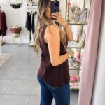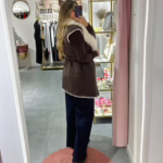 A modelo tem 1,73m e veste o tamanho M/L parte de cima e um 38/40 de parte de baixo.