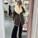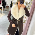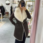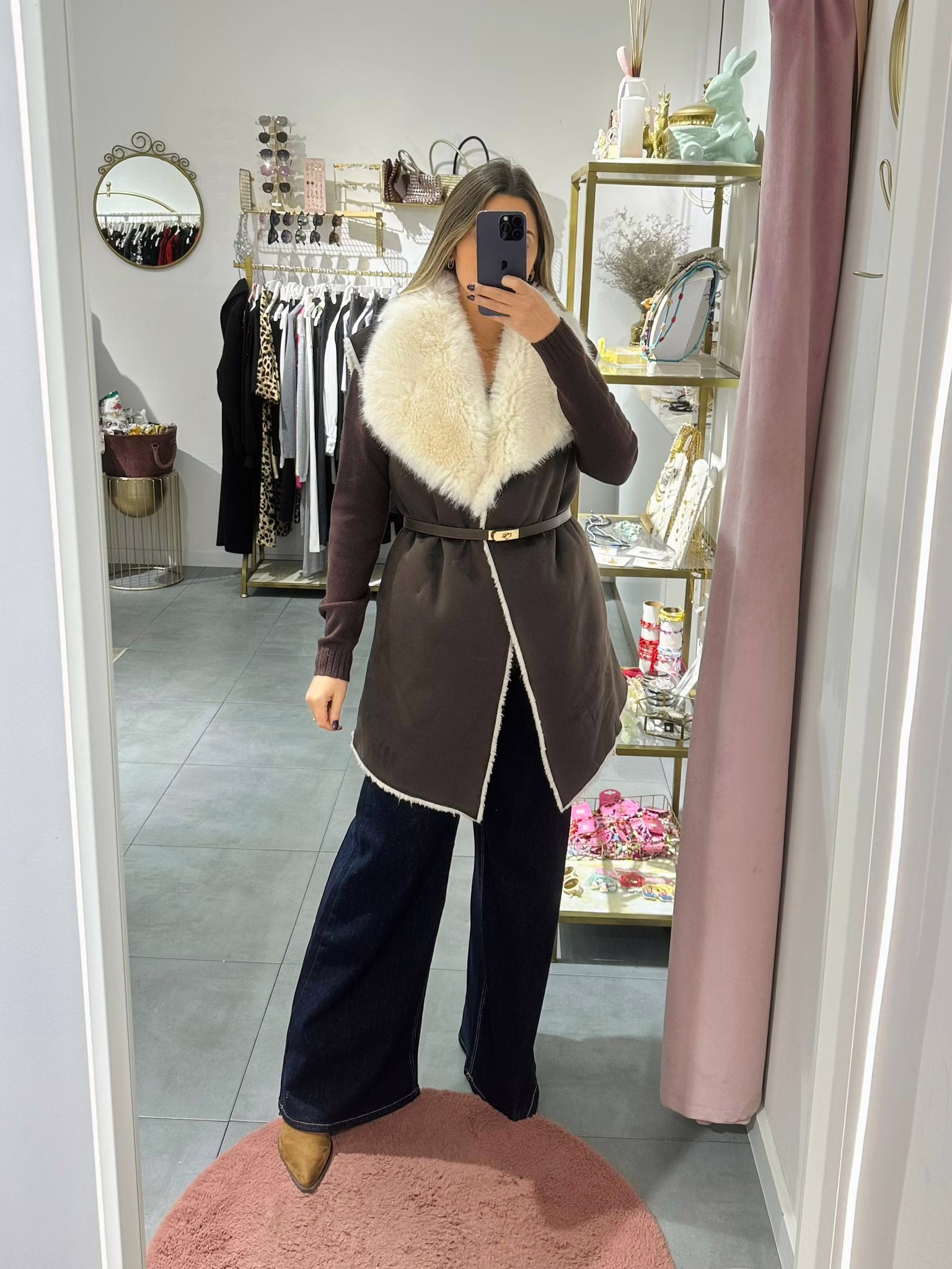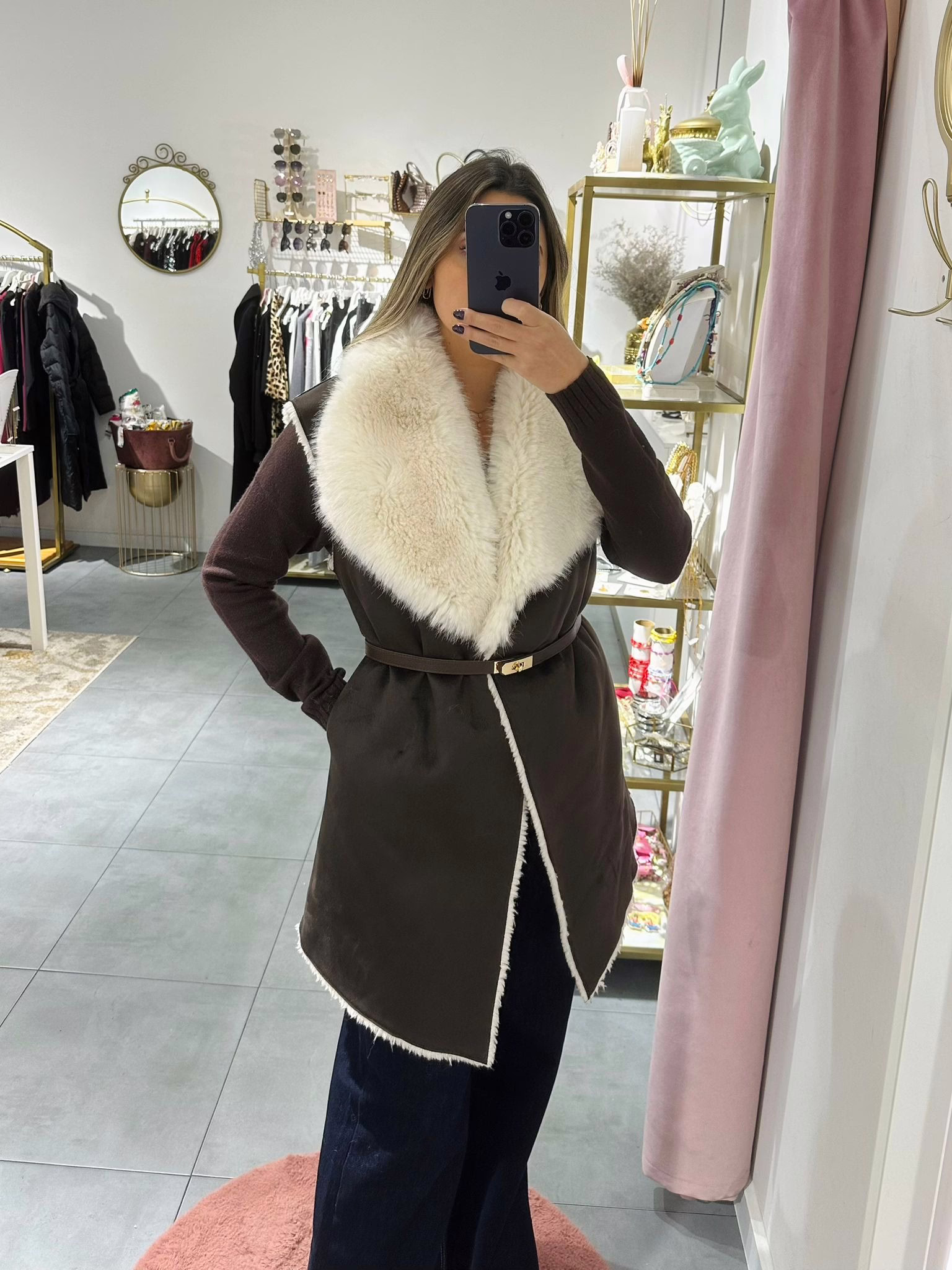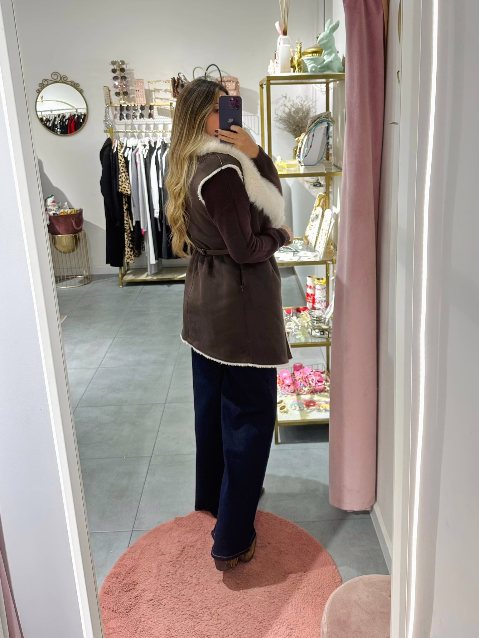 Colete em camurça com gola de pelo, é forrado a pelo, incluí um cinto preto em napa.