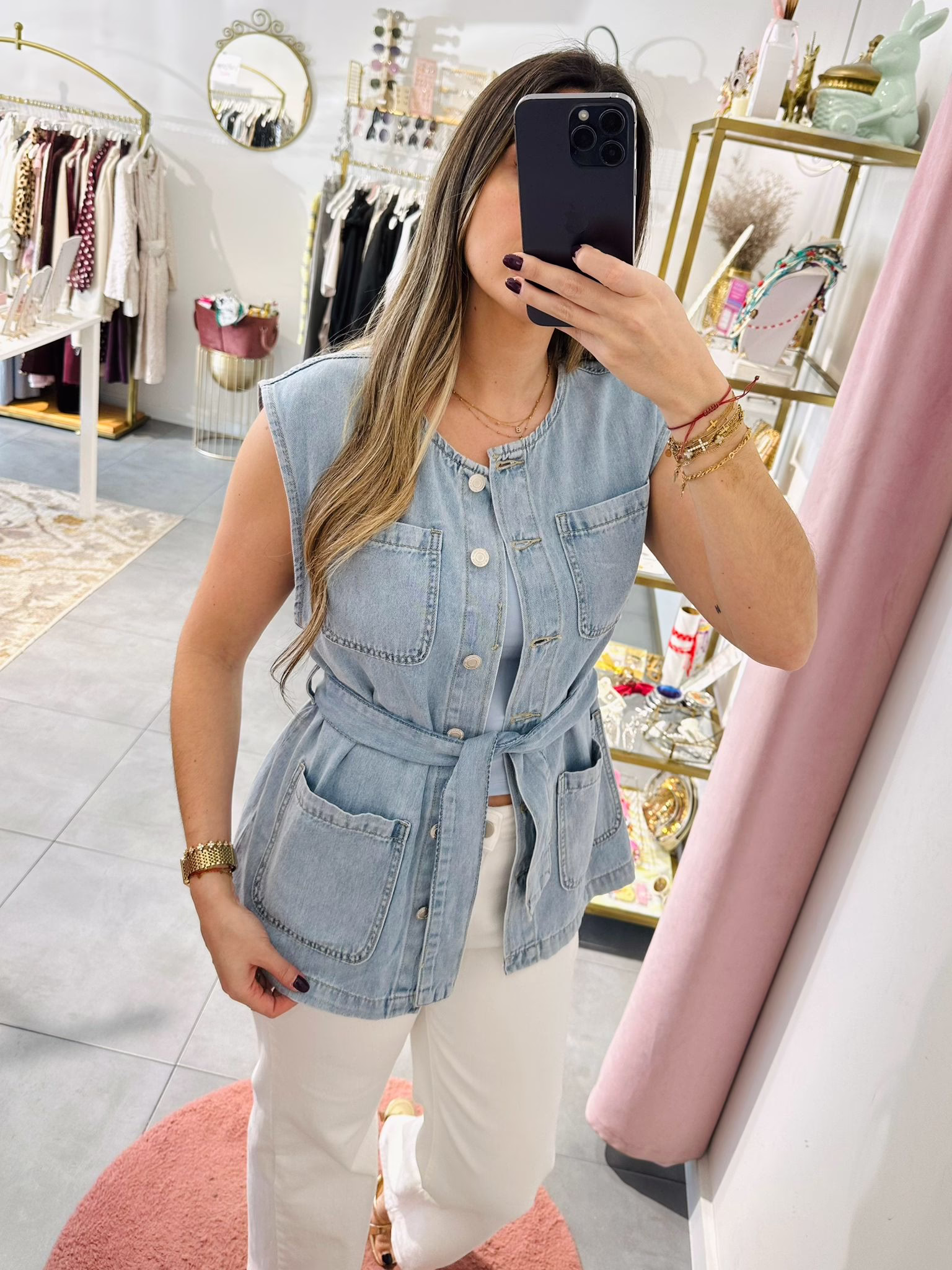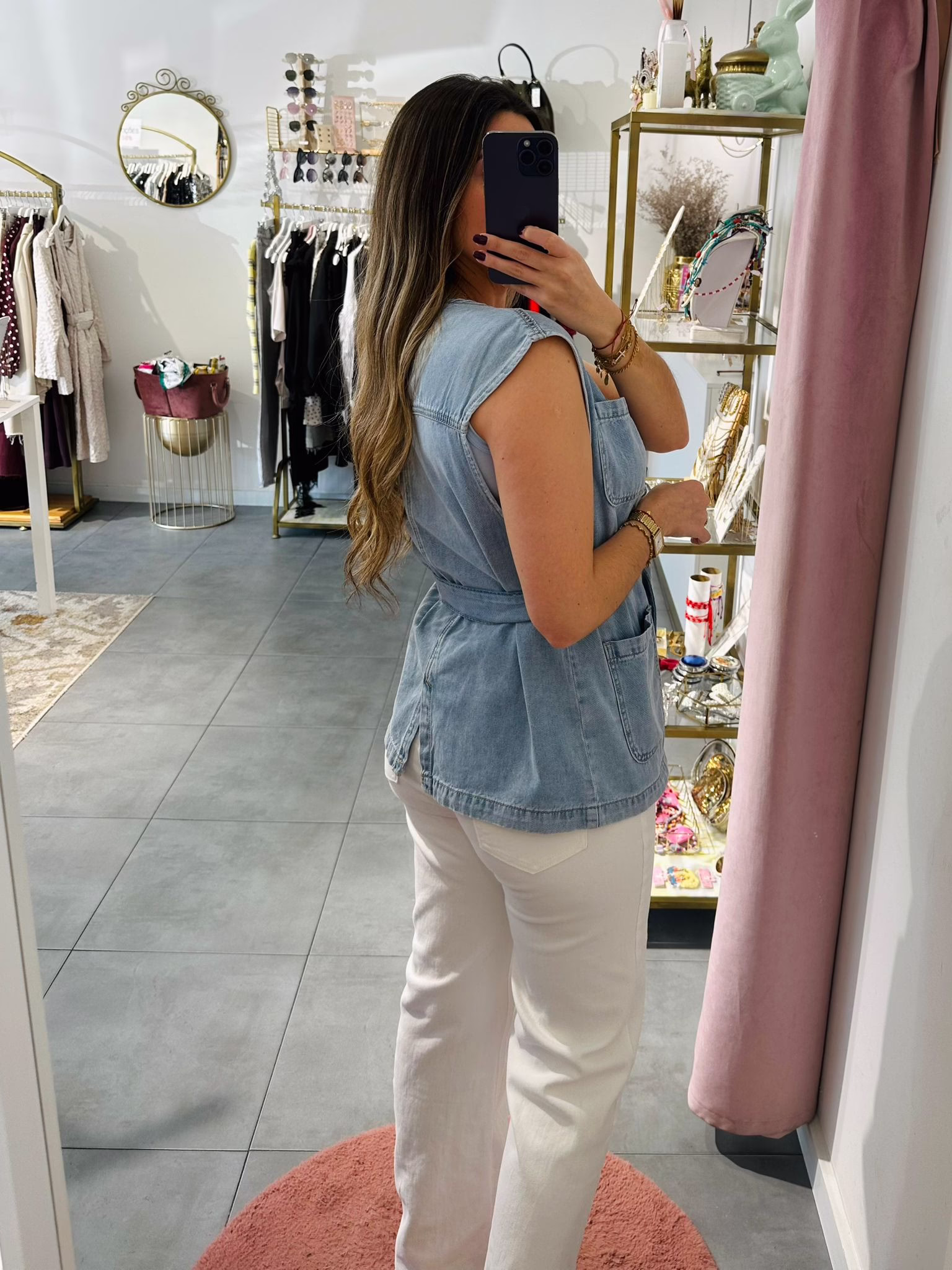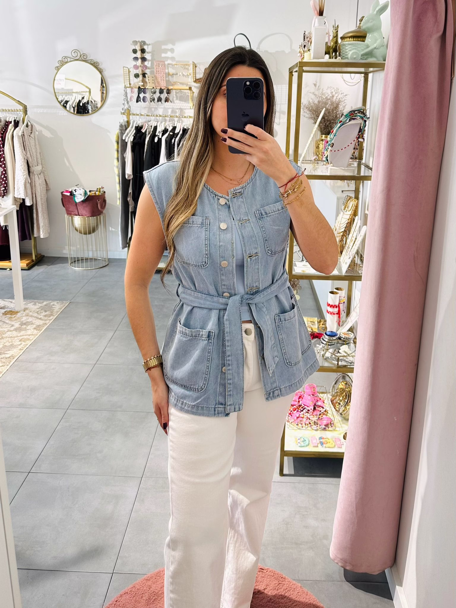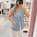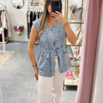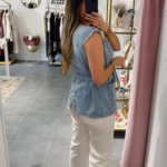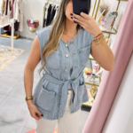 A modelo tem 1,73m e veste o tamanho M/L parte de cima e um 38/40 de parte de baixo.