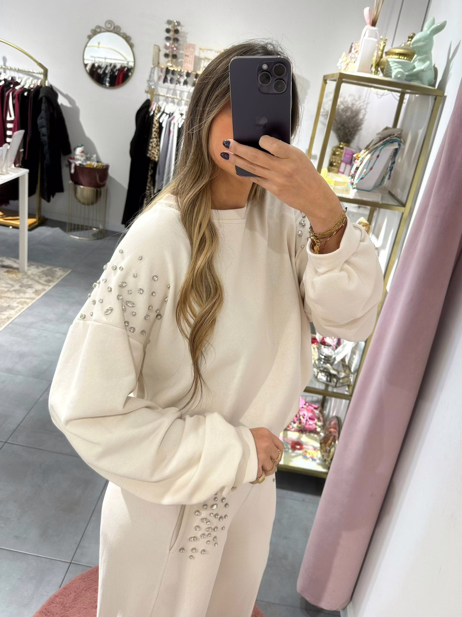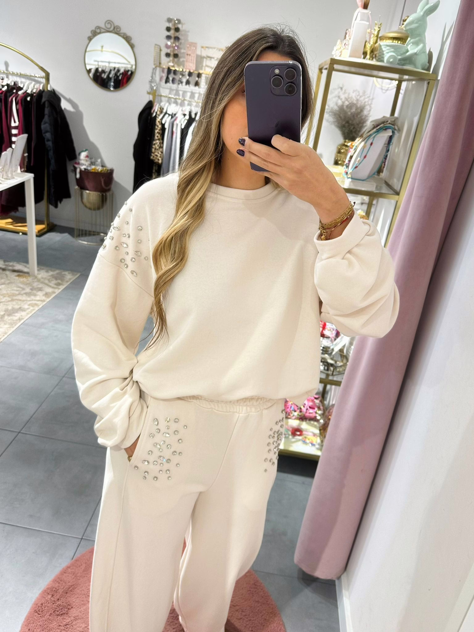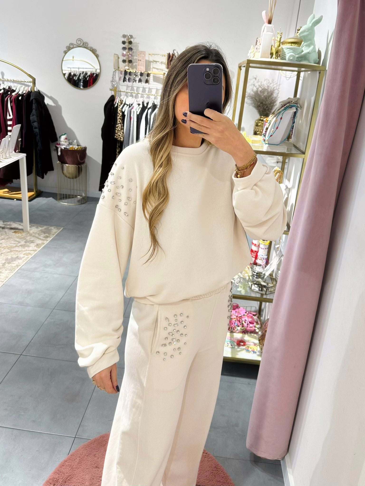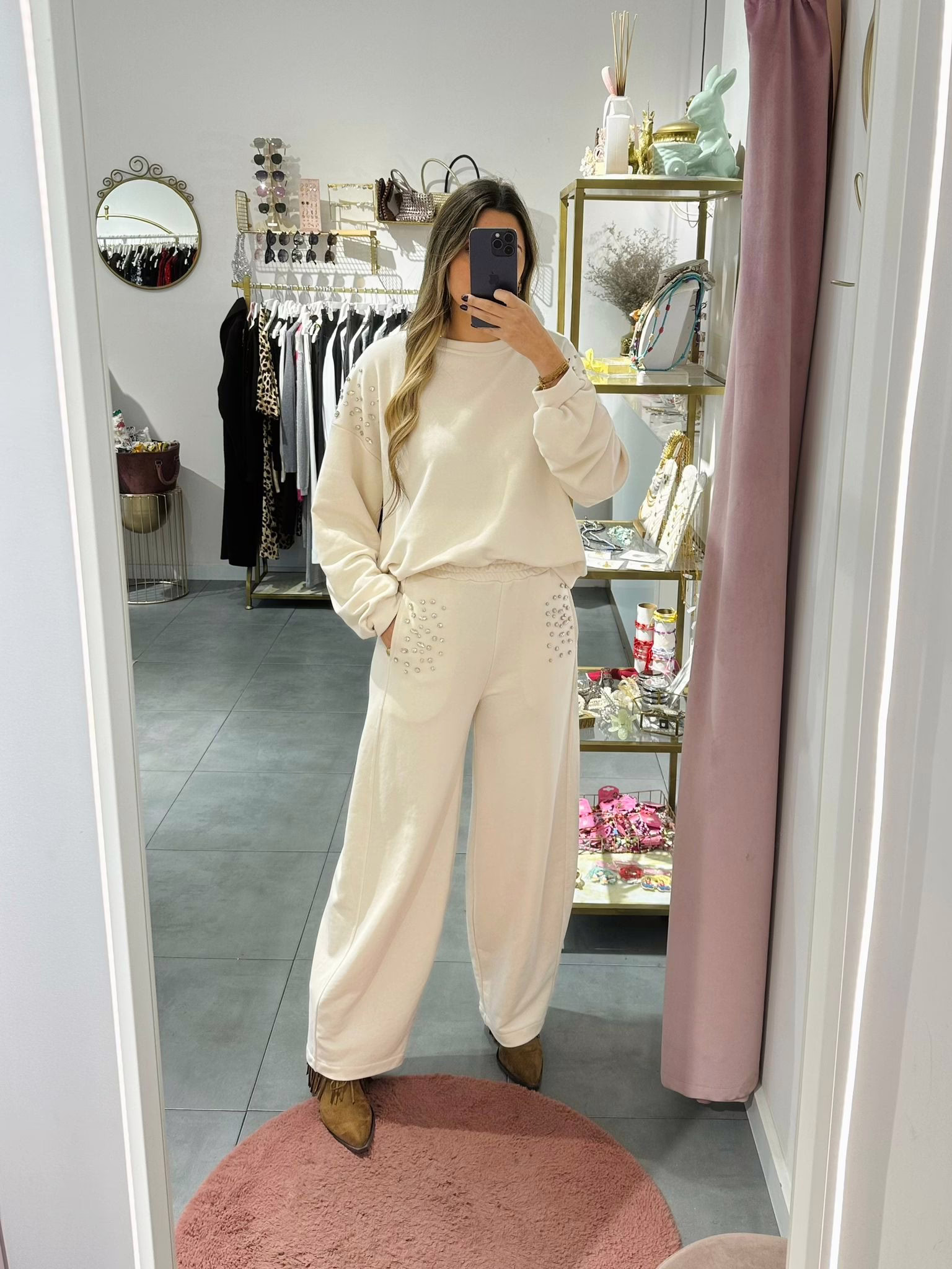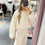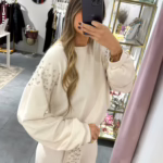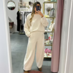 A modelo tem 1,73m e veste o tamanho M/L parte de cima e um 38/40 de parte de baixo.