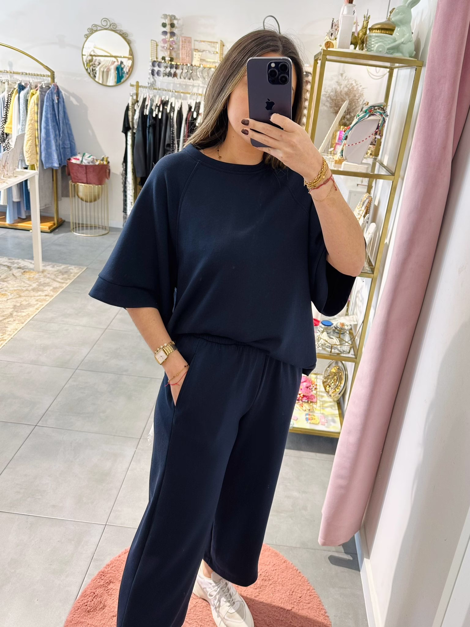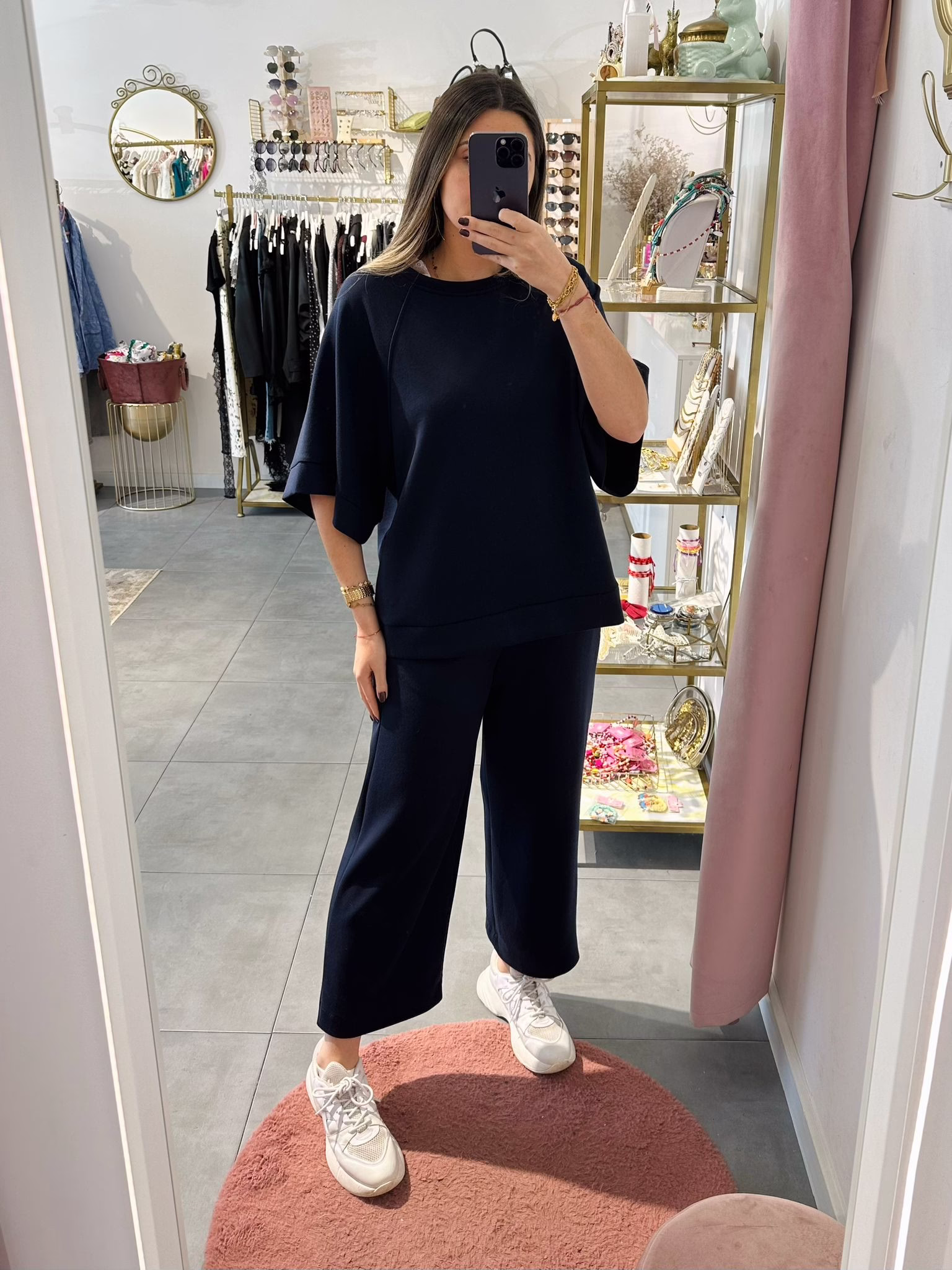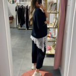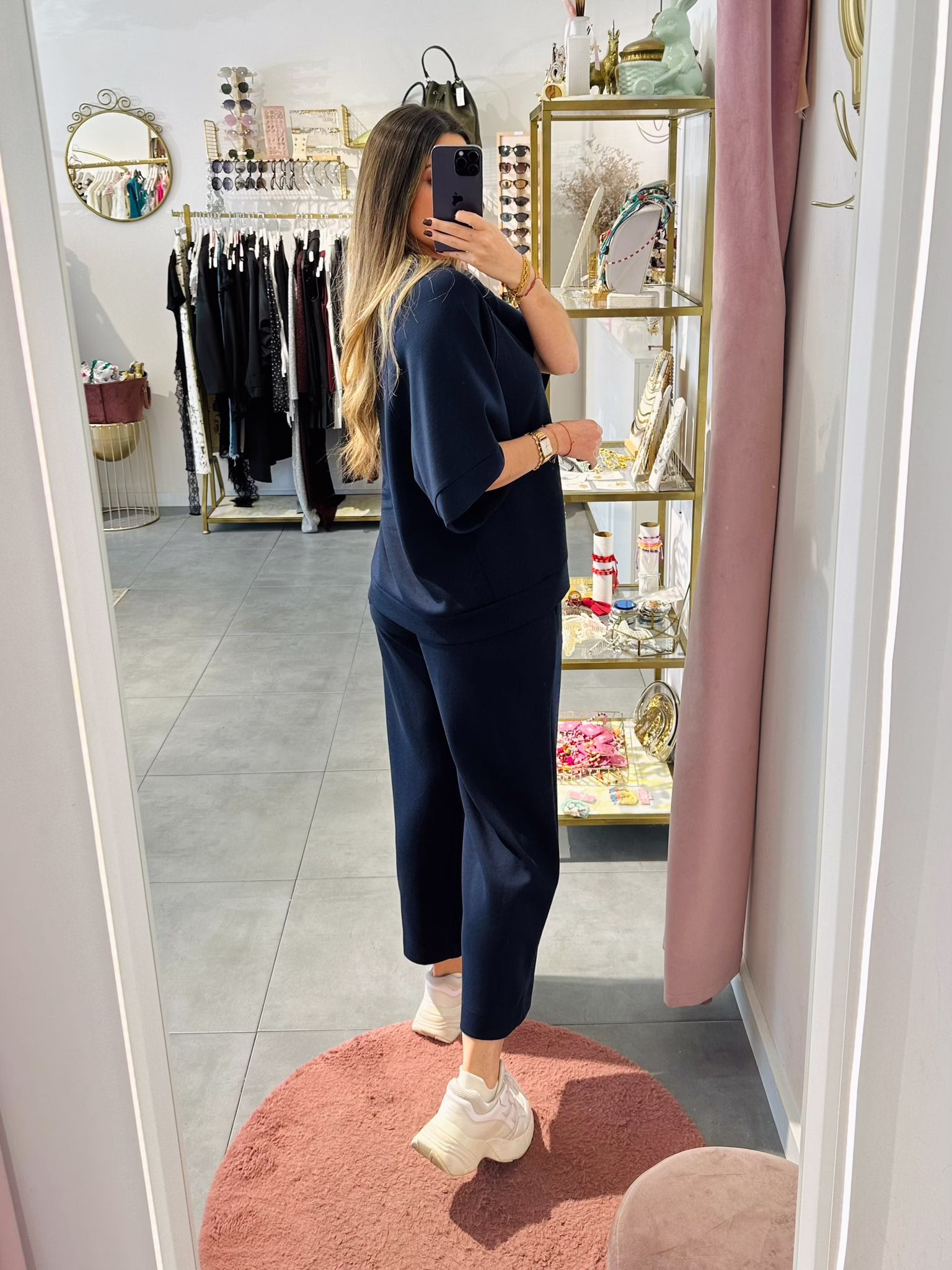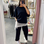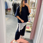 A modelo tem 1,73m e veste o tamanho M/L parte de cima e um 38/40 de parte de baixo.
