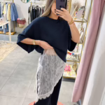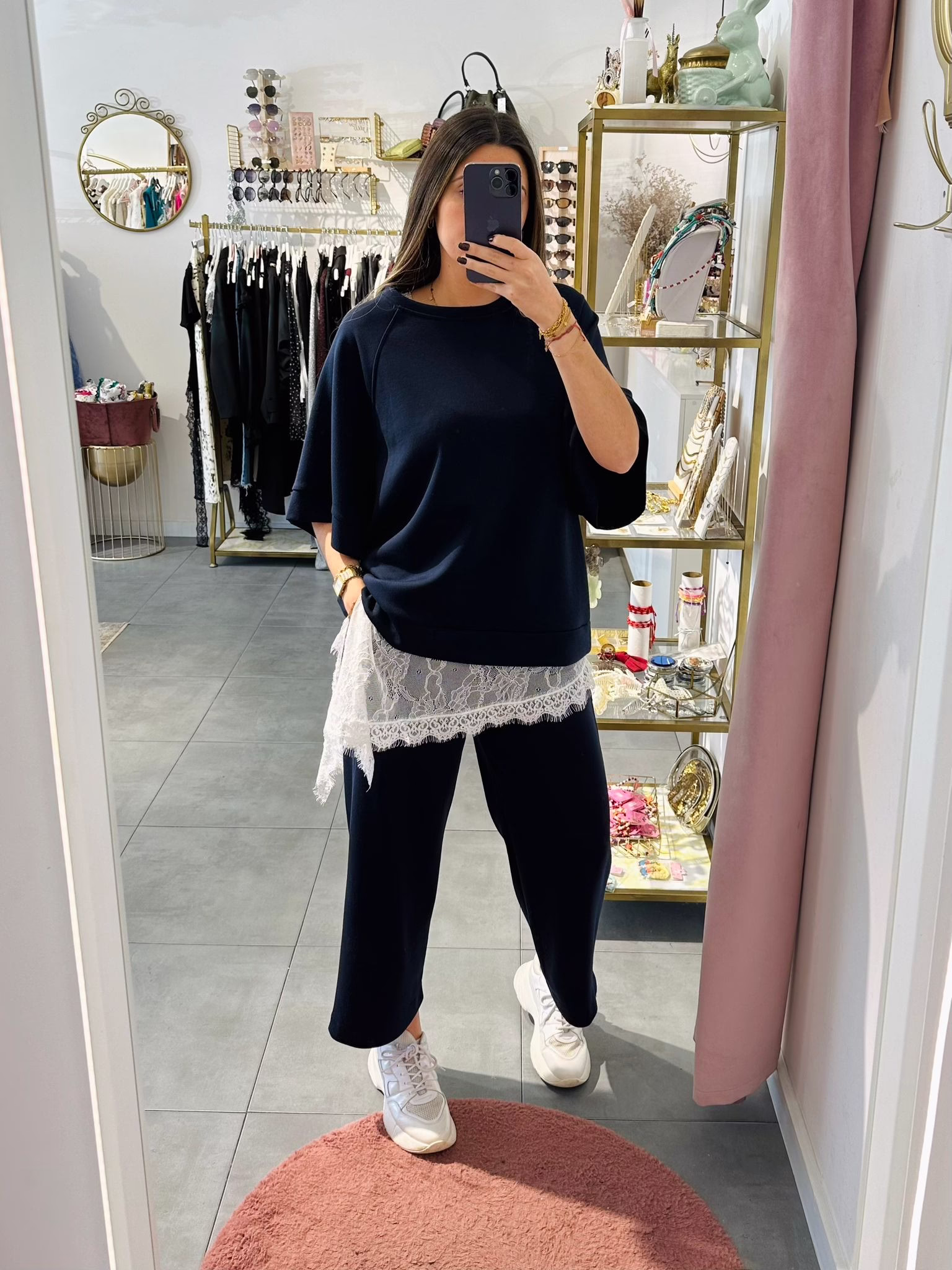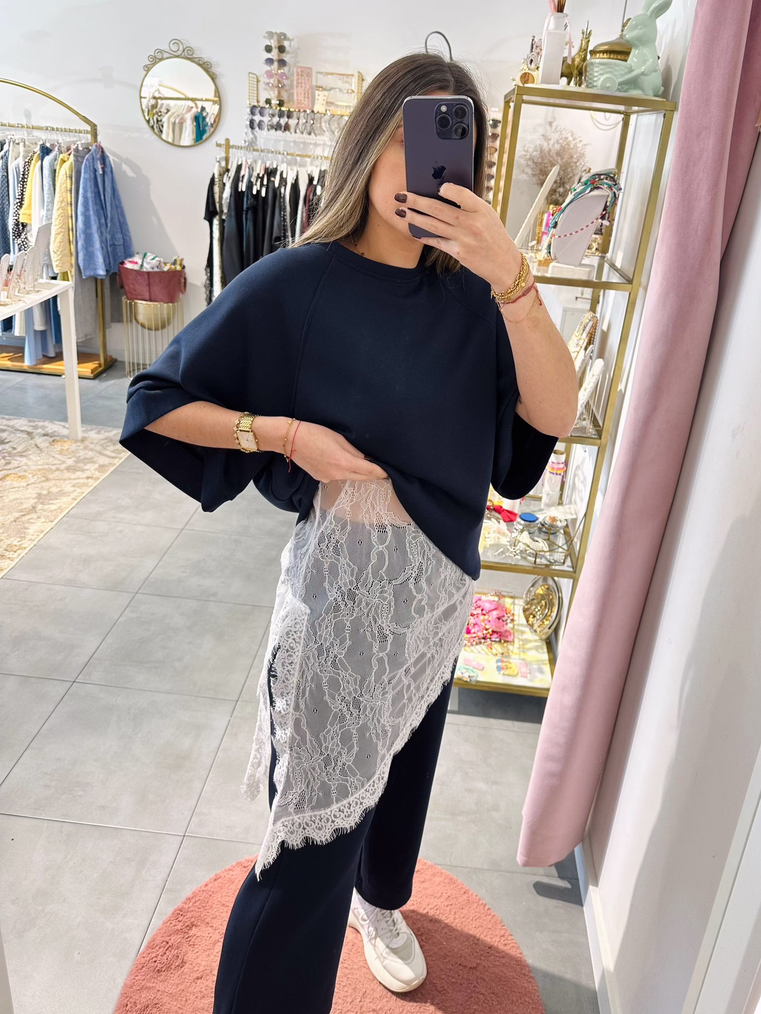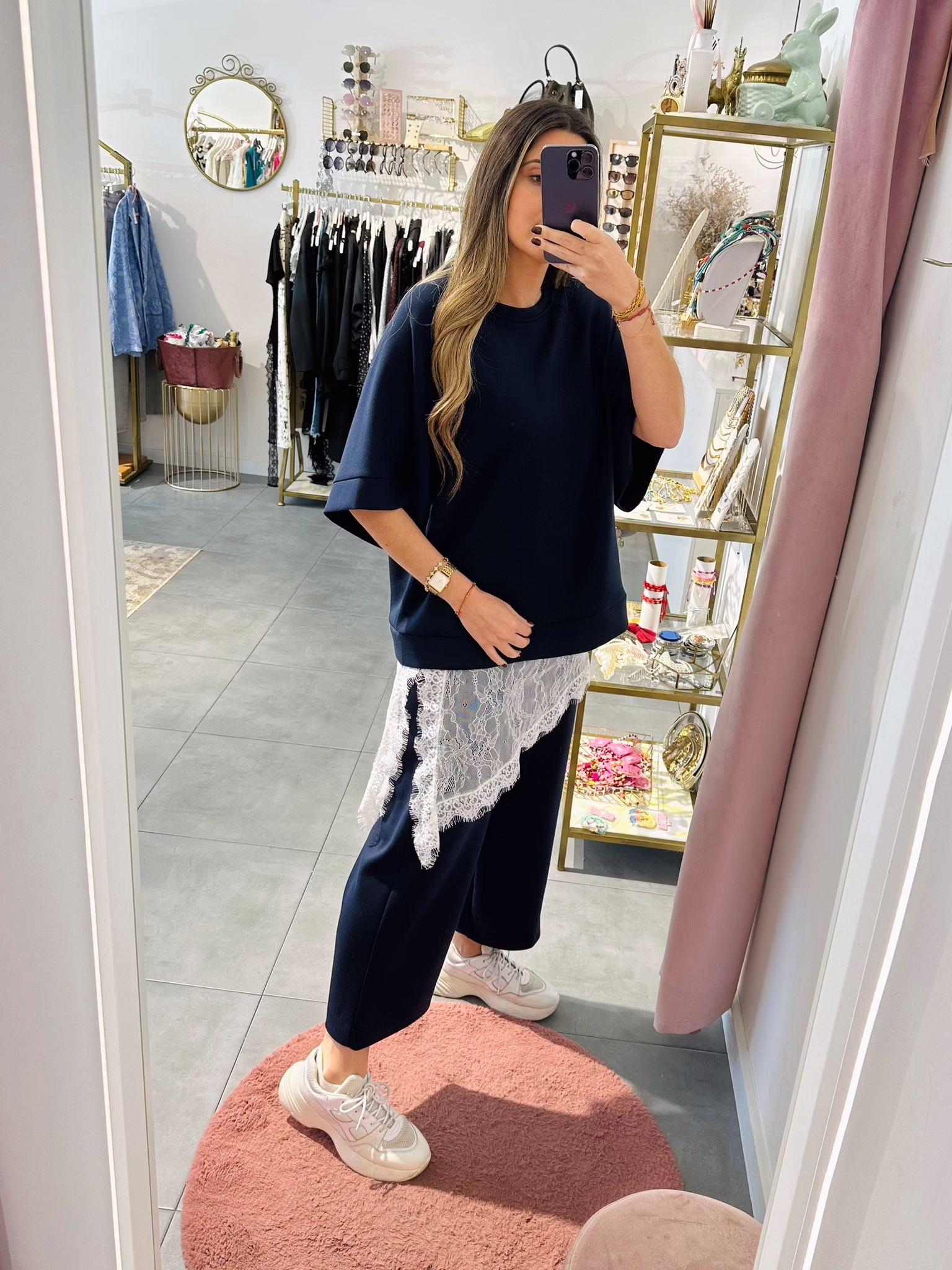 A modelo tem 1,73m e veste o tamanho M/L parte de cima e um 38/40 de parte de baixo.