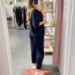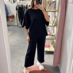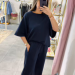 Conjunto de camisola oversize e calça curta. As calças tem elástico na cintura e bolsos.