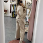A modelo tem 1,73m e veste o tamanho M/L parte de cima e um 38/40 de parte de baixo.