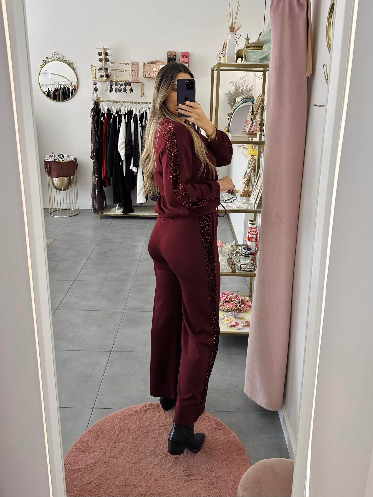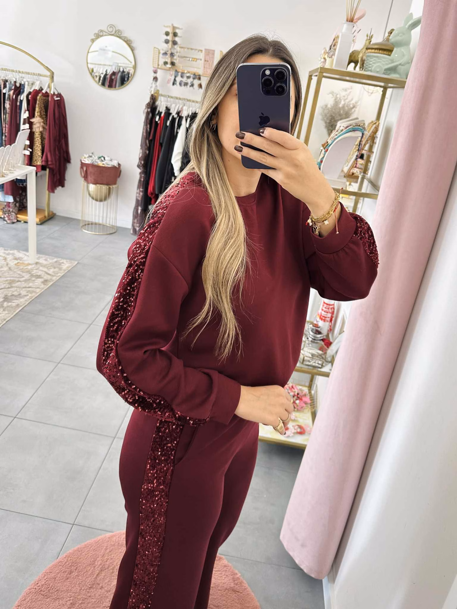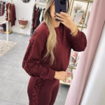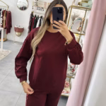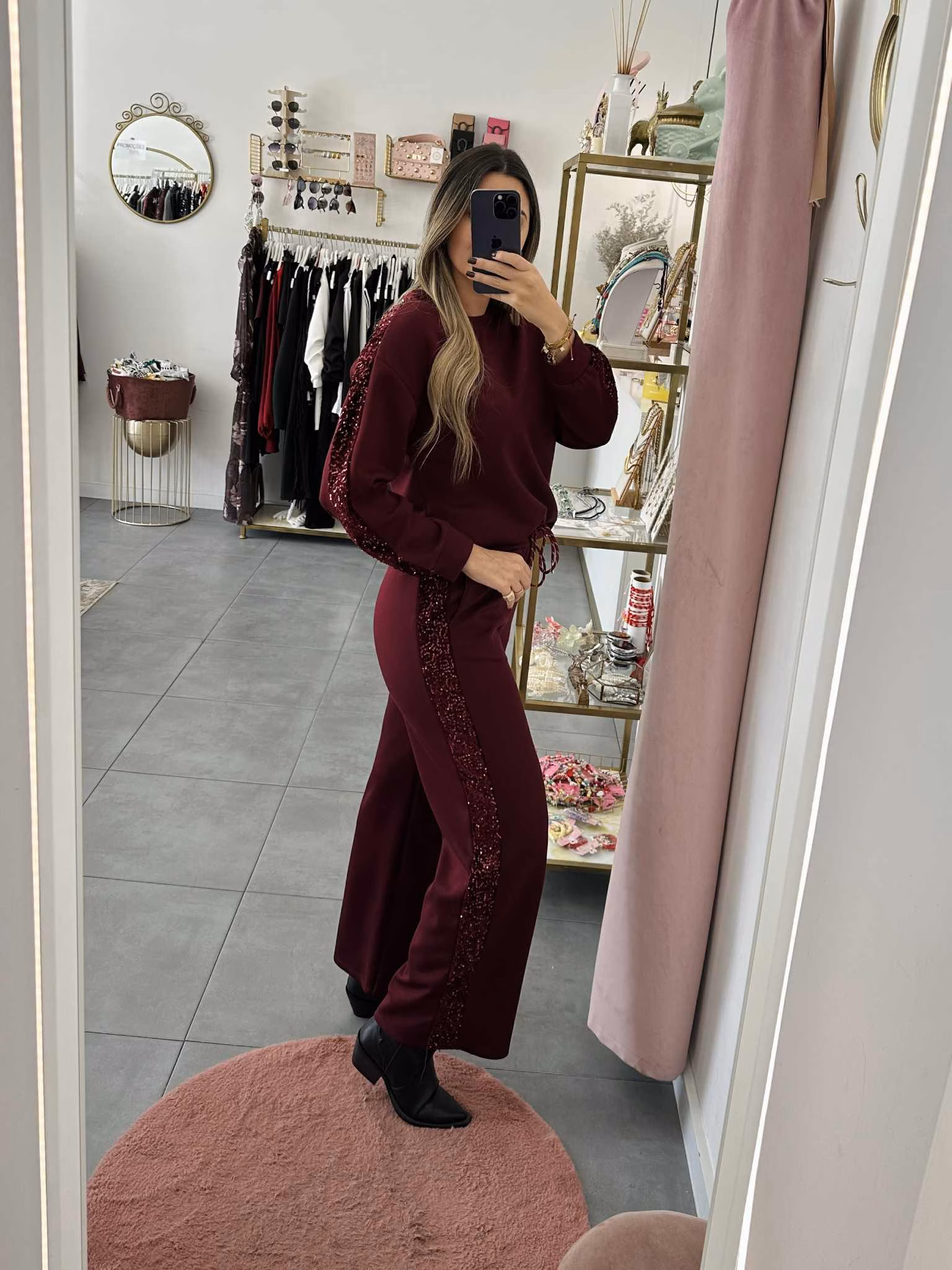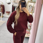 Conjunto de calça e sweat com laterais em lantejoulas.