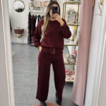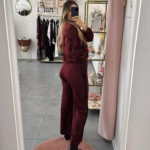 A modelo tem 1,73m e veste o tamanho M/L parte de cima e um 38/40 de parte de baixo.