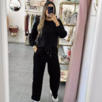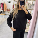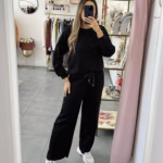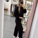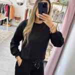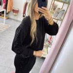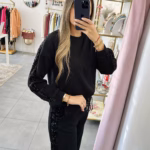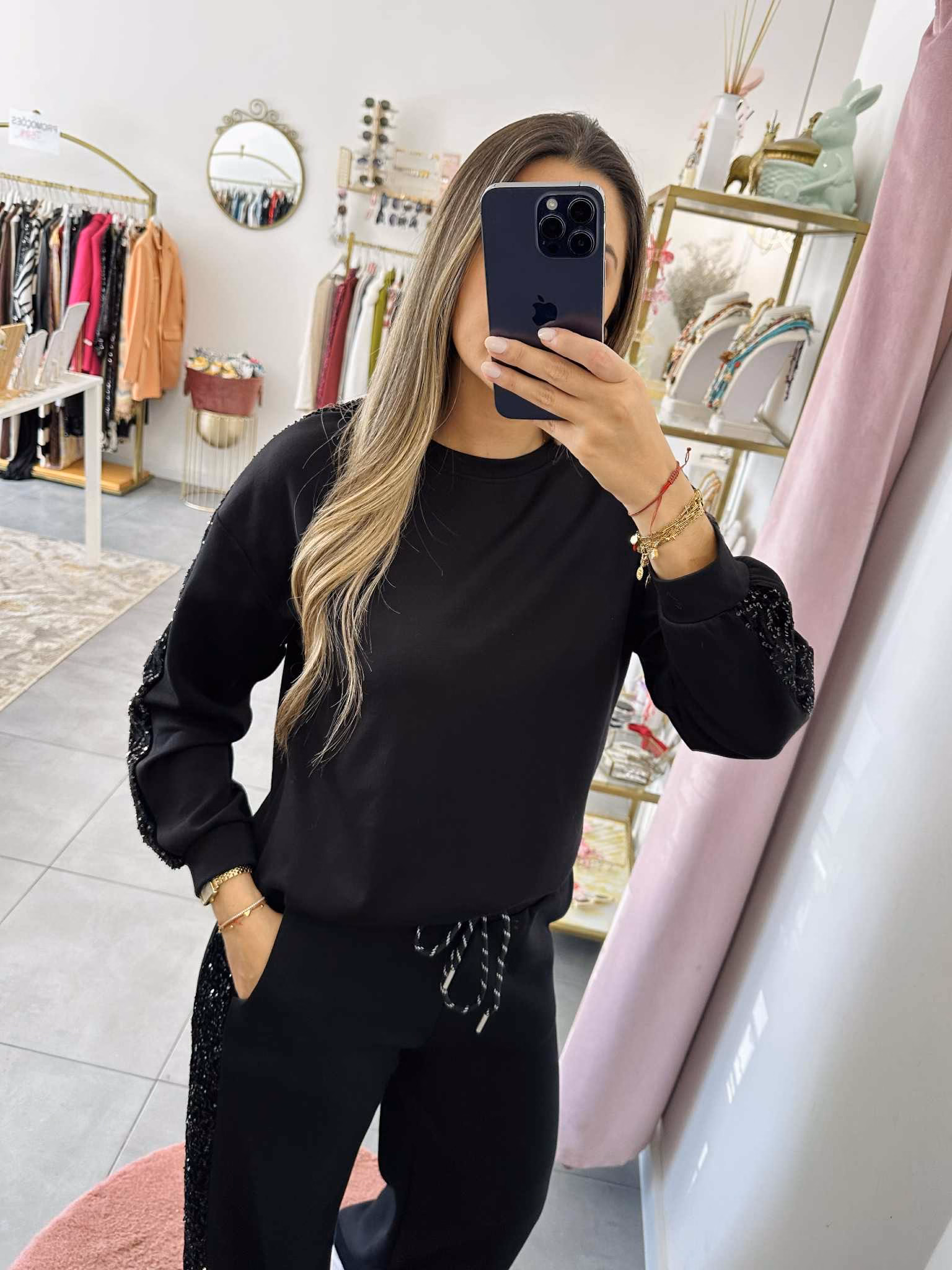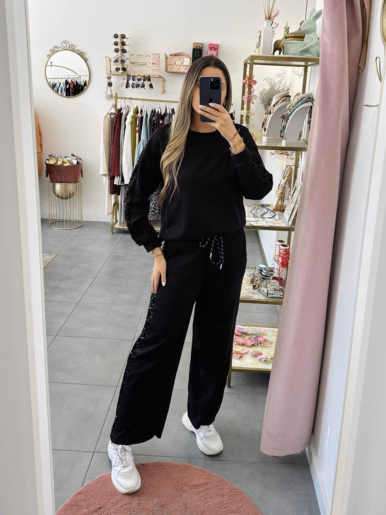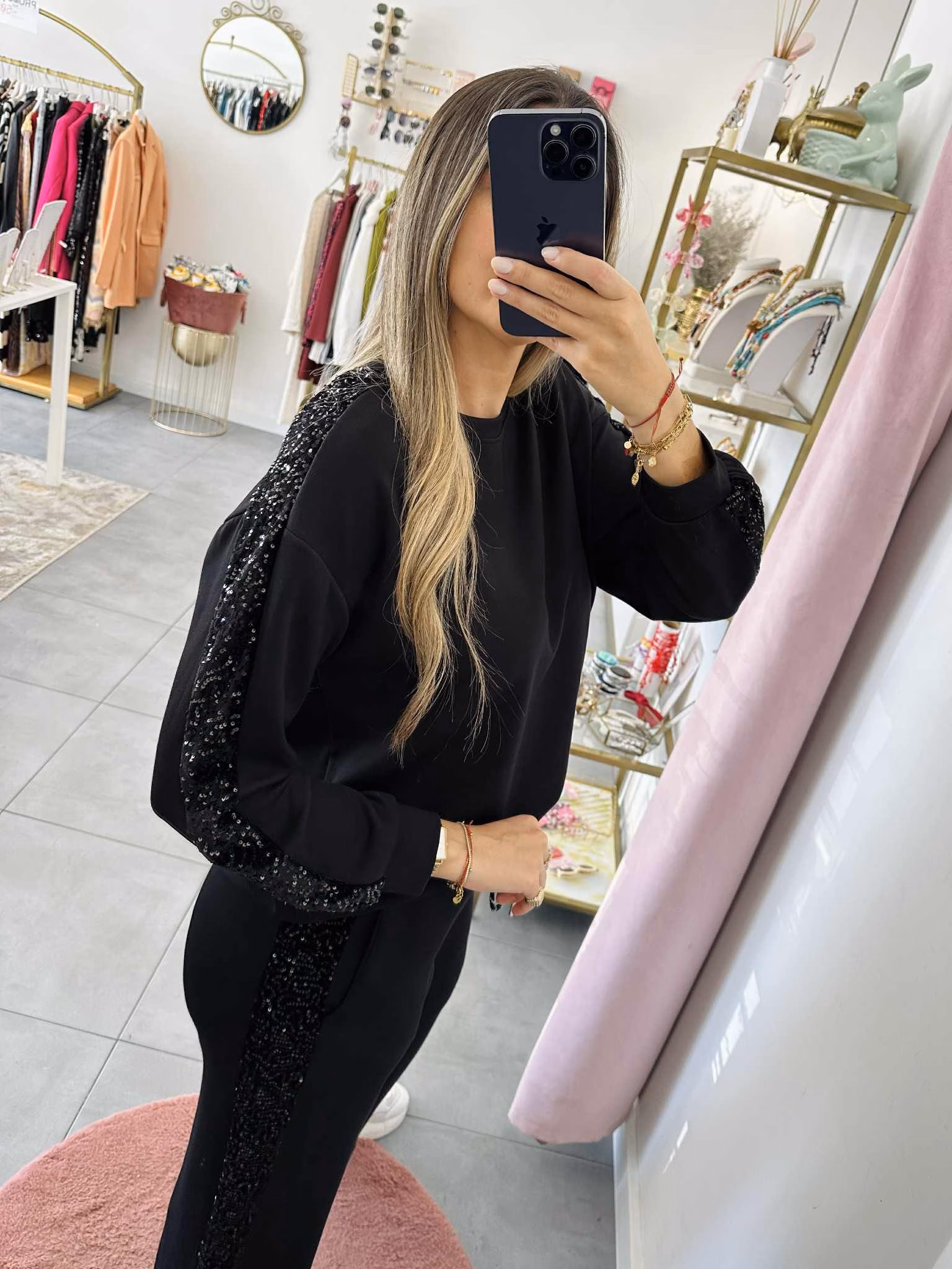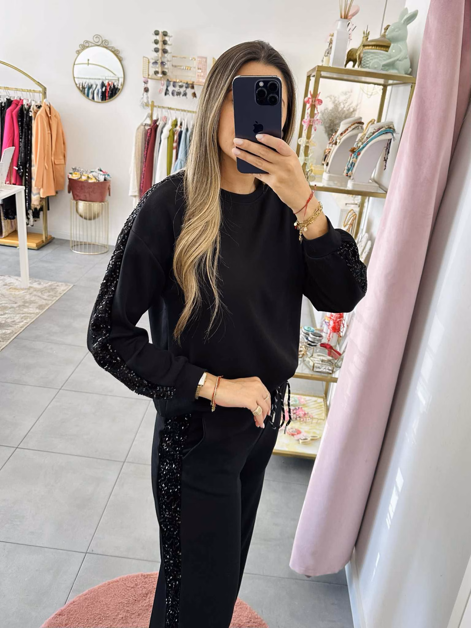 Conjunto de calça e sweat com laterais em lantejoulas.