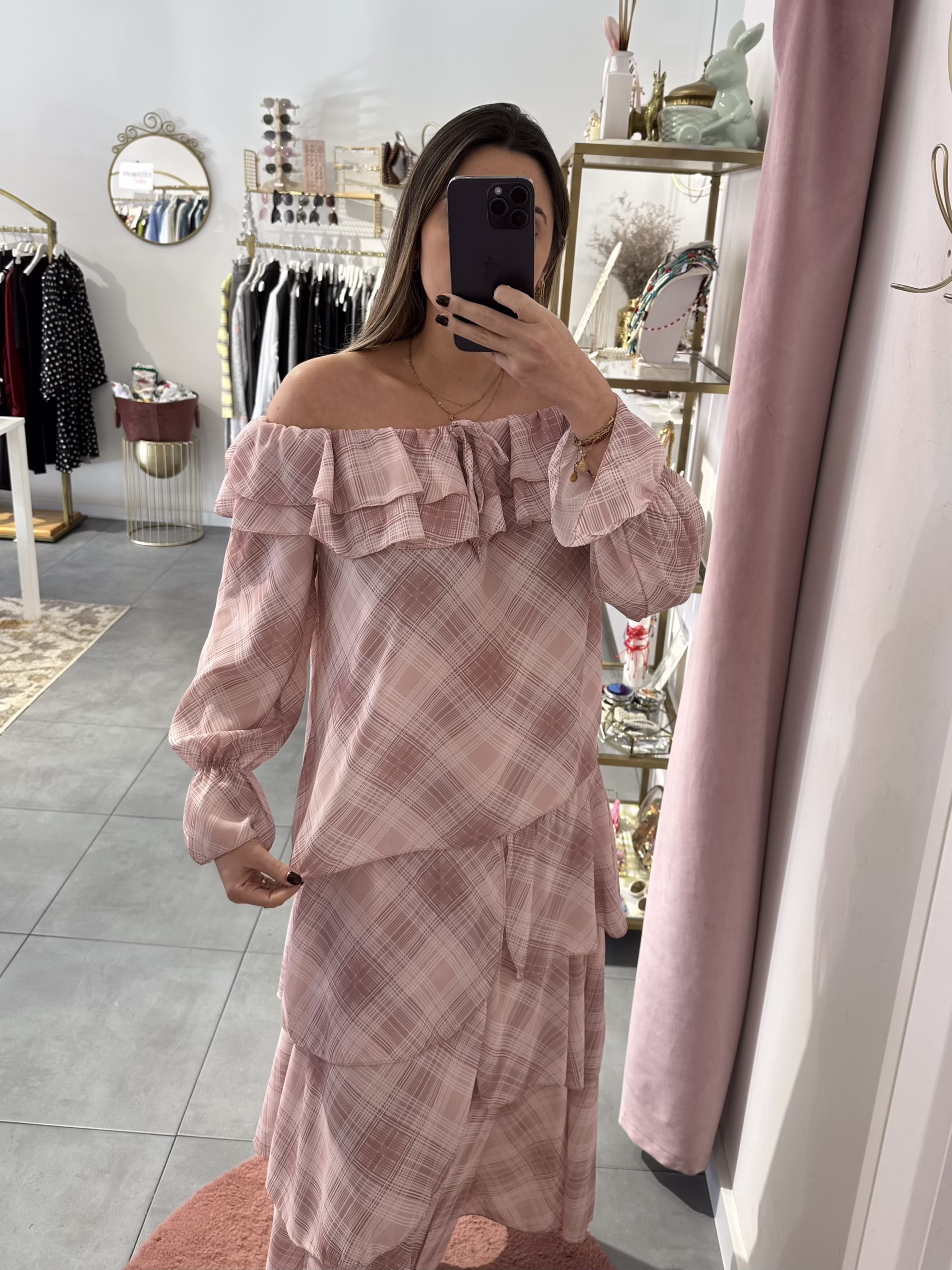 Conjunto de saia e top. A saia tem elástico na cintura.