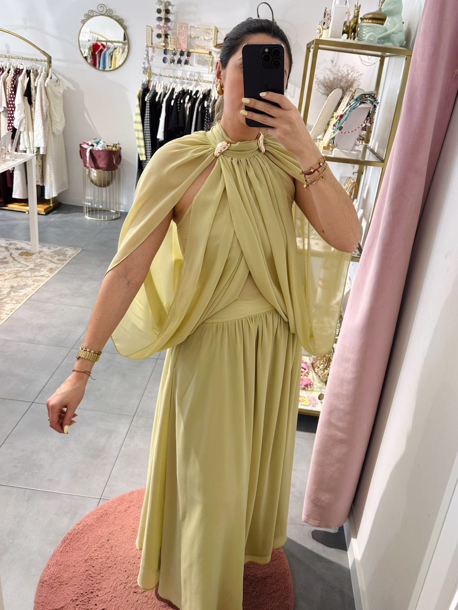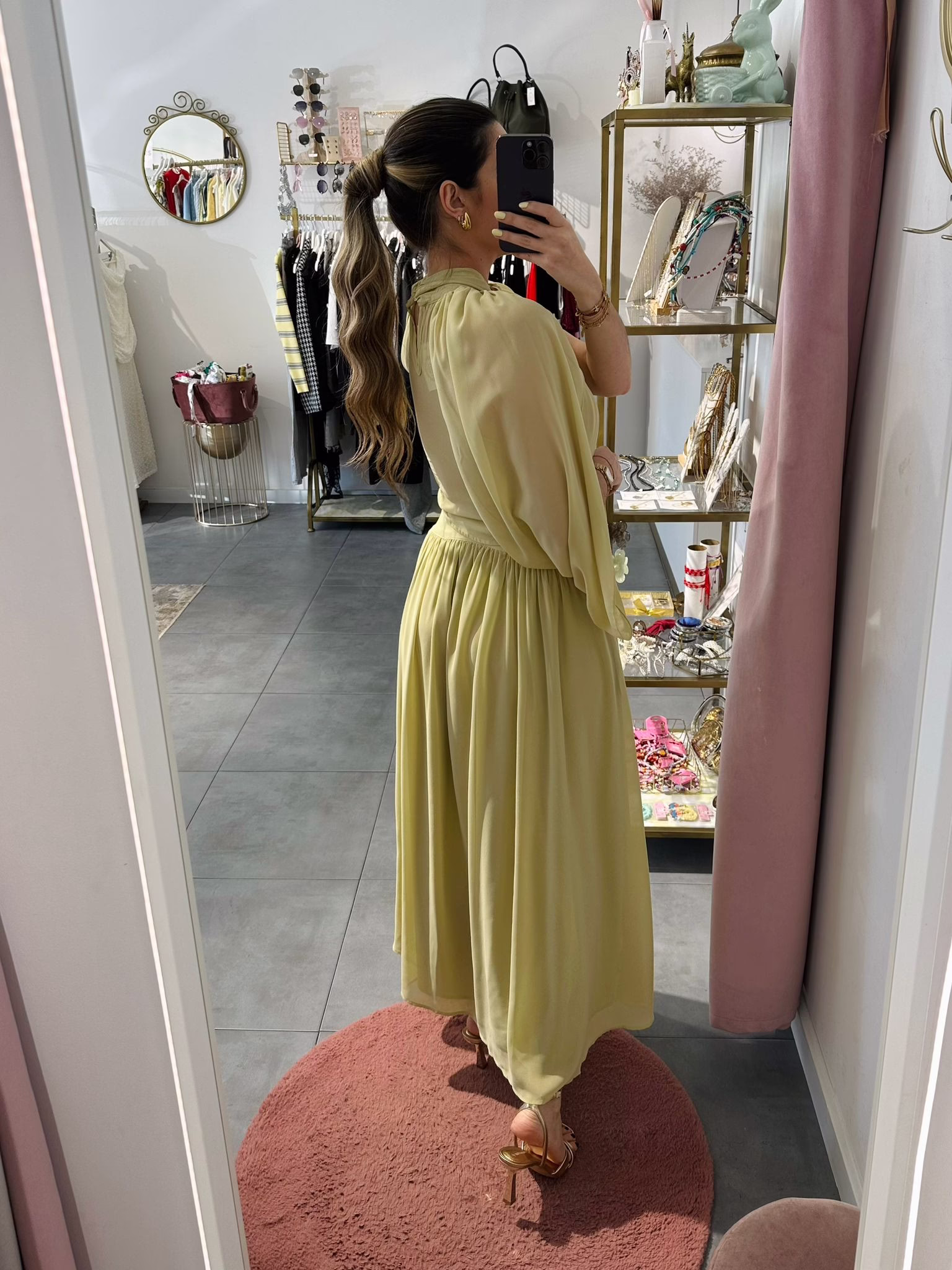 Conjunto de saia e top com mangas largas, o top tem dois acessórios em dourado na zona do pescoço, ambas as peças apertam com fecho invisível.