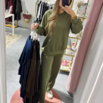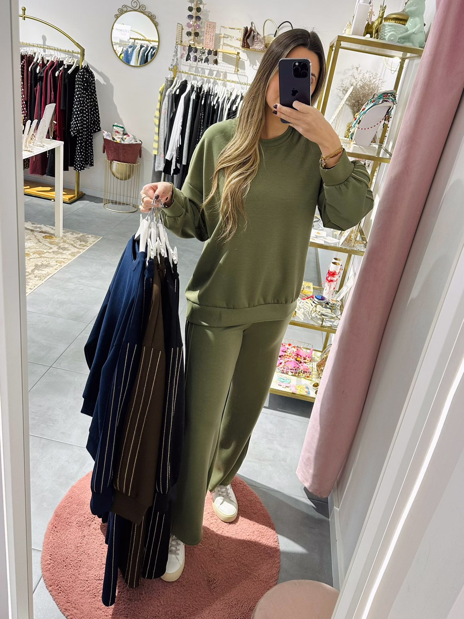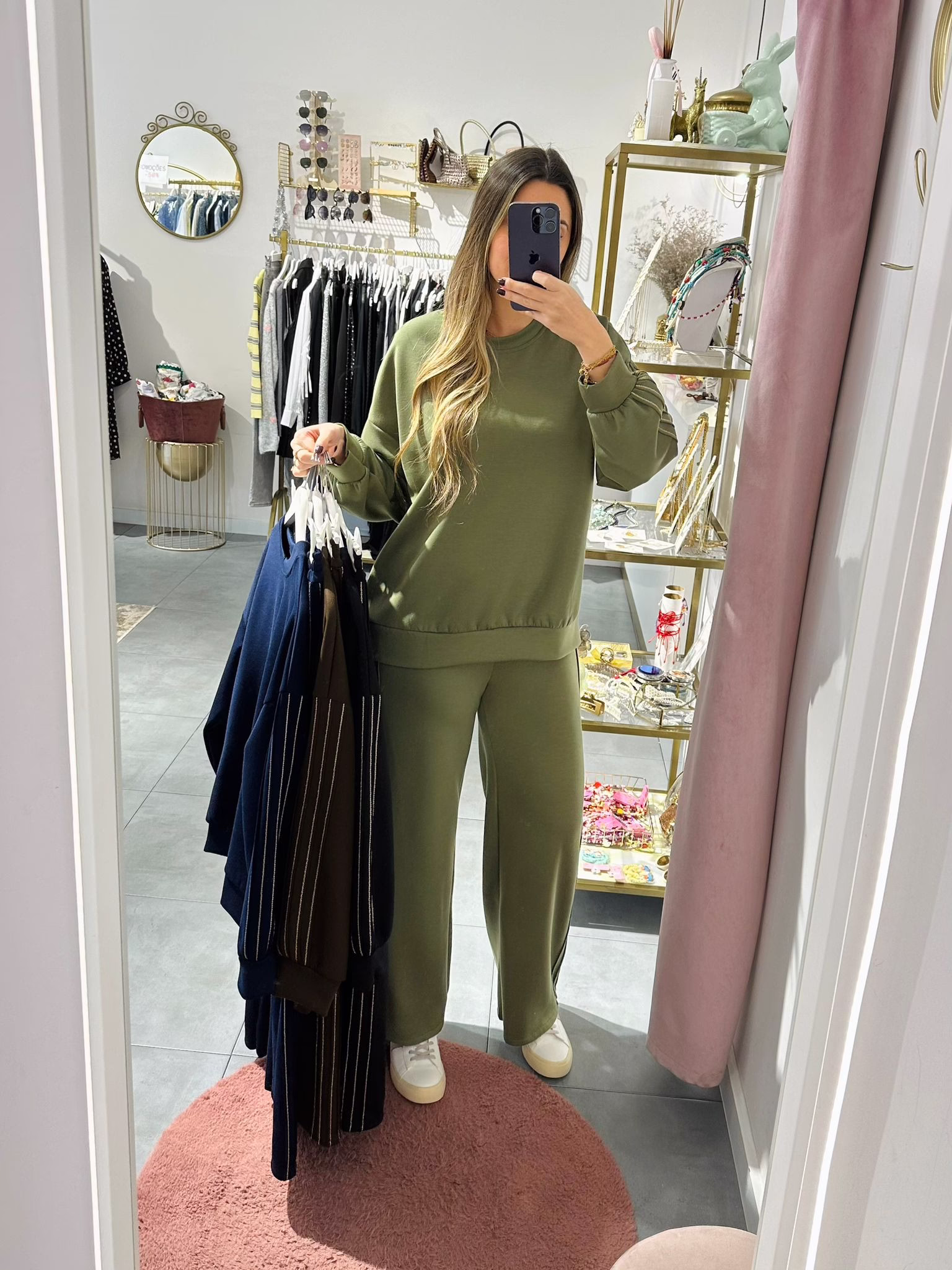 Conjunto de camisola e calças, a camisola é oversze, as calças são wid leg e tem elástico na cinta.