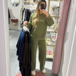 A modelo tem 1,73m e veste o tamanho M/L parte de cima e um 38/40 de parte de baixo.