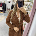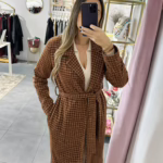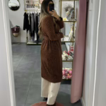 A modelo tem 1,73m e veste o tamanho M/L parte de cima e um 38/40 de parte de baixo.