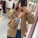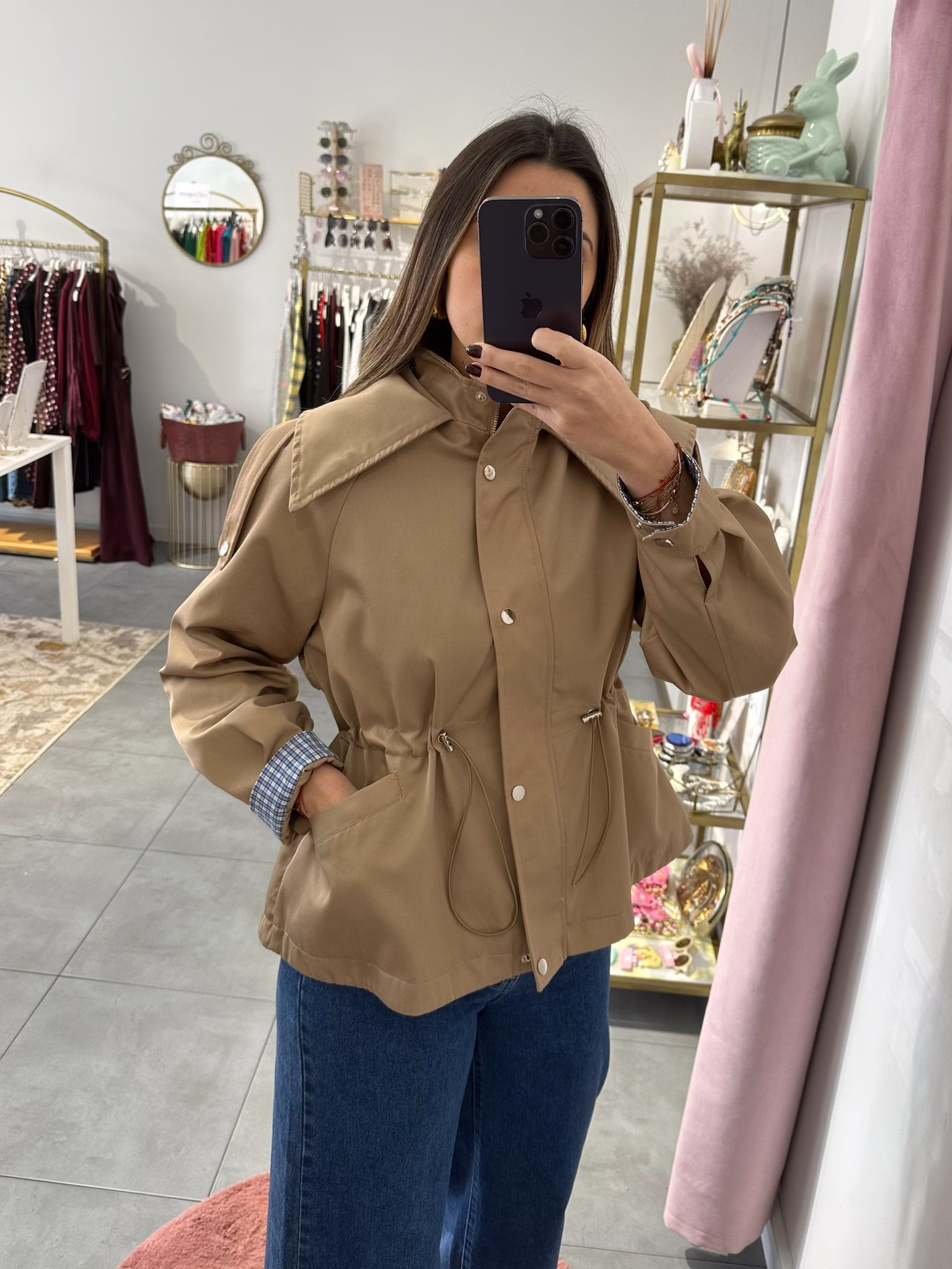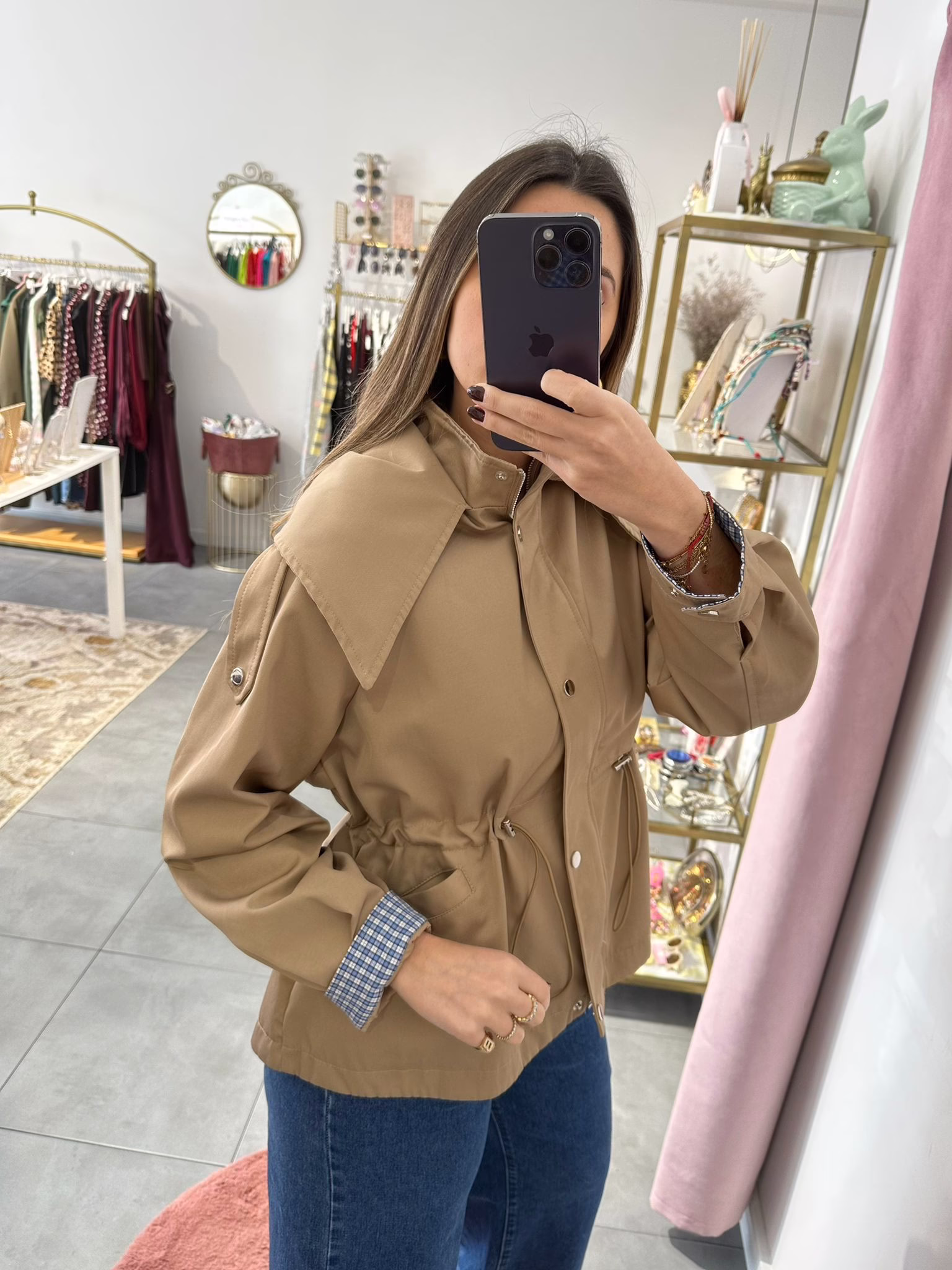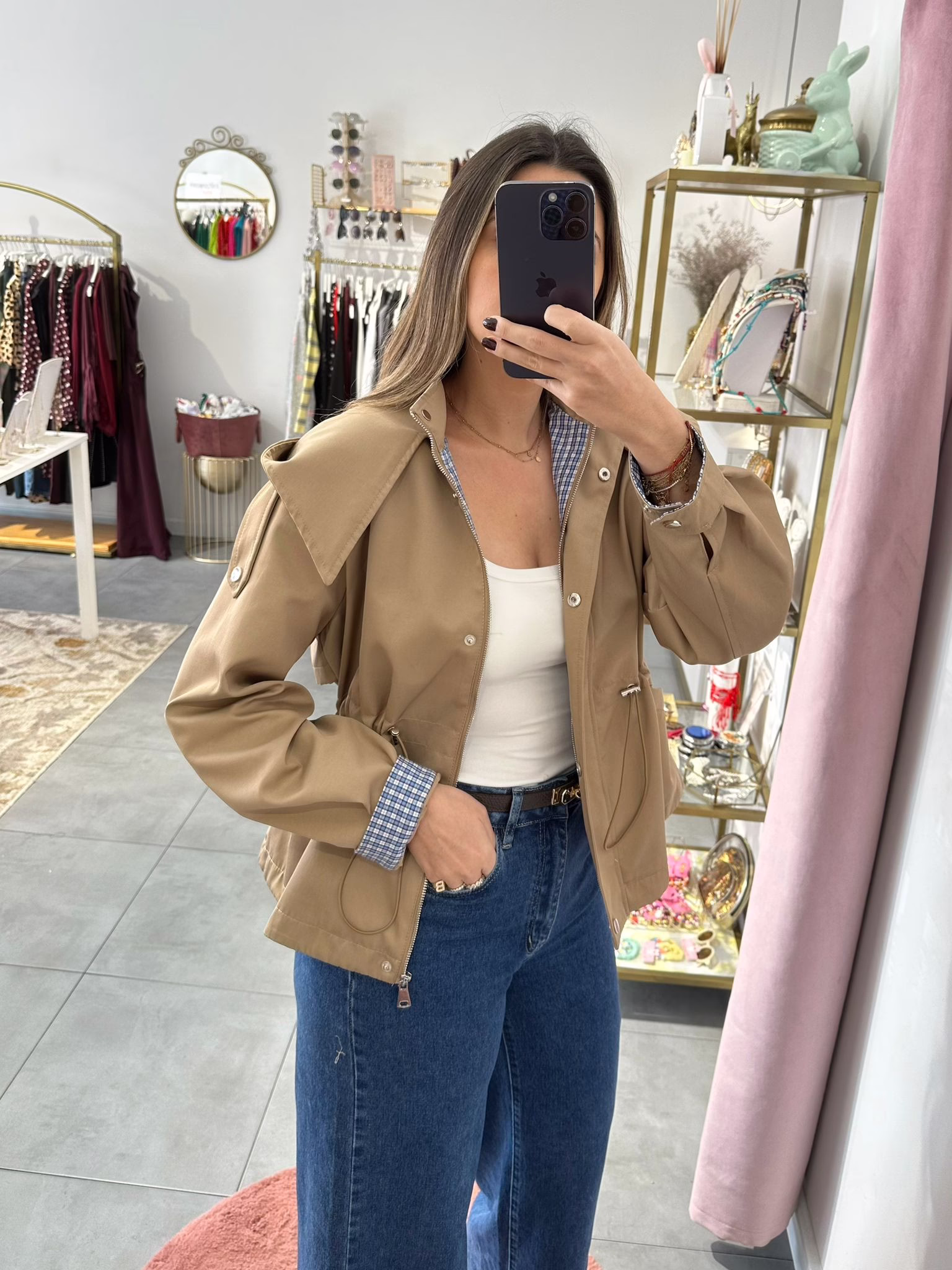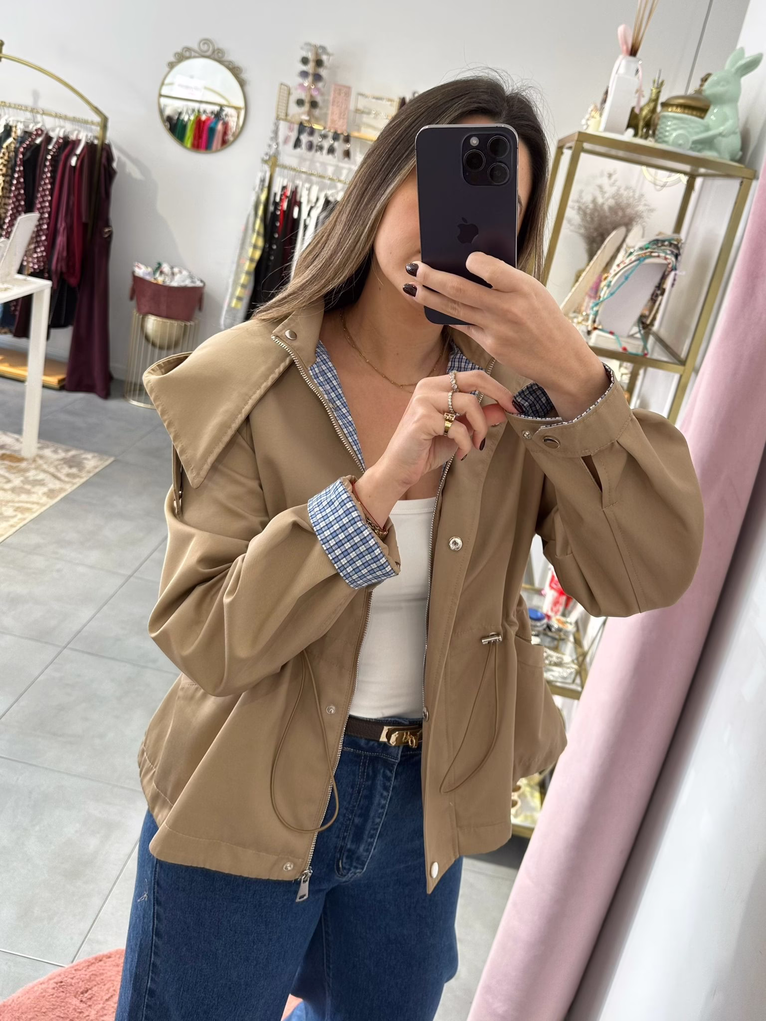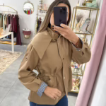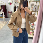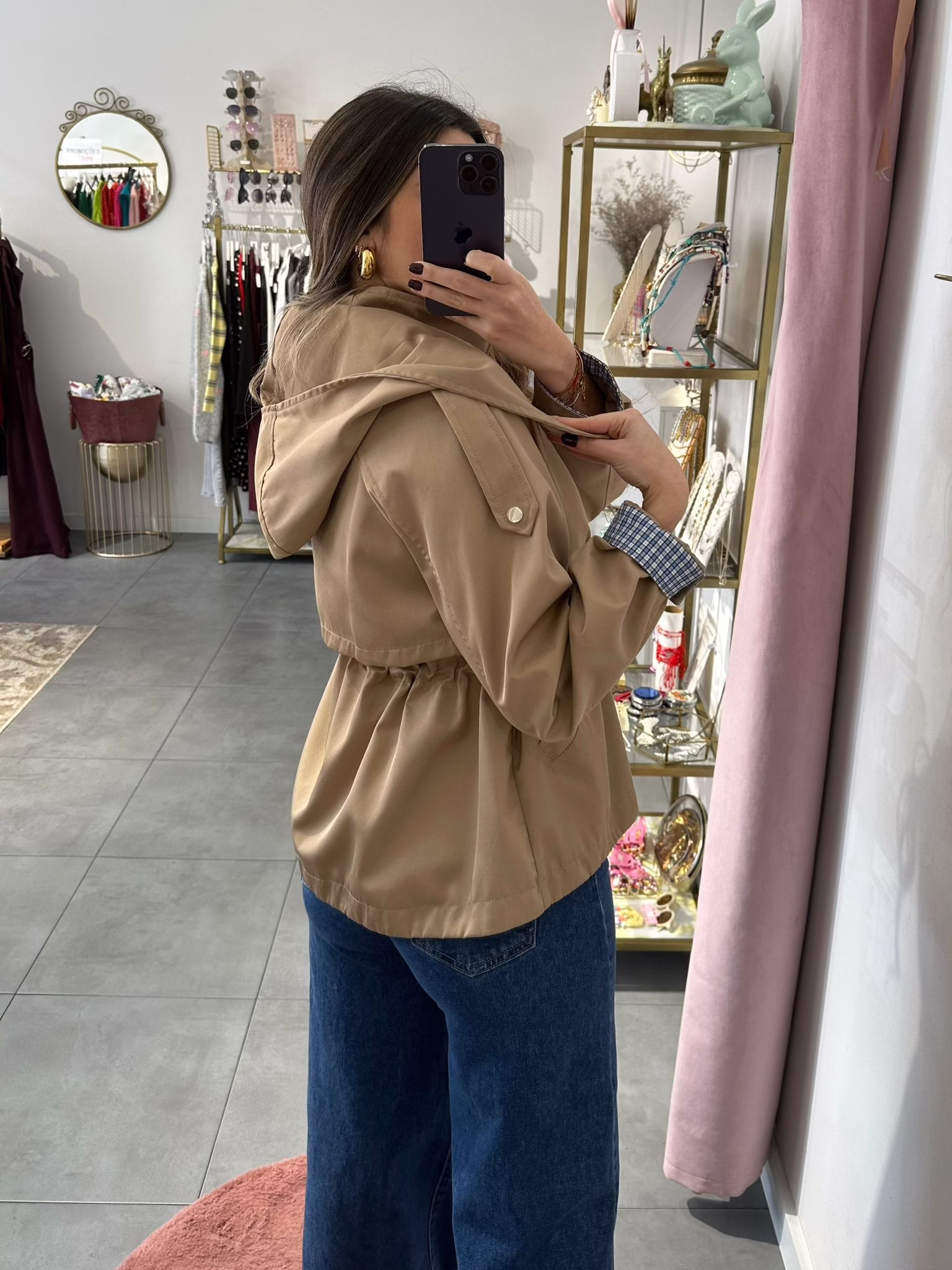 Gabardine curta com elástico na cintura, tem bolsos e capucho. O forro é em xadrez azul e branco.